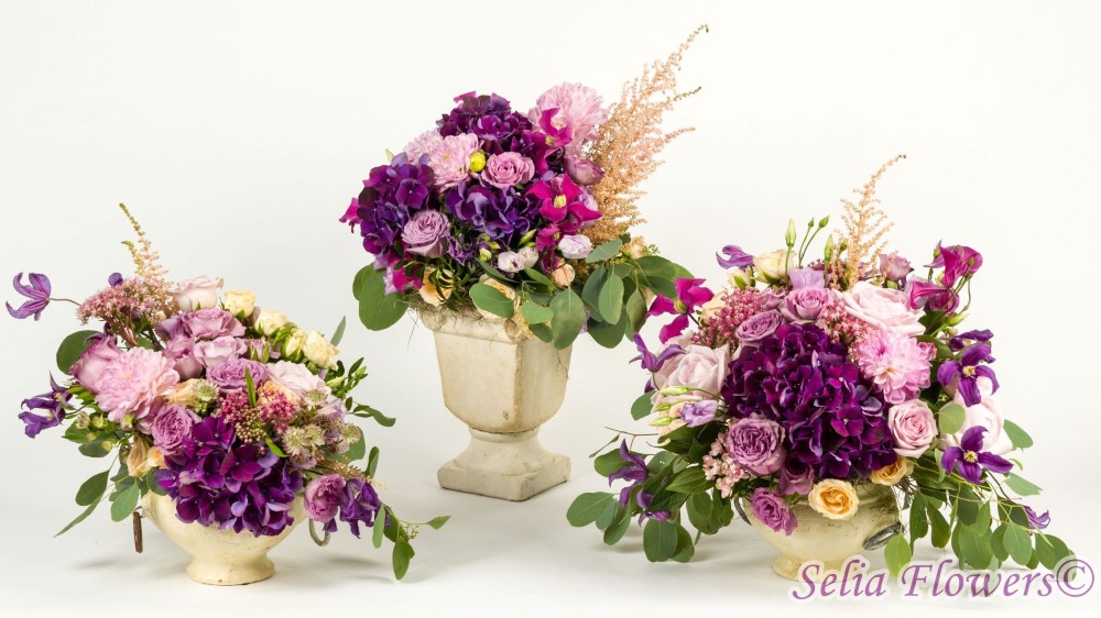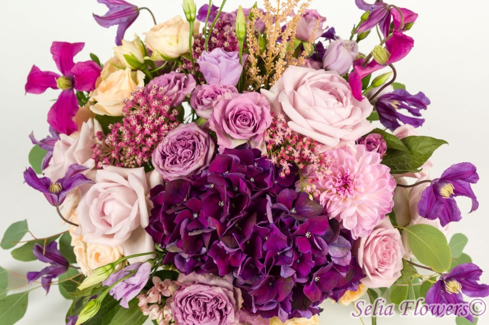 Compozitie: hydrangea, clematis, trandafiri, trandafiri tros, sedum, astrantia, astilbe, verdeata