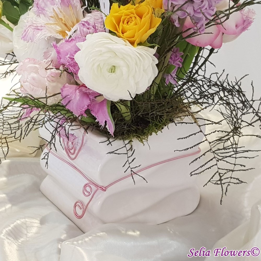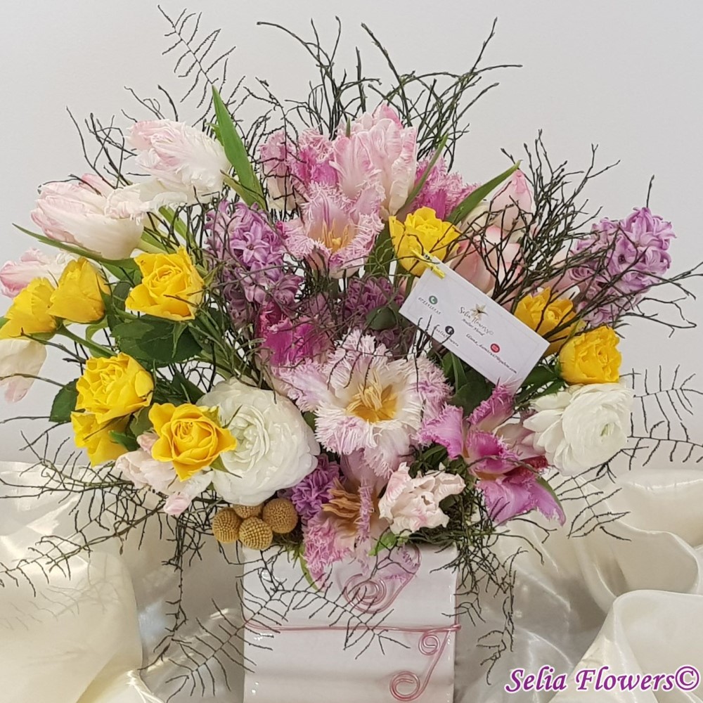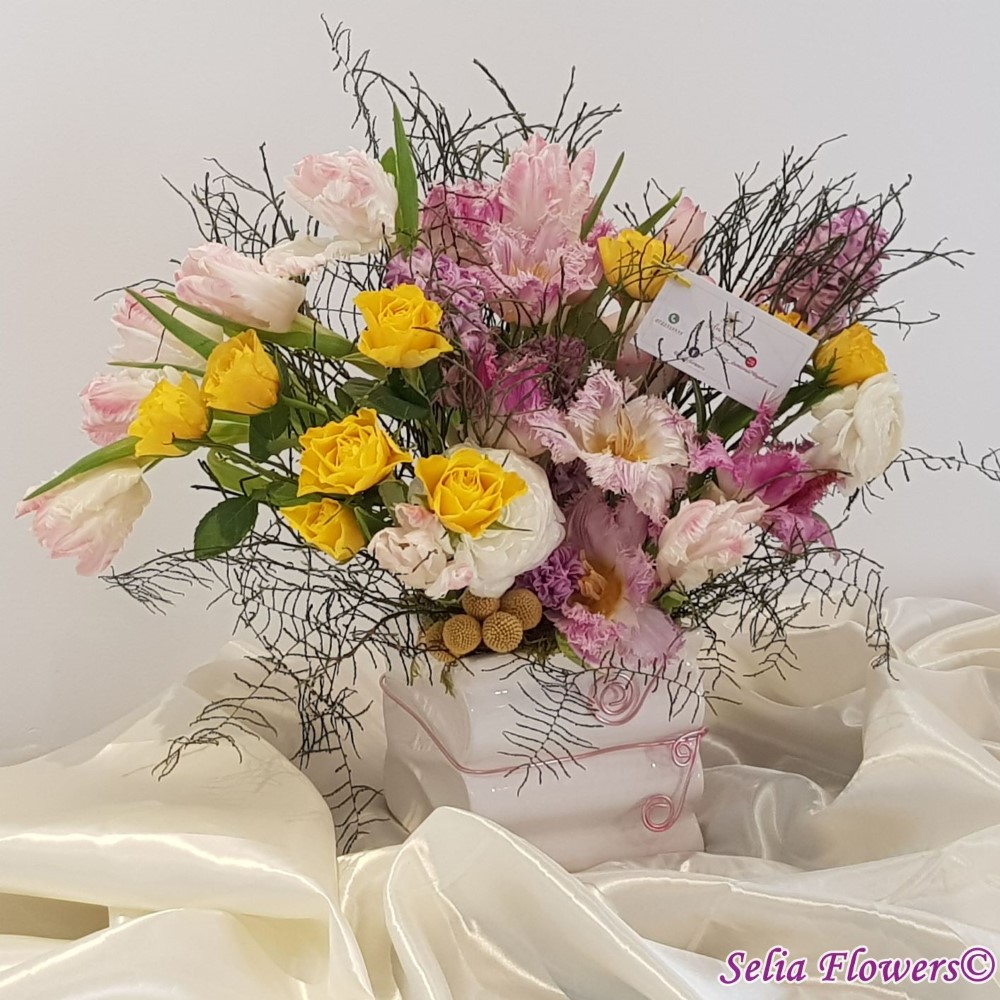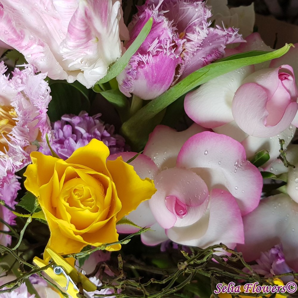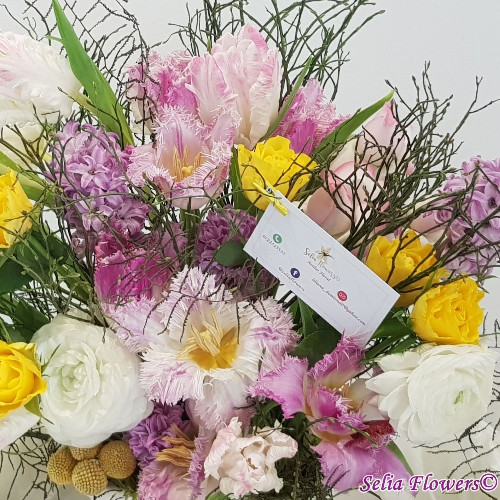 Un aranjament vesel si parfumat, realizat cu lalele, zambile, trandafiri, heidelbeer, koralfern, accesorii din sarma floristica decorativa.