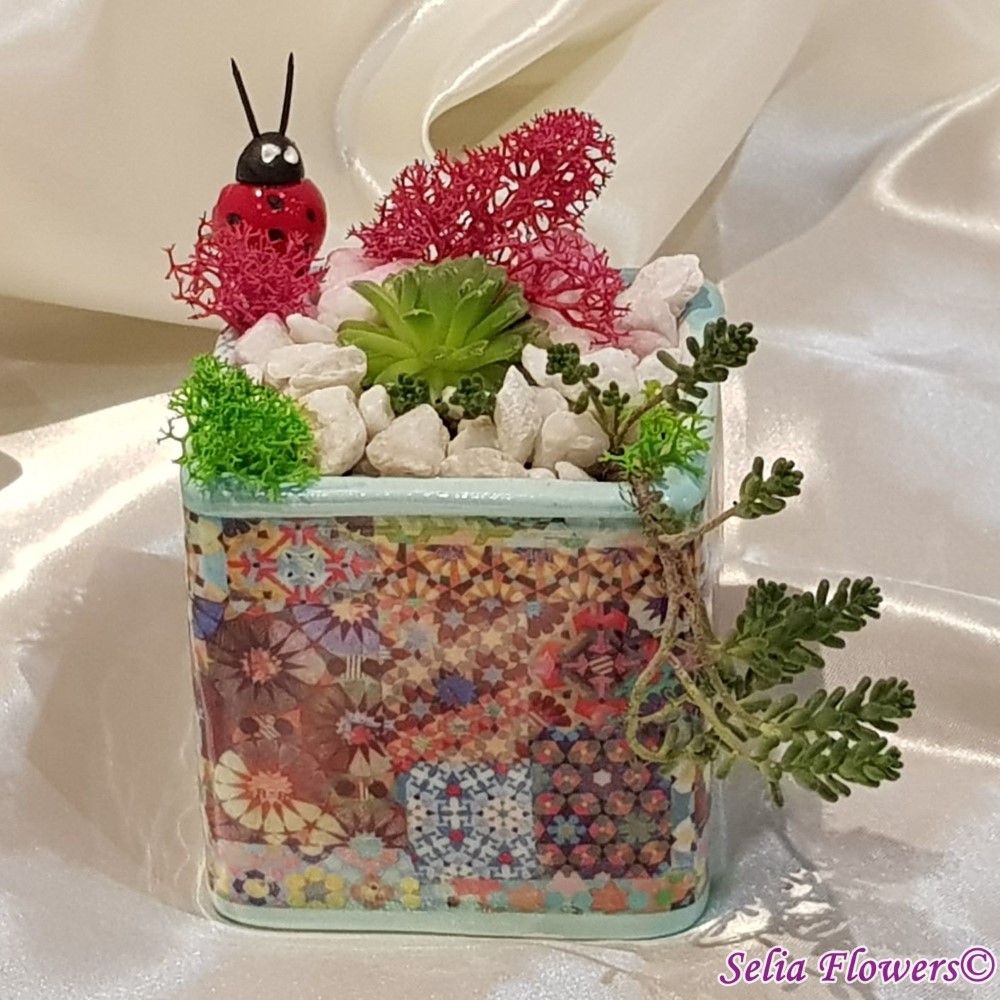 Martisor floral cu plante suculente, licheni stabilizati, accesorii, pietricele din marmura decorativa. Este construit in vas ceramic cu model, tip cub (inaltimea vasului 8 cm).