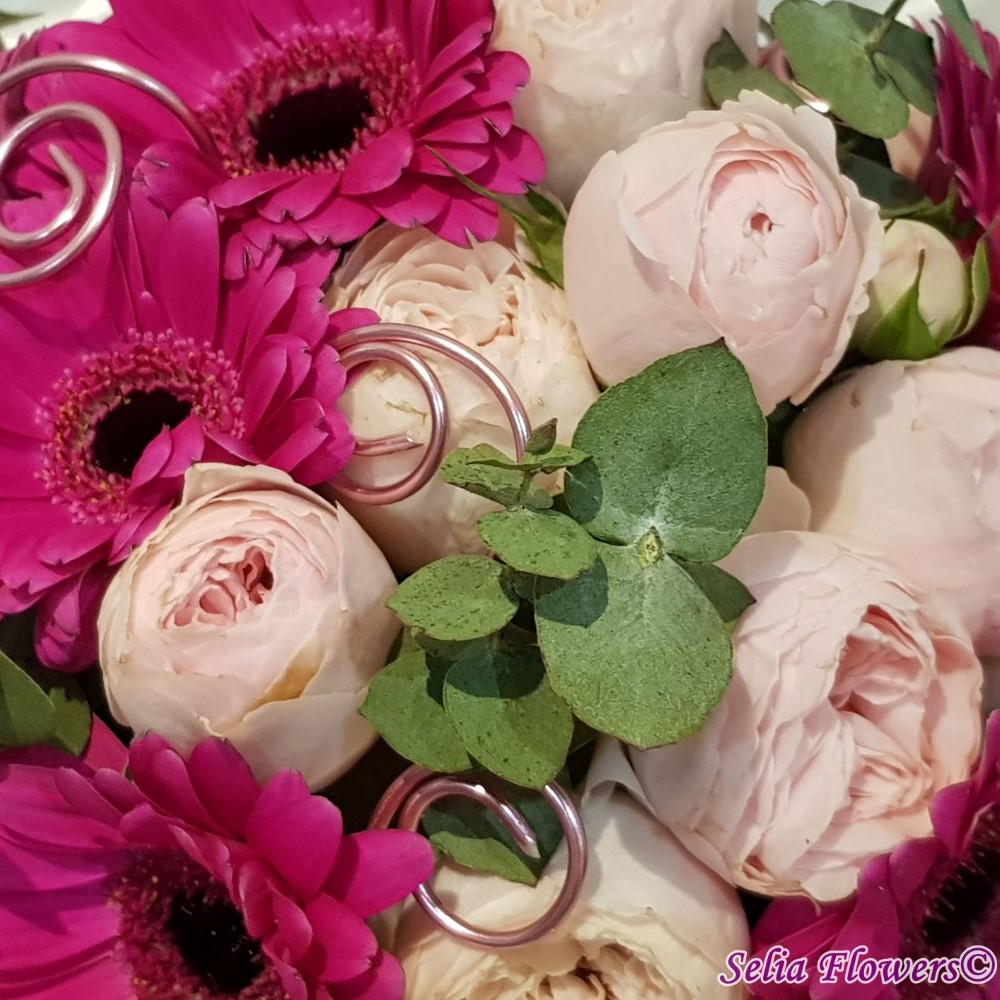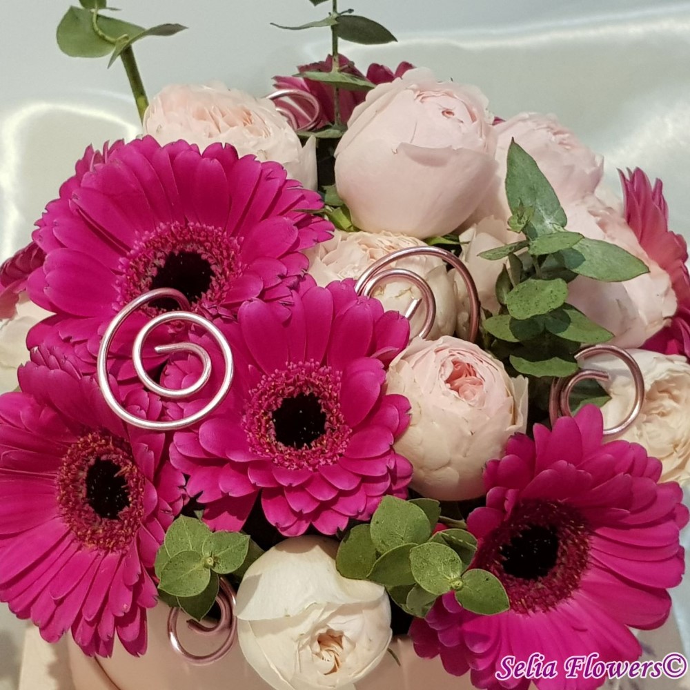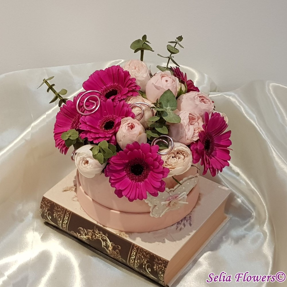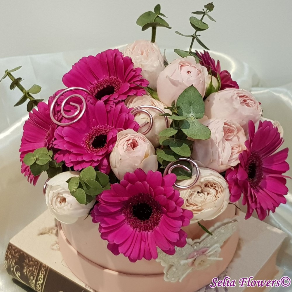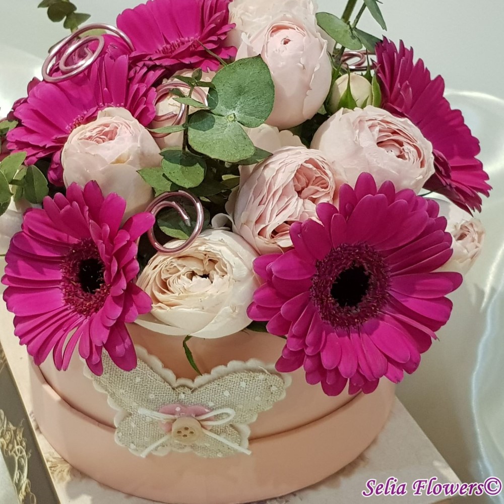 Aranjament in cutie realizat cu tros roses, germini, eucalypt, accesorii din sarma floristica decorativa si fluturas.