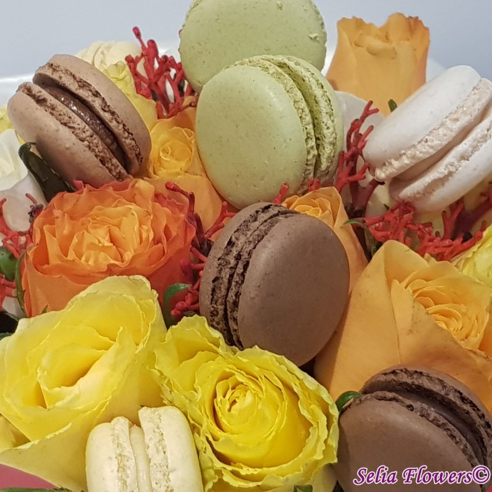 Un aranjament delicios, construit intr-o cutie tip joben, dintr-un mix de trandafiri in doua culori si o selectie de macarons.