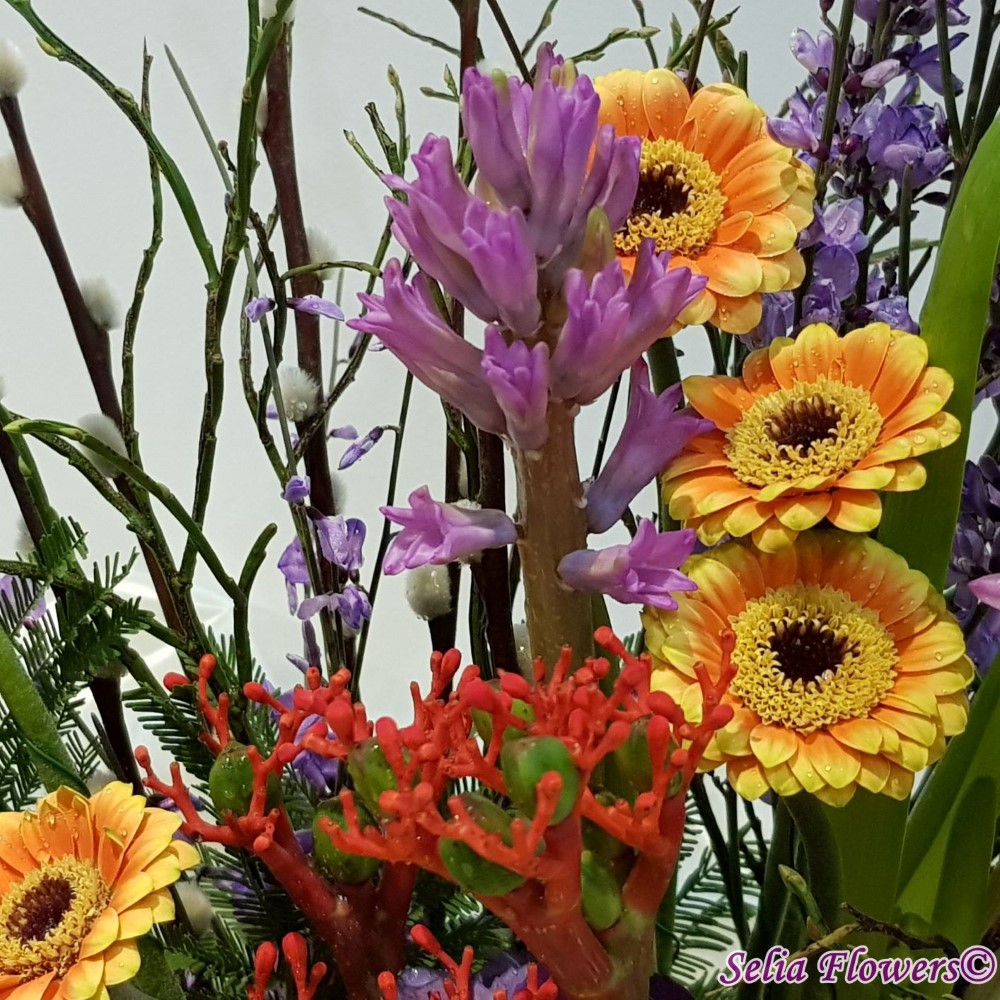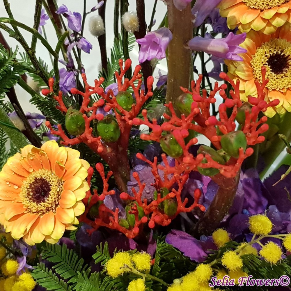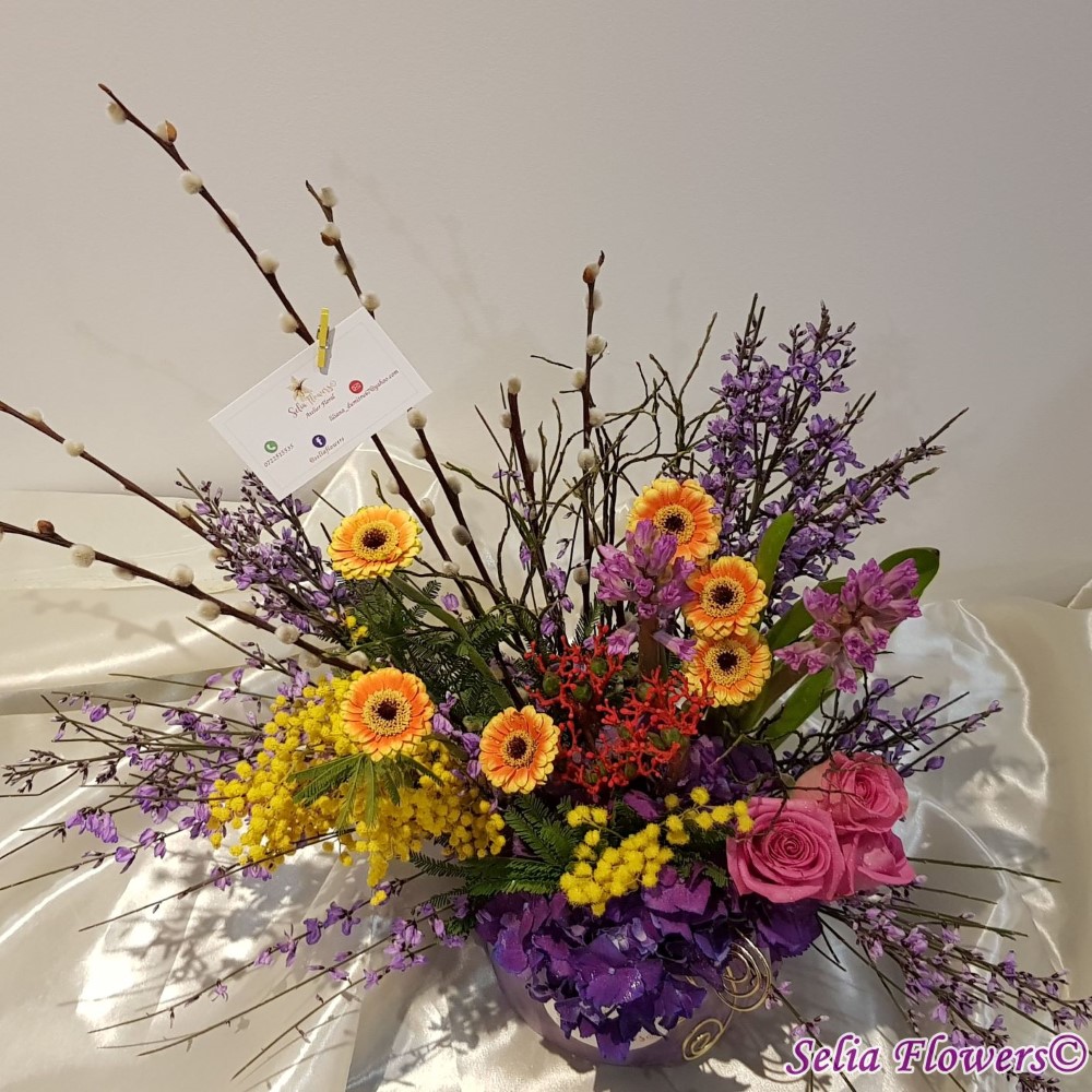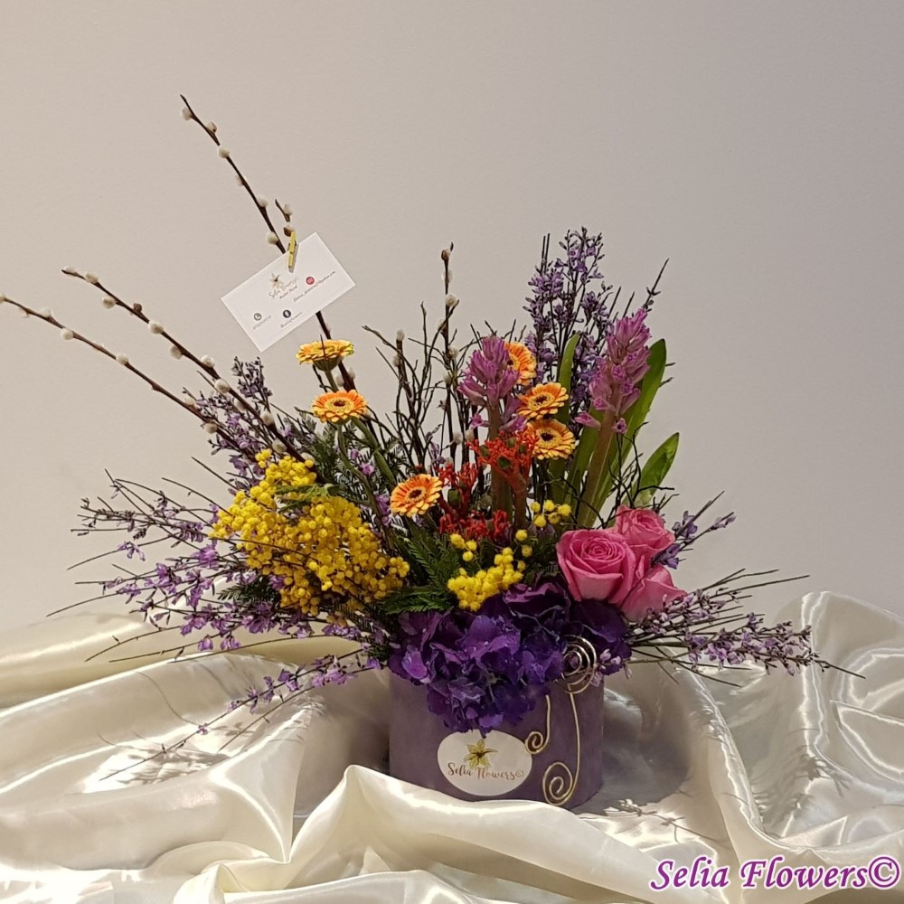 Un aranjament vesel si plin de culoare si parfum, construit in cutie de catifea, dintr-un mix de flori: trandafiri, hydrangea, zambile, genista, germini, salix si accesorii din sarma floristica decorativa.