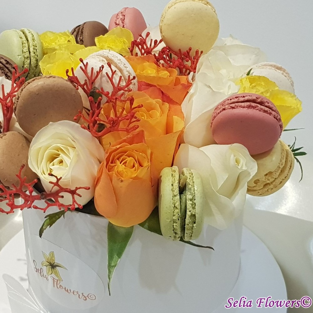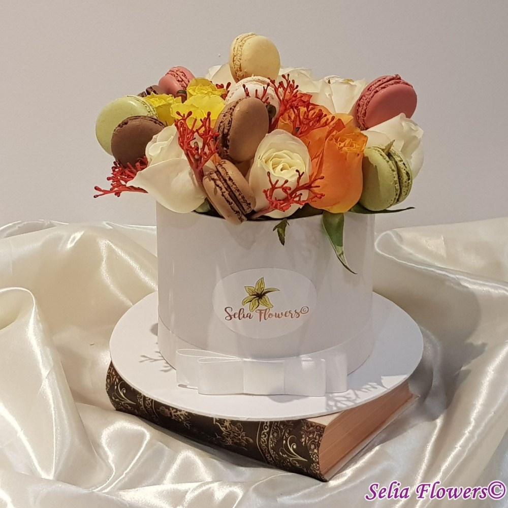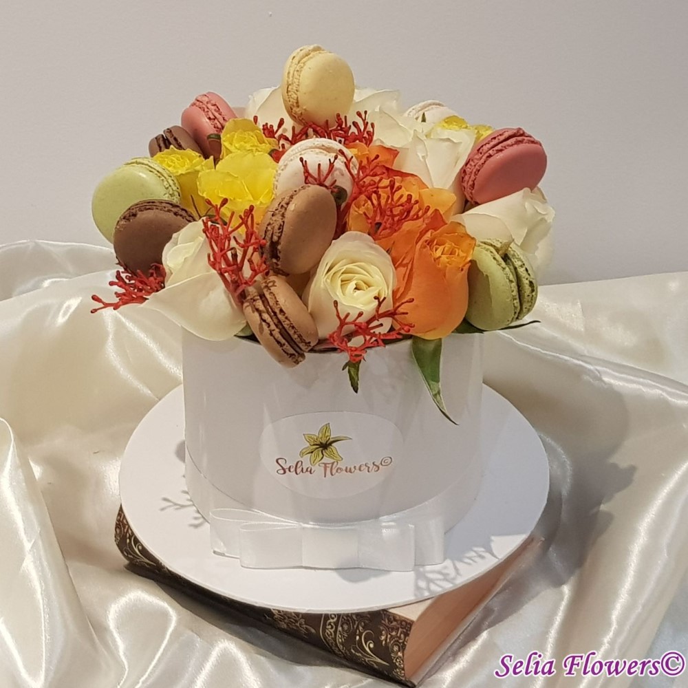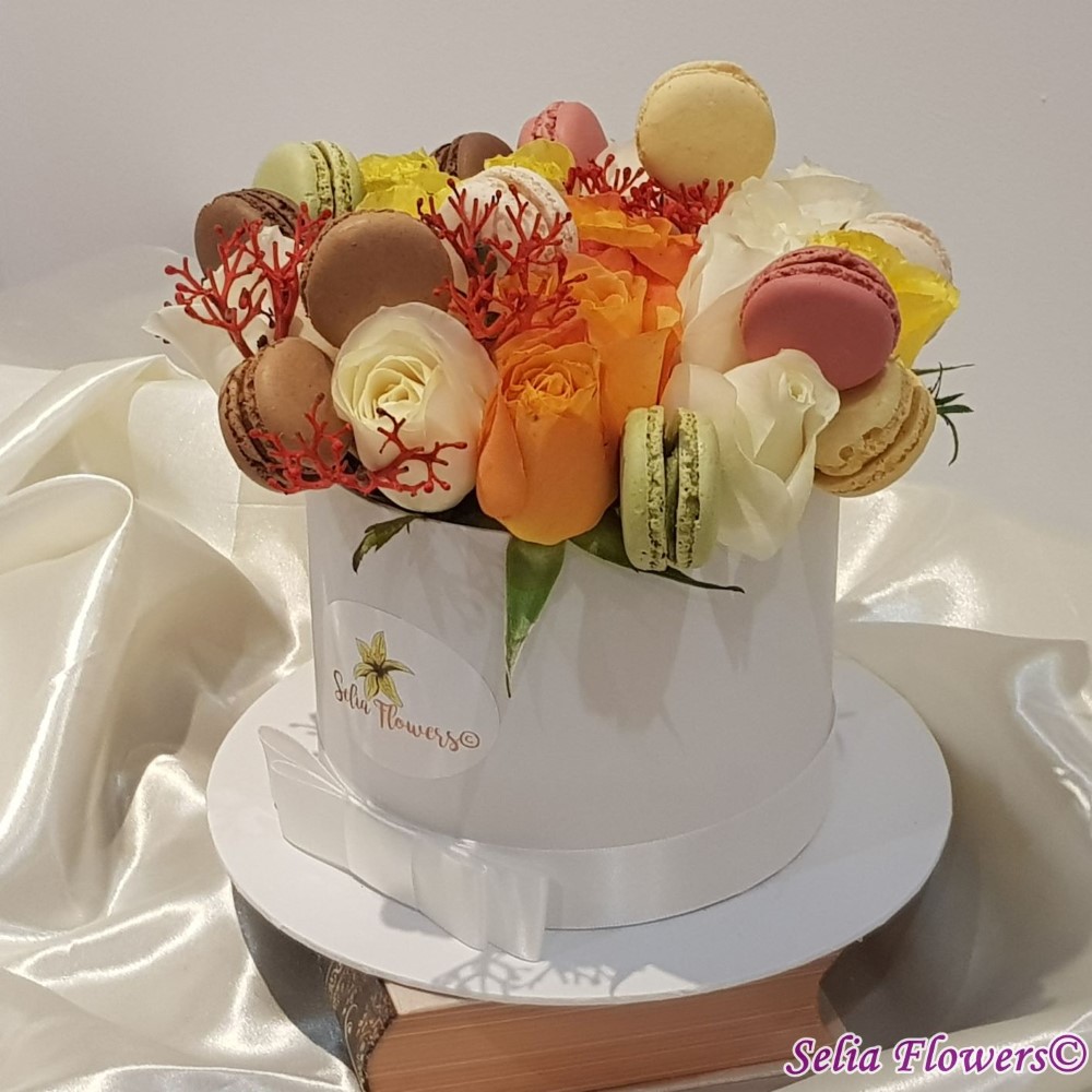 Un aranjament vesel si delicios, construit intr-o cutie tip joben, dintr-un mix de trandafiri in doua culori, jatropha si o selectie de macarons.