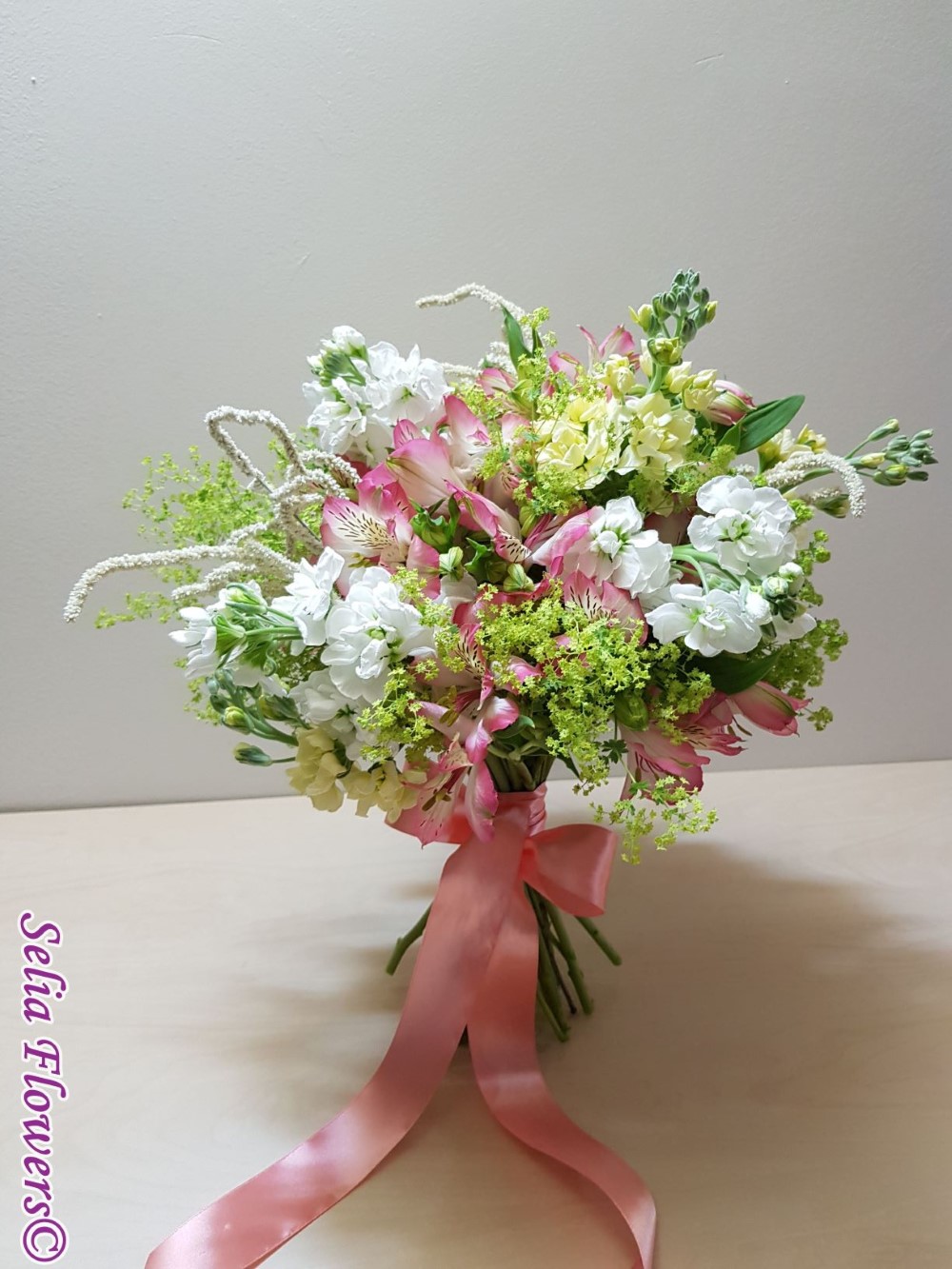 Un buchet vesel, invaluit de miresme delicate, realizat din mathiola, alstroemeria si amaranthus.