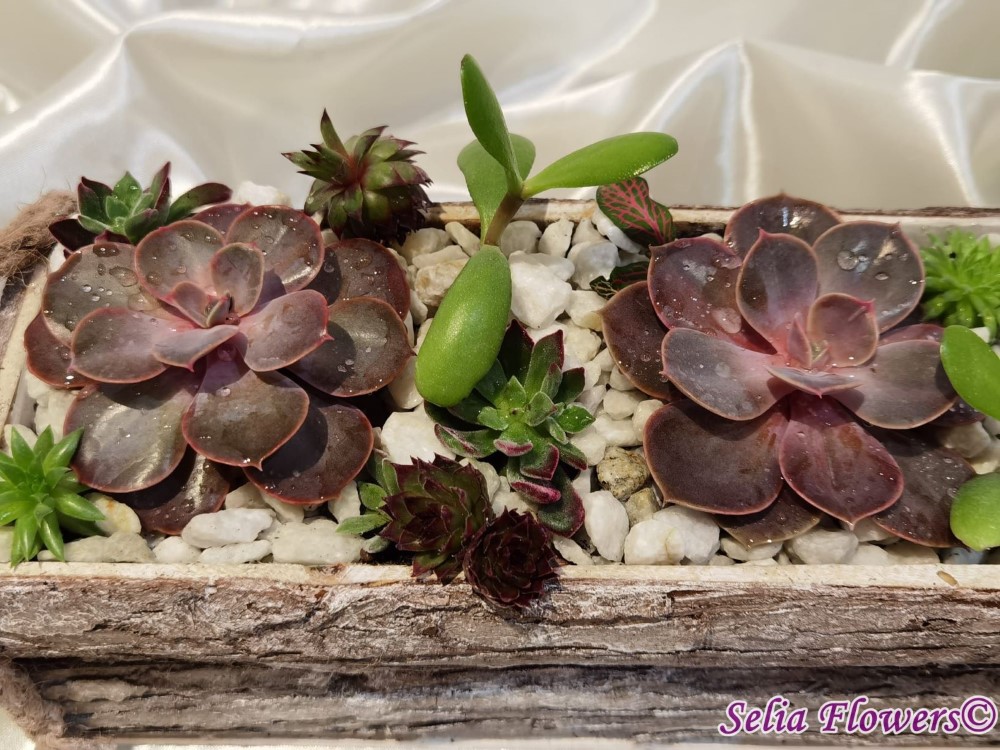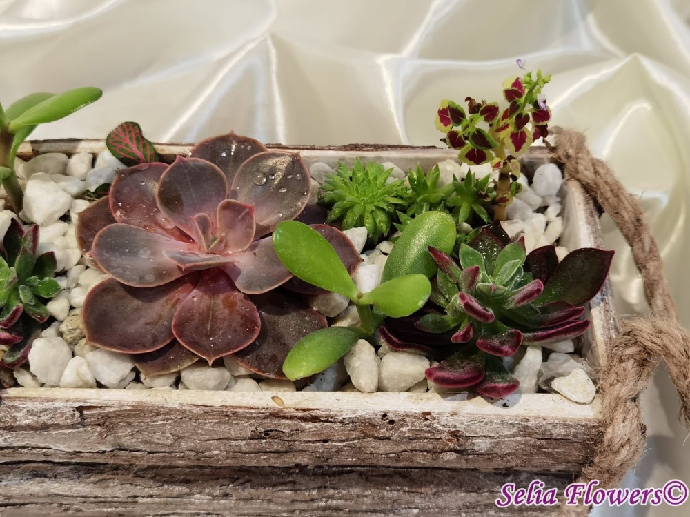 O gradina vesela in miniatura construita in vas din scoarta de copac dintr-un mix de plante suculente. Aranjamentul este decorat cu pietricele de marmura decorativa Este un aranjament vesel, decorativ si deloc pretentios. Daca adori calatoriile sau esti plecat mai mult timp de acasa, reprezinta florile ideale, deoarece rezista destul de mult timp fara sa fie udate.