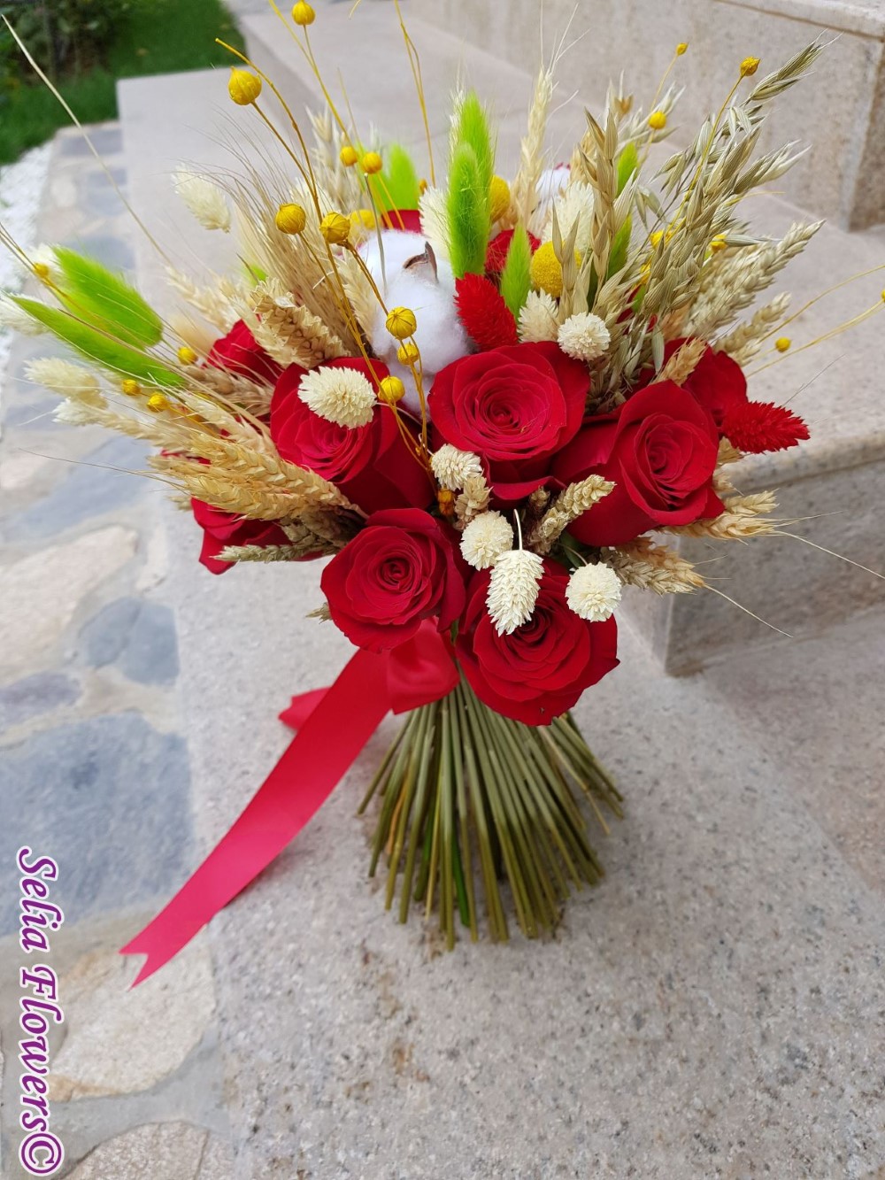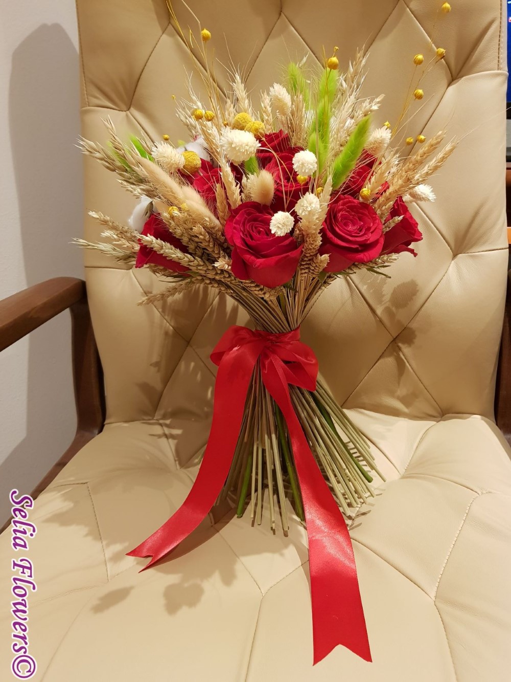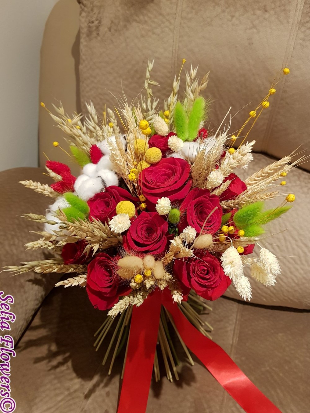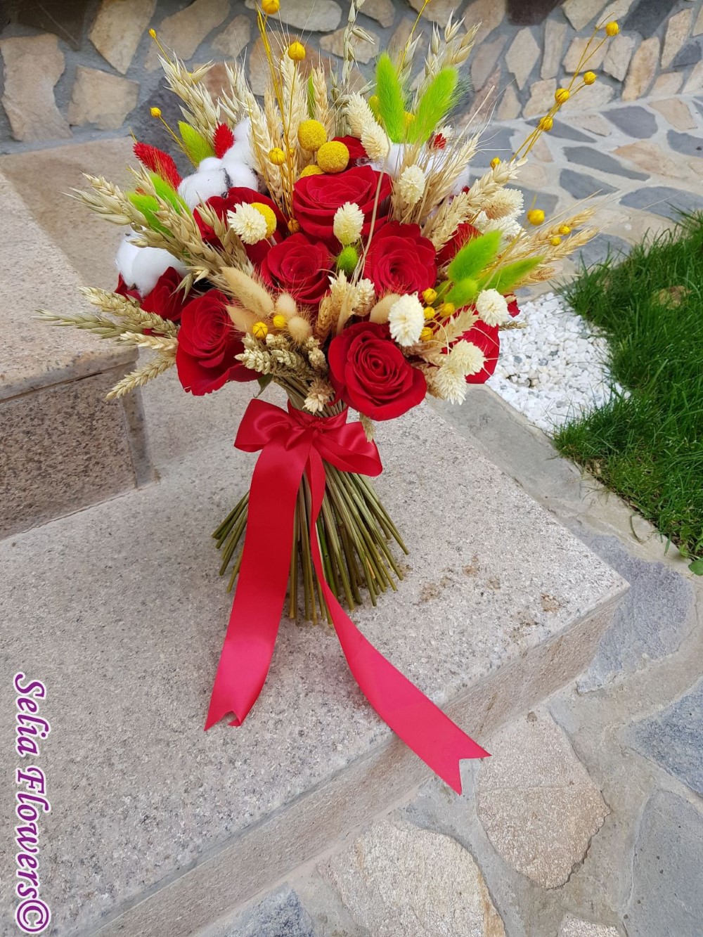 Un buchet vesel, optimist si plin de semnificatii. Este construit din trandafiri rosii, care exprima cel mai bine sentimentele de dragoste si pretuire, spice de grau care semnifica belsug si prosperitate si delicate flori albe de bumbac care, alaturi de alte flori, incununeaza intreg aranjamentul floral.