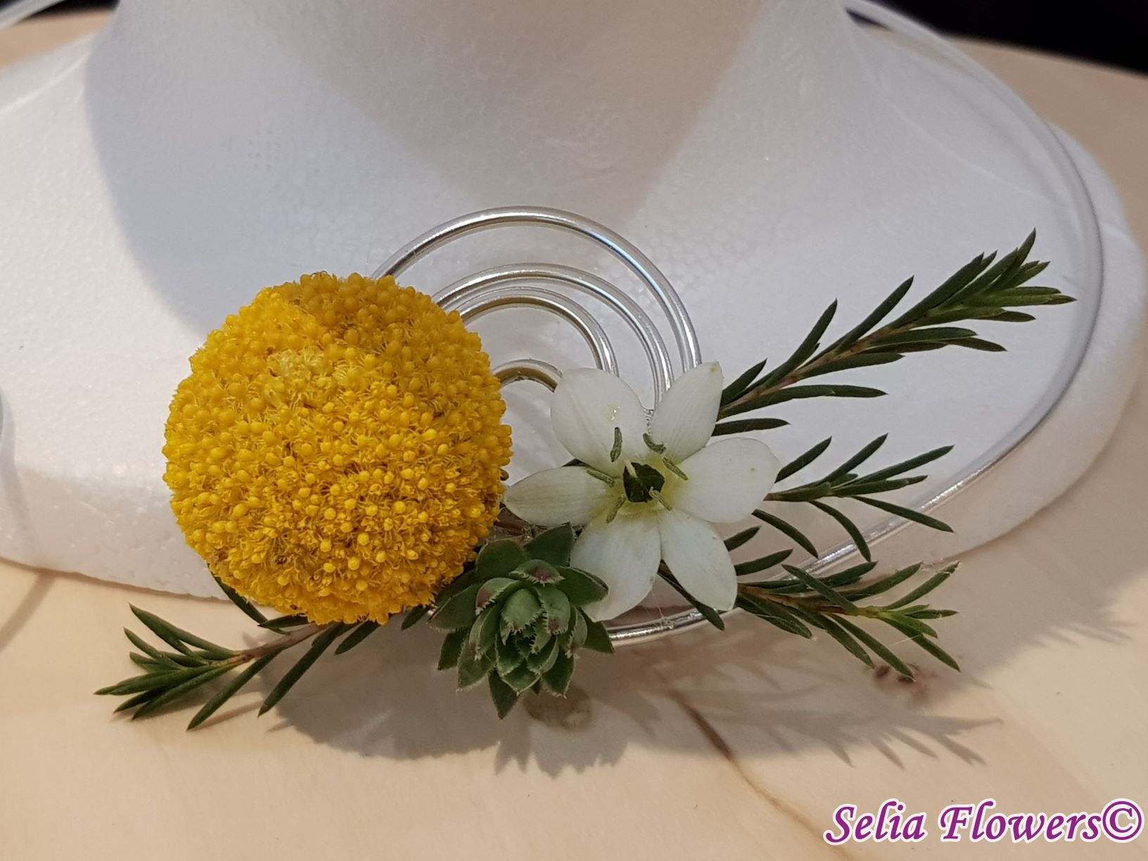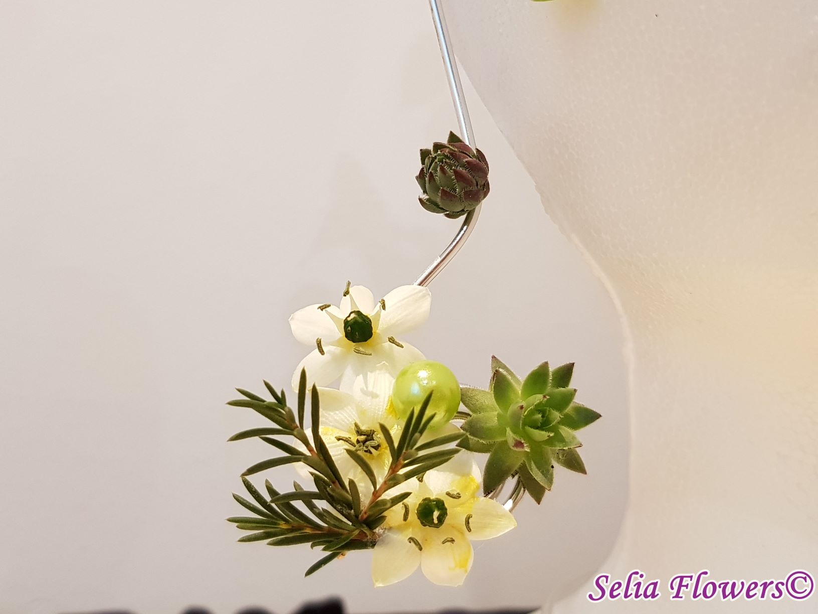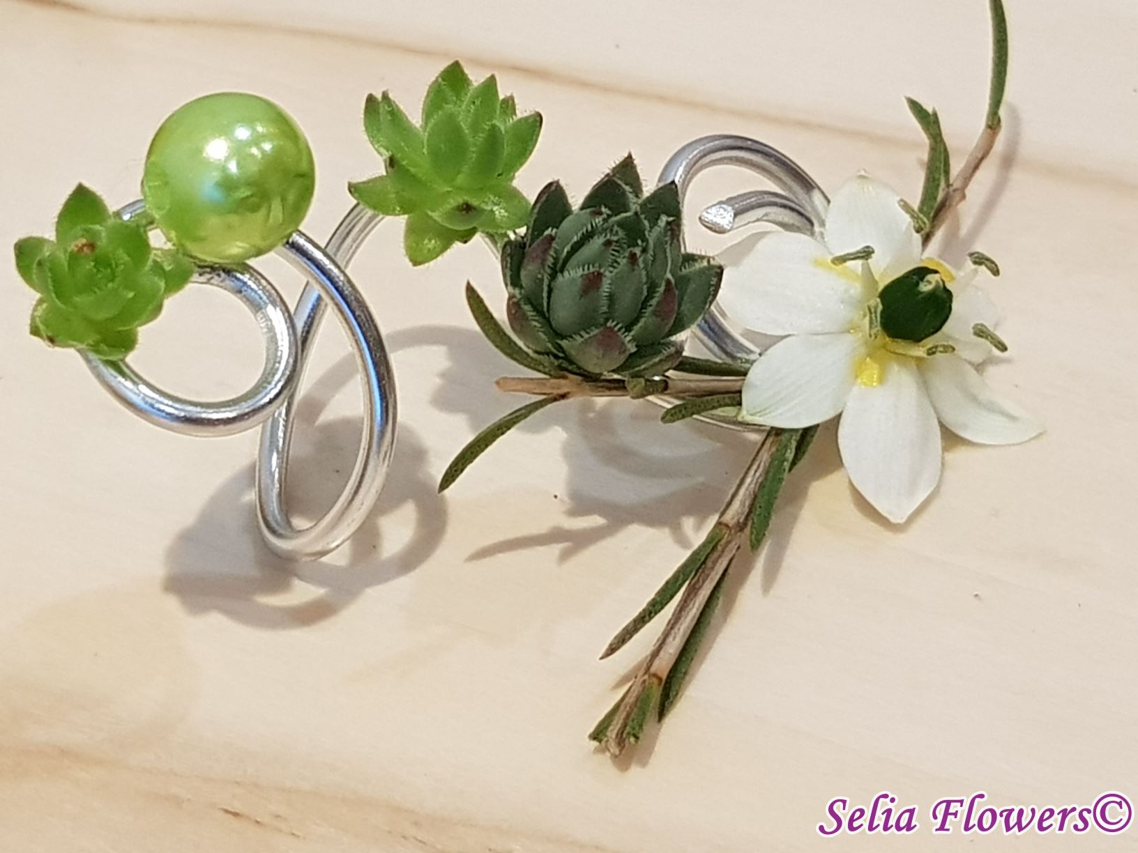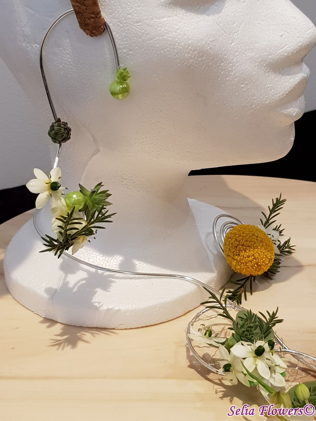 Set bijuterii handmade (colier, inel si cercel). Sunt lucrate pe o baza din sarma floristica decorativa, accesorizata cu flori naturale de ornithogalum, craspedia, wax flower, plante suculente si perle.