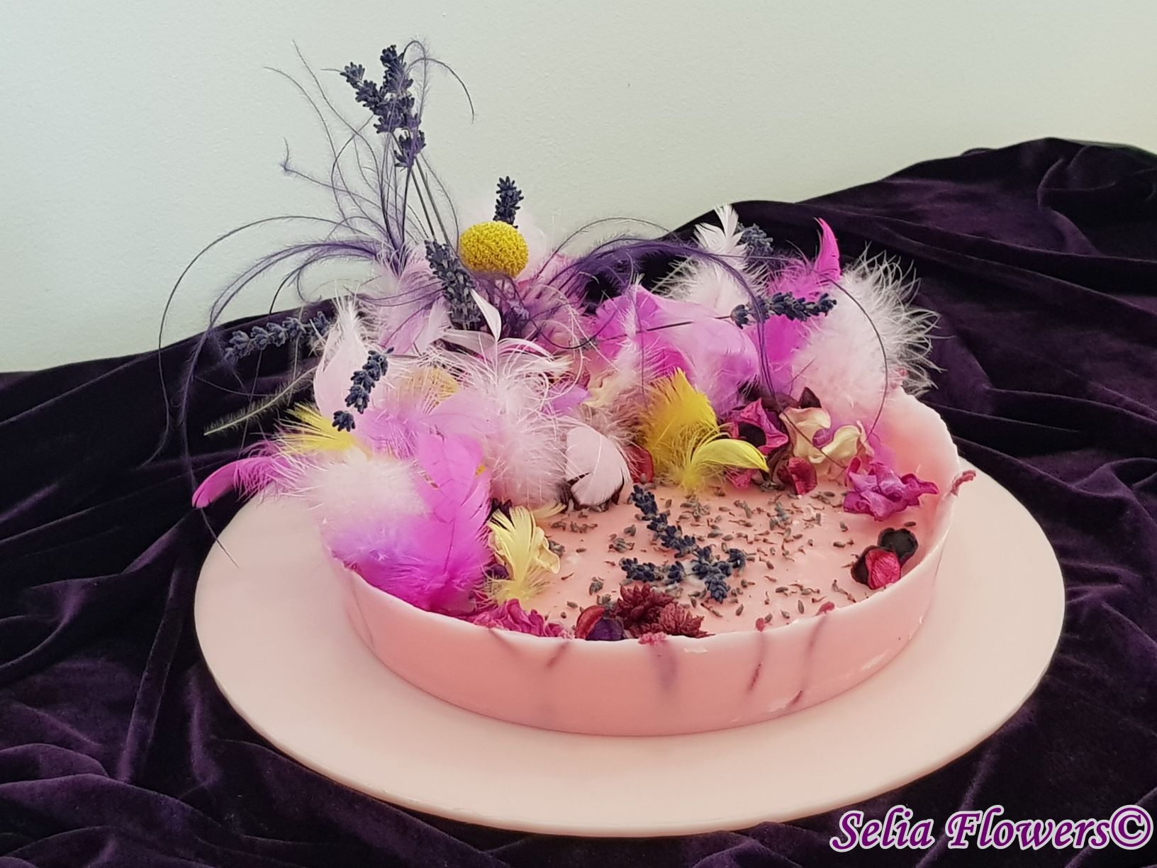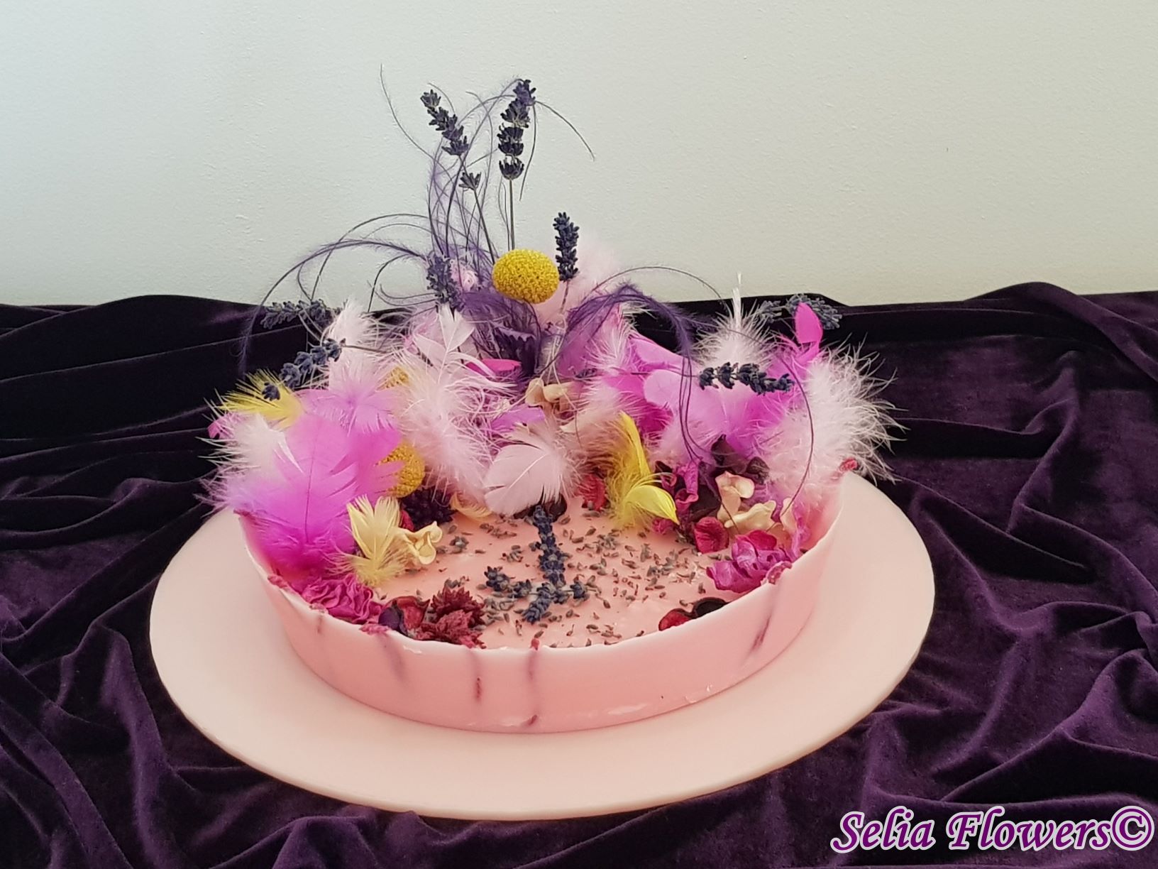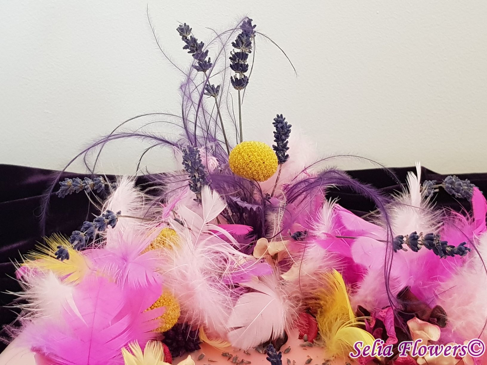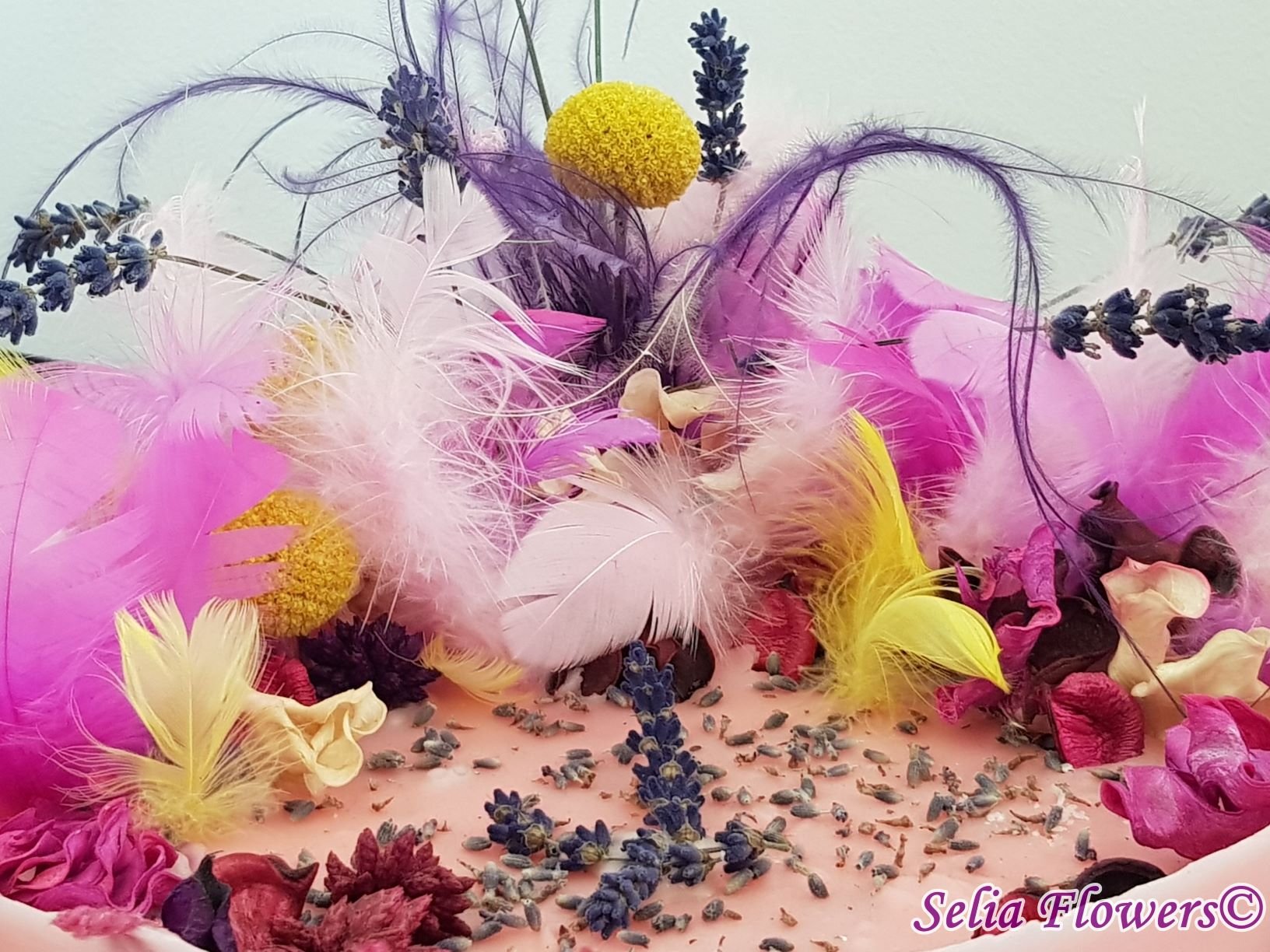 Poate fi un cadou unicat pentru cineva drag sau un decor original și elegant pentru casa ta. Diametrul vasului este de 25-26 cm, este un produs handmade realizat din ceară in atelierul nostru floral si este decorat cu flori de lavanda, craspedia, stipa, pene si flori uscate. Decorul se poate schimba în funcție de preferințe, la fel și culoarea vasului.