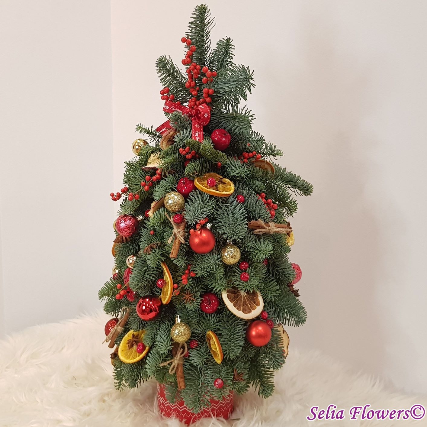 Înălțimea aranjanjamentului este de 70 cm, din care 57 cm - brăduțul construit și 13 cm este înălțimea vasului ceramic în care este realizat.