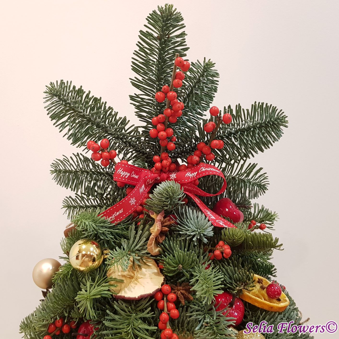 Un brăduț construit crenguță cu crenguță, un aranjament unicat construit handmade din brad Nobilis, pe suport de burete umed care asigură hidratarea crenguțelor.