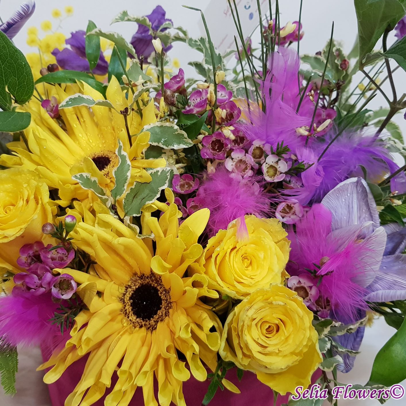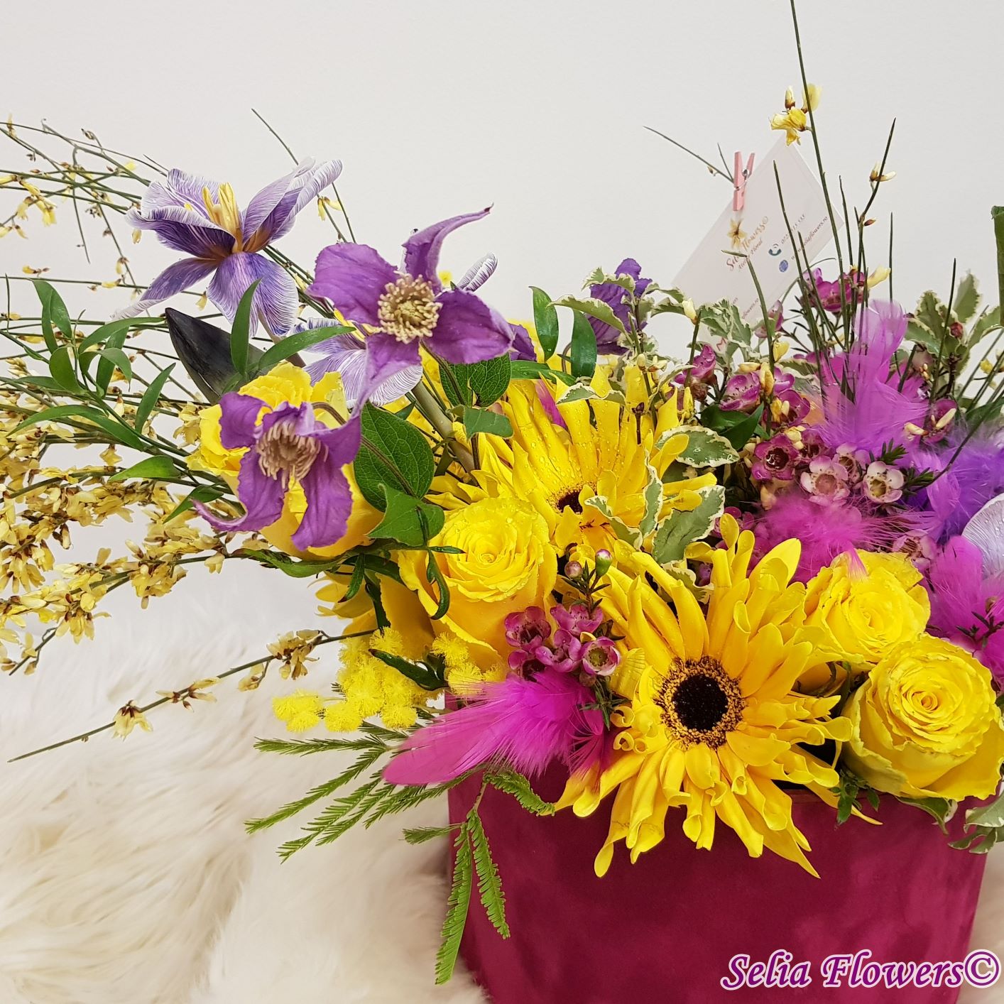 Un aranjament vesel și parfumat, construit în cutie de catifea cu flori de primăvară (lalele vip, clematite, wax flowers, germini spider, acacia, trandafiri, pittosporum nigra ) și accesorii sub formă de pene de strut colorate .