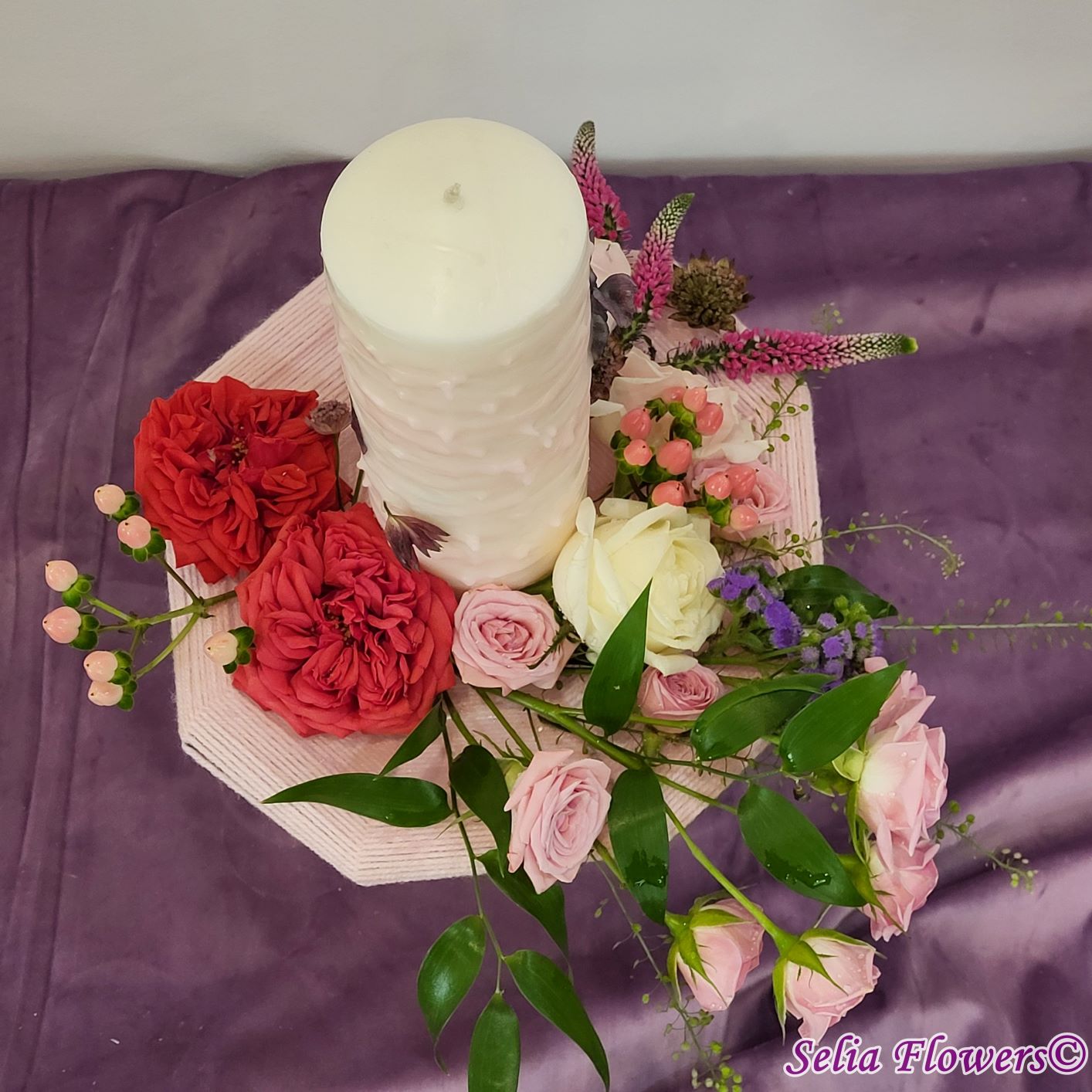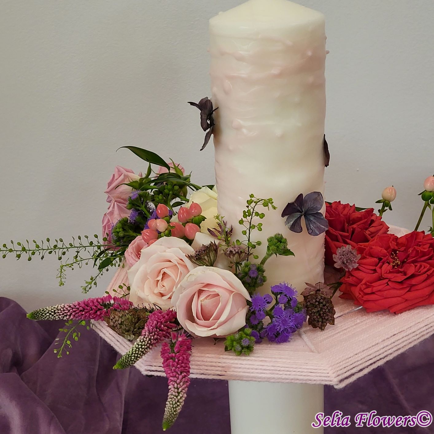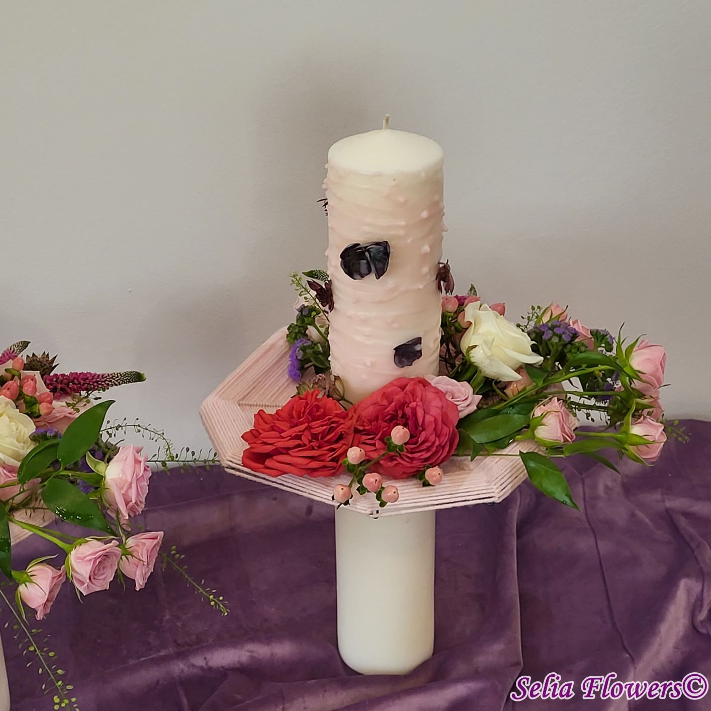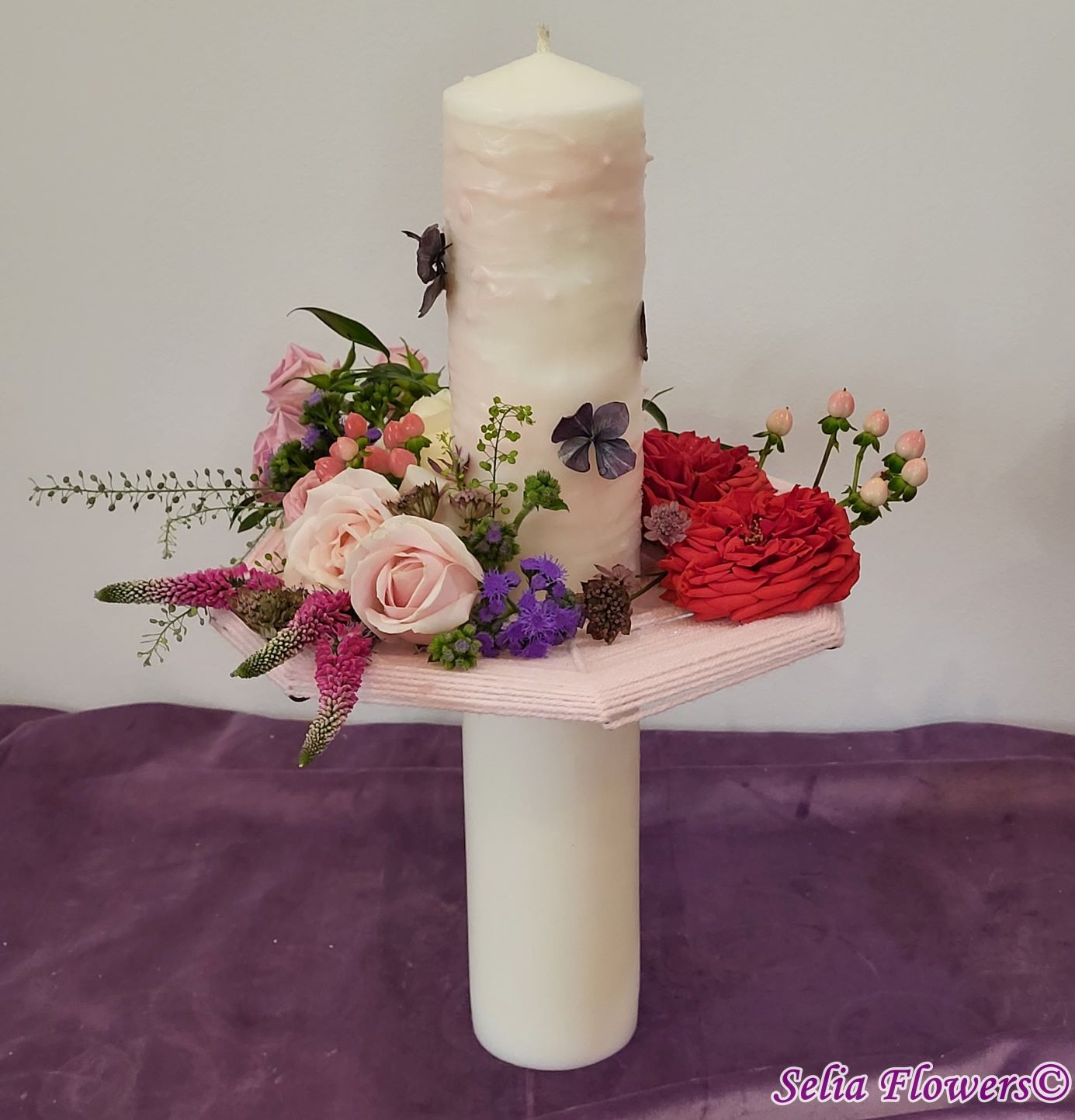 Lumânari decorate cu flori naturale cu un design realizat pe structura spider lucrată manual în atelierul nostru.