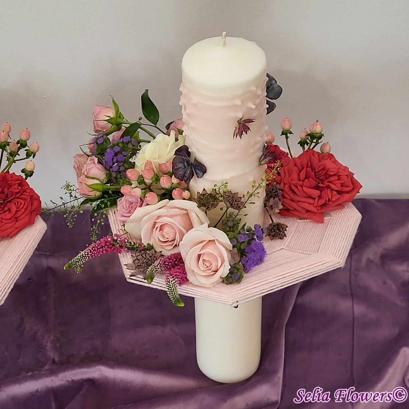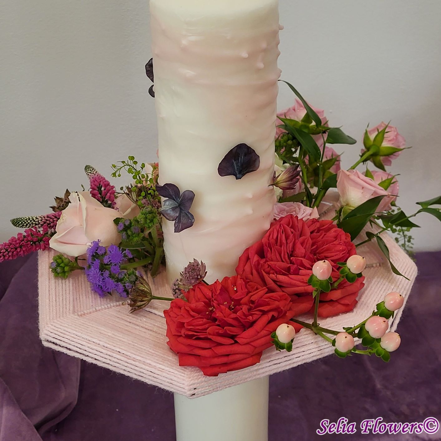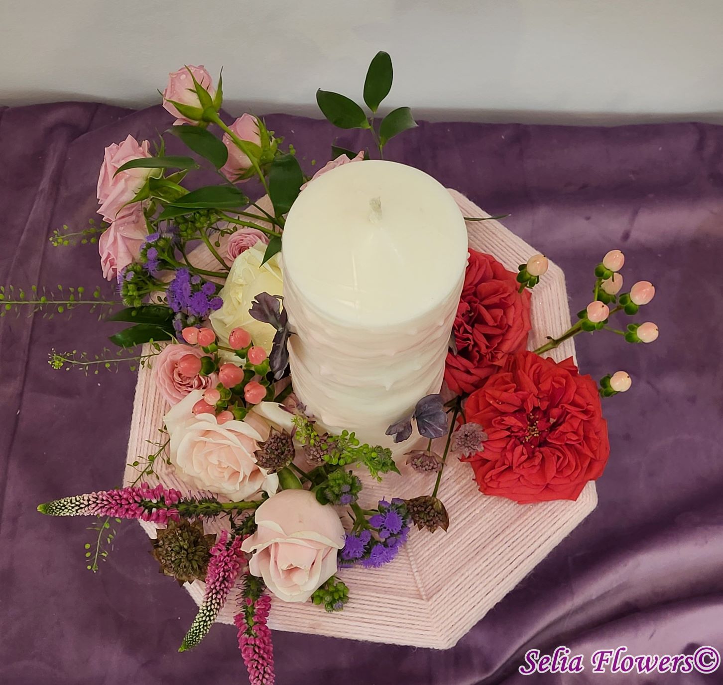 Lumânari decorate cu flori naturale cu un design realizat pe structura spider lucrată manual în atelierul nostru.