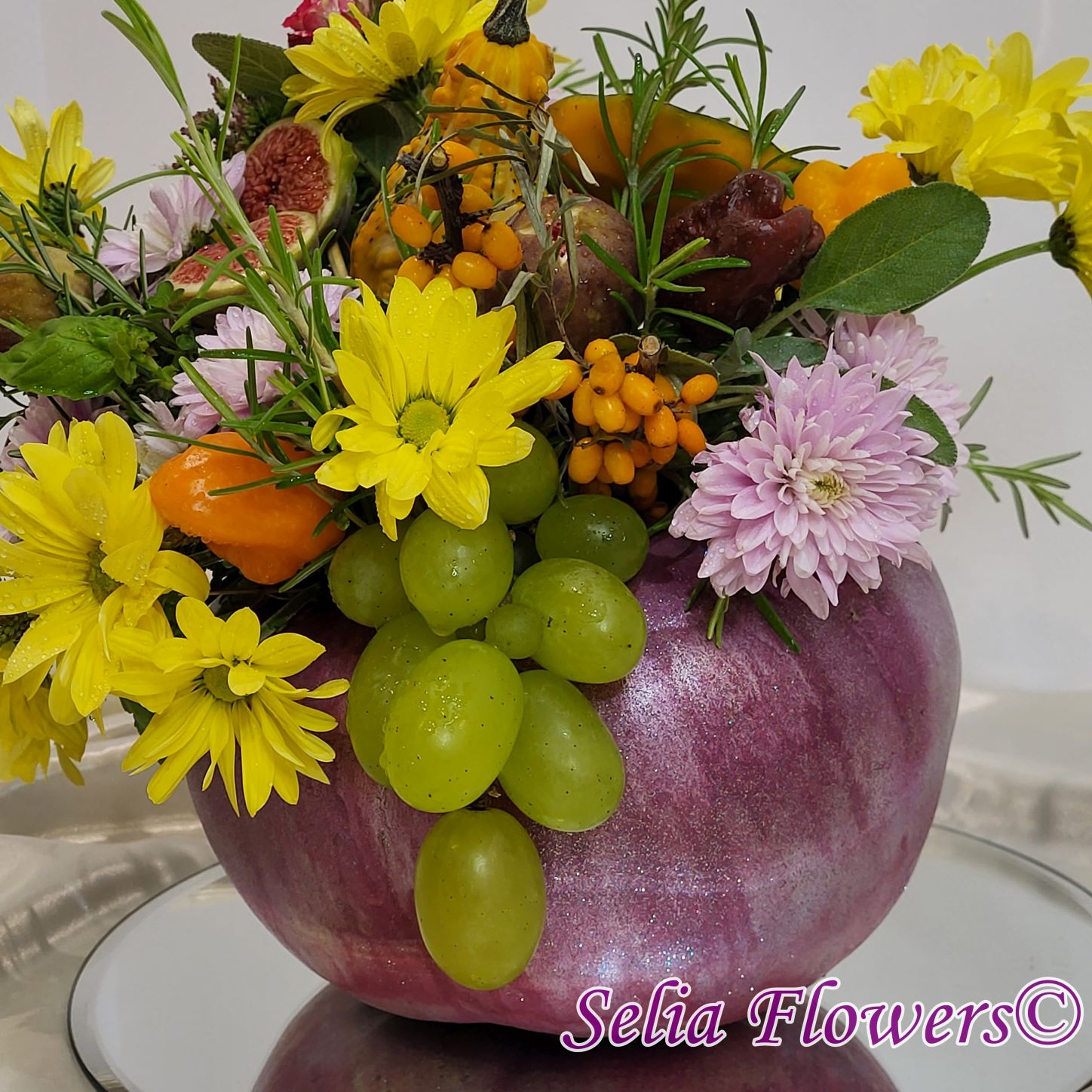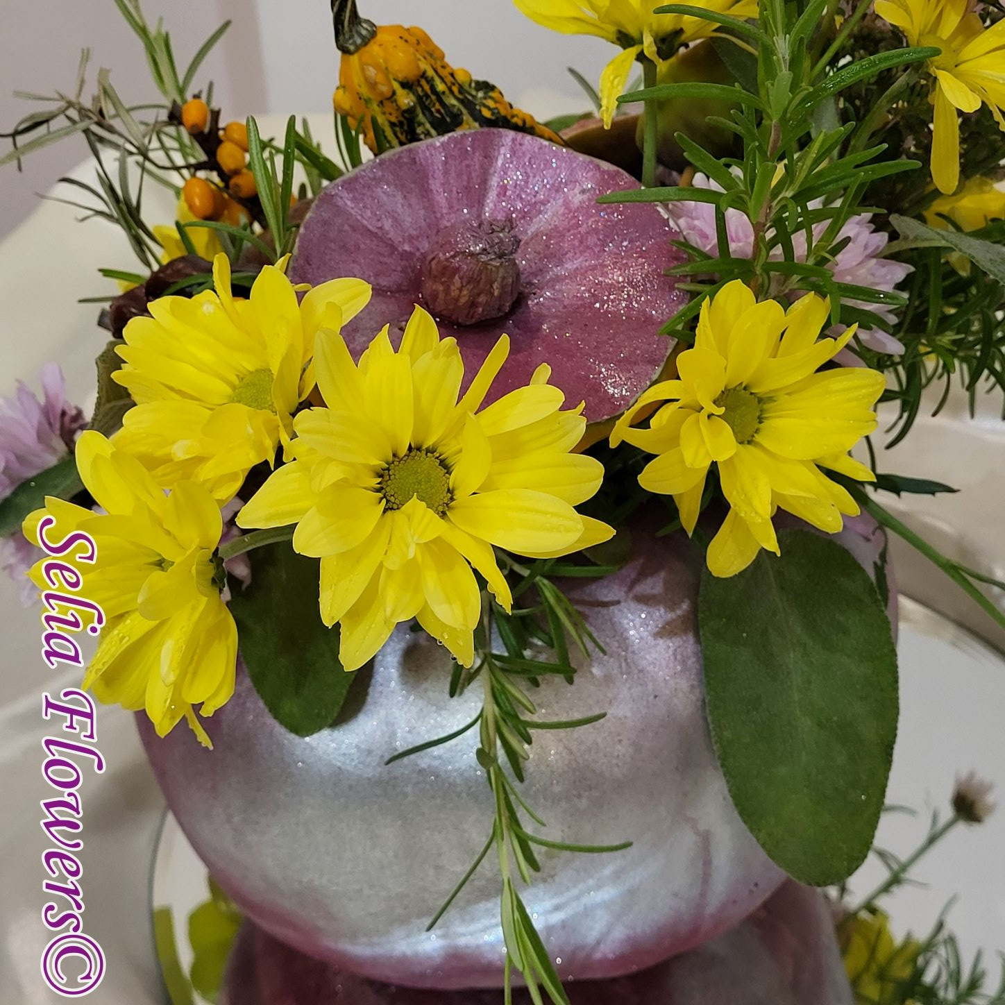 Dovleacul este vopsit și are culoarea mov combinată cu argintiu.
