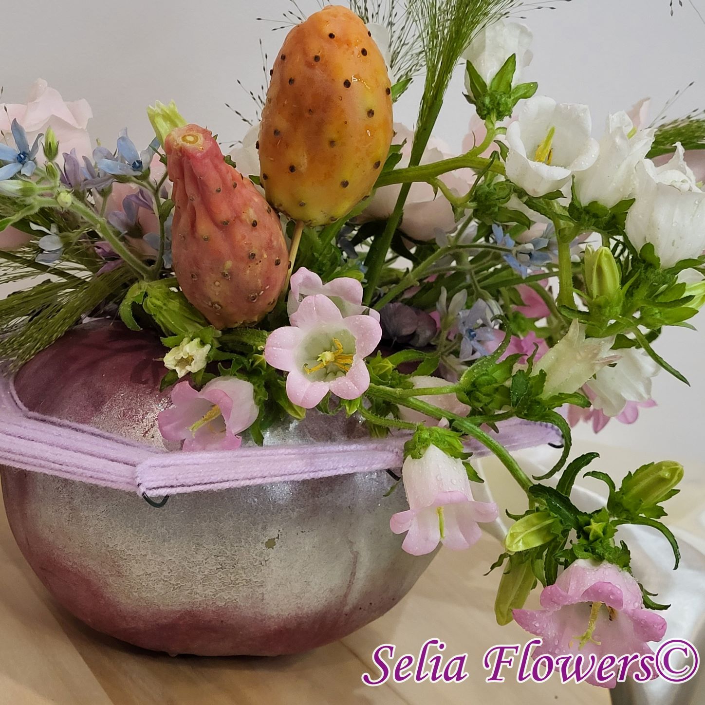 O frantura de toamnă într-un dovleac decorat cu flori naturale și fructe de cactus, pe o structura spider construită.