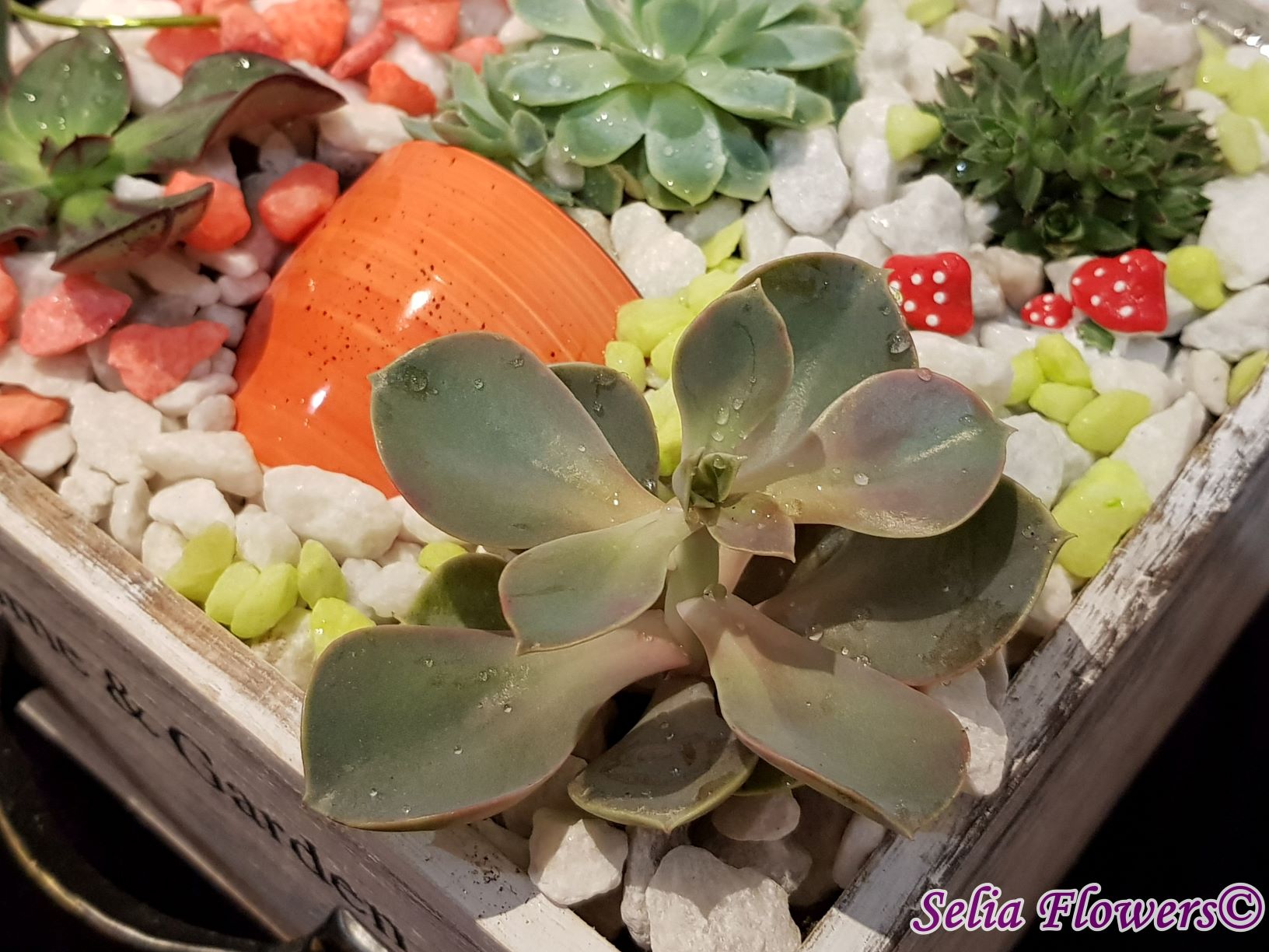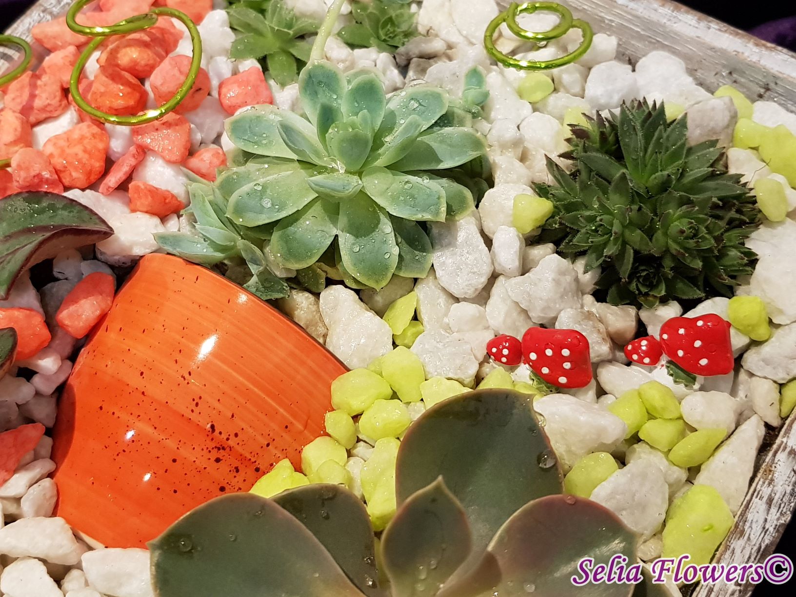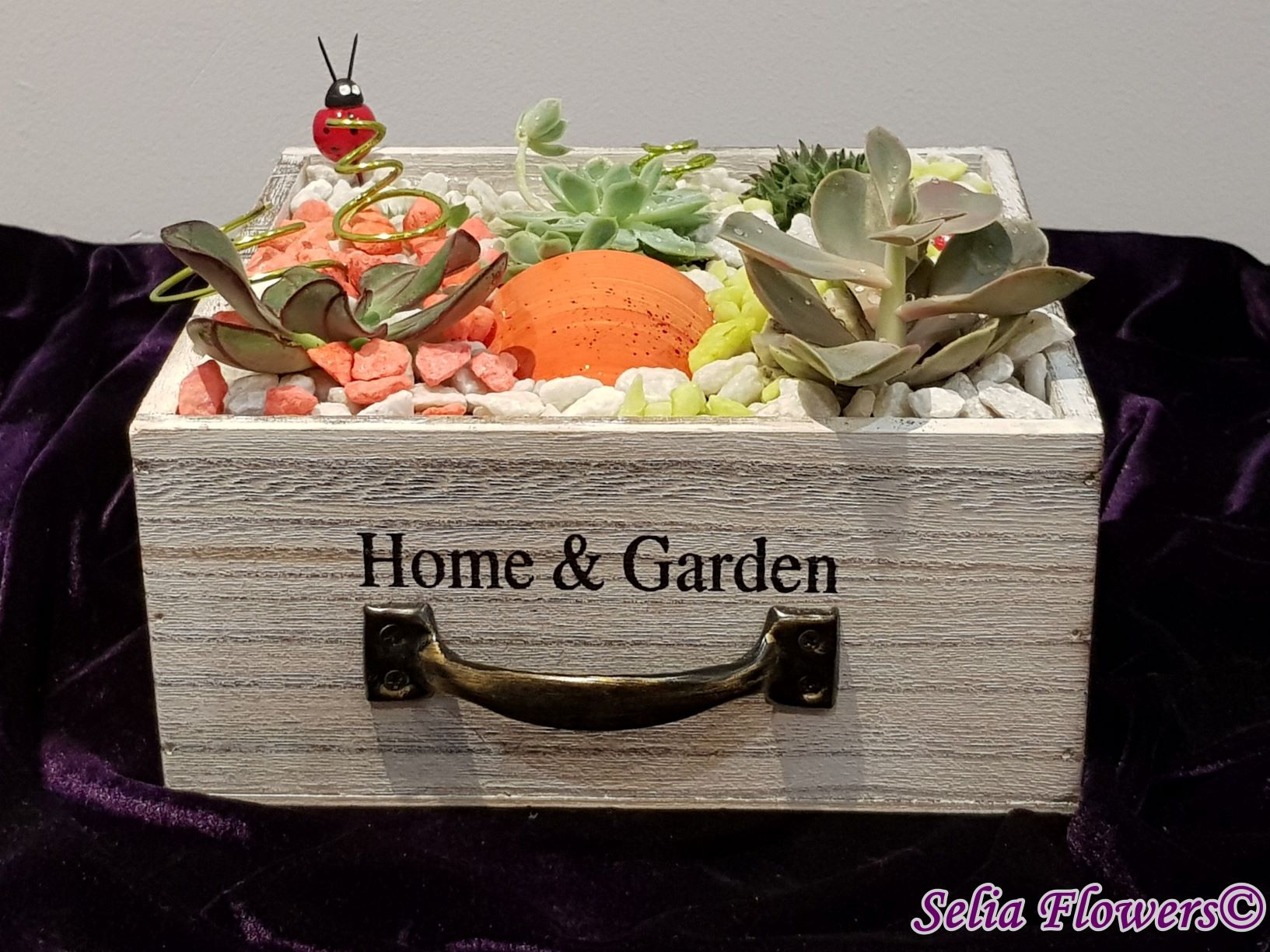Un aranjament vesel, decorativ și elegant construit în cutie de lemn tip sertar, dintr-un mix de plante suculente, accesorii decorative, marmură albă și pietre decorative in diverse culori. Potrivit atât ca aranjament de business, dar și pentru a fi daruit unei persoane dragi care se poate bucura mult timp de el de acum inainte.