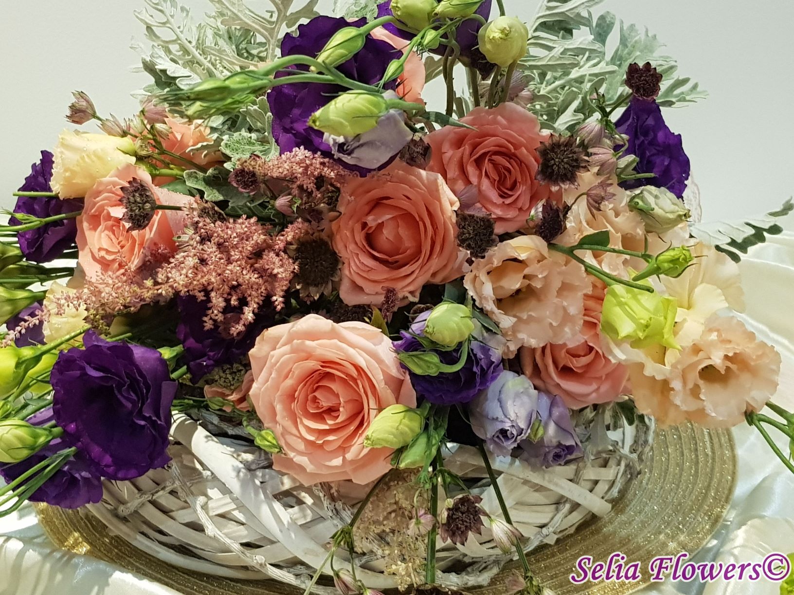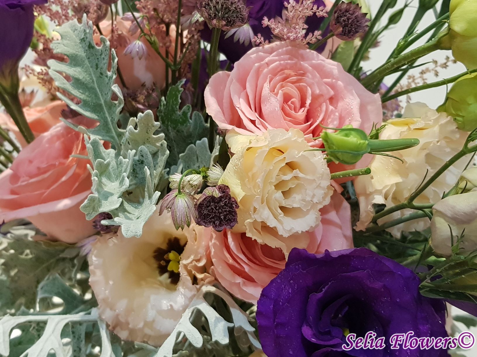 Un buchet vesel si plin de culoare, construit cu trandafiri, lisianthus,astrantia, asrilbe, senecio