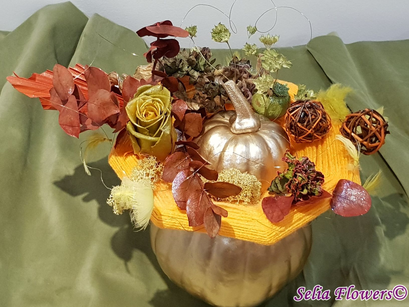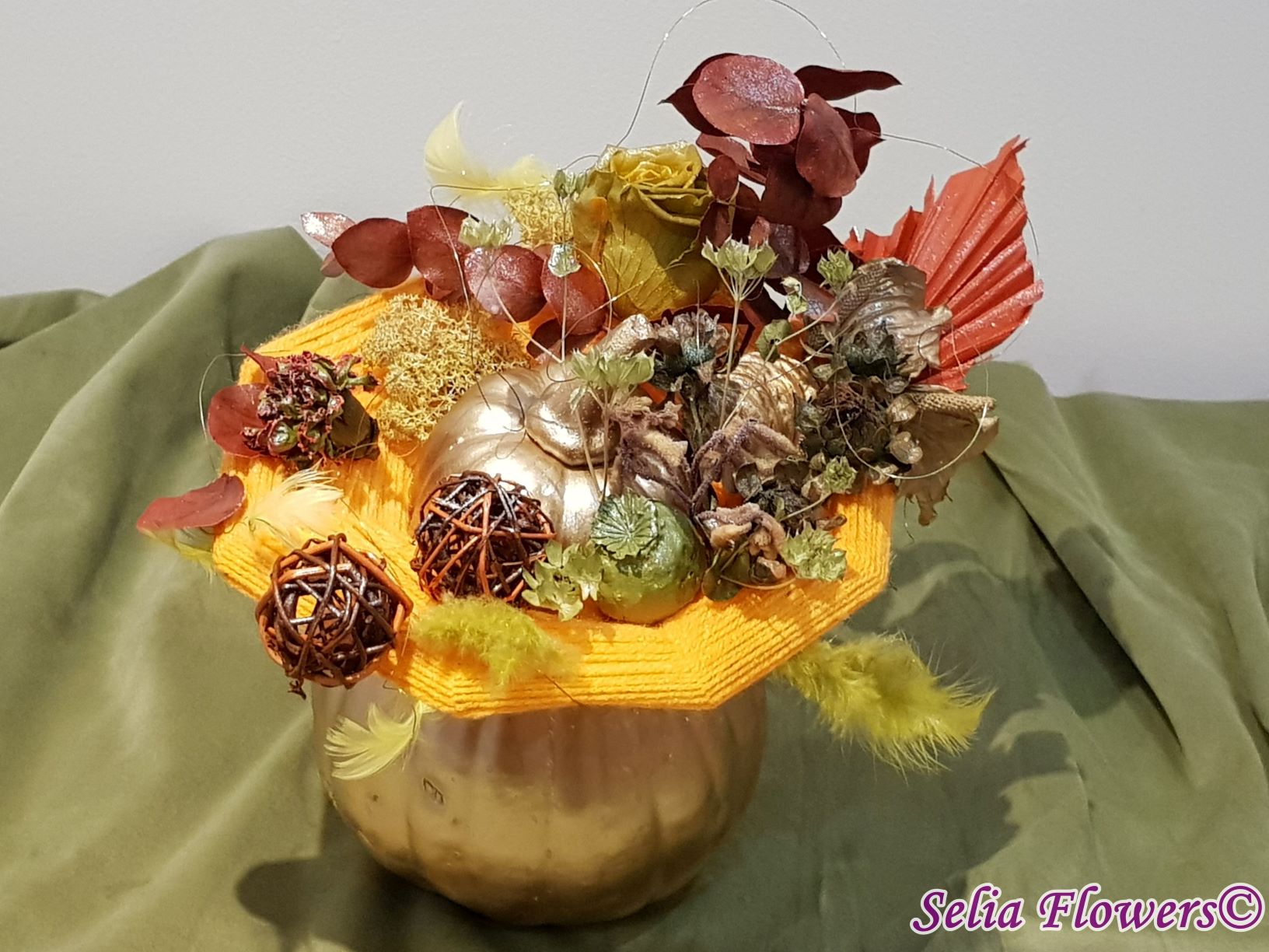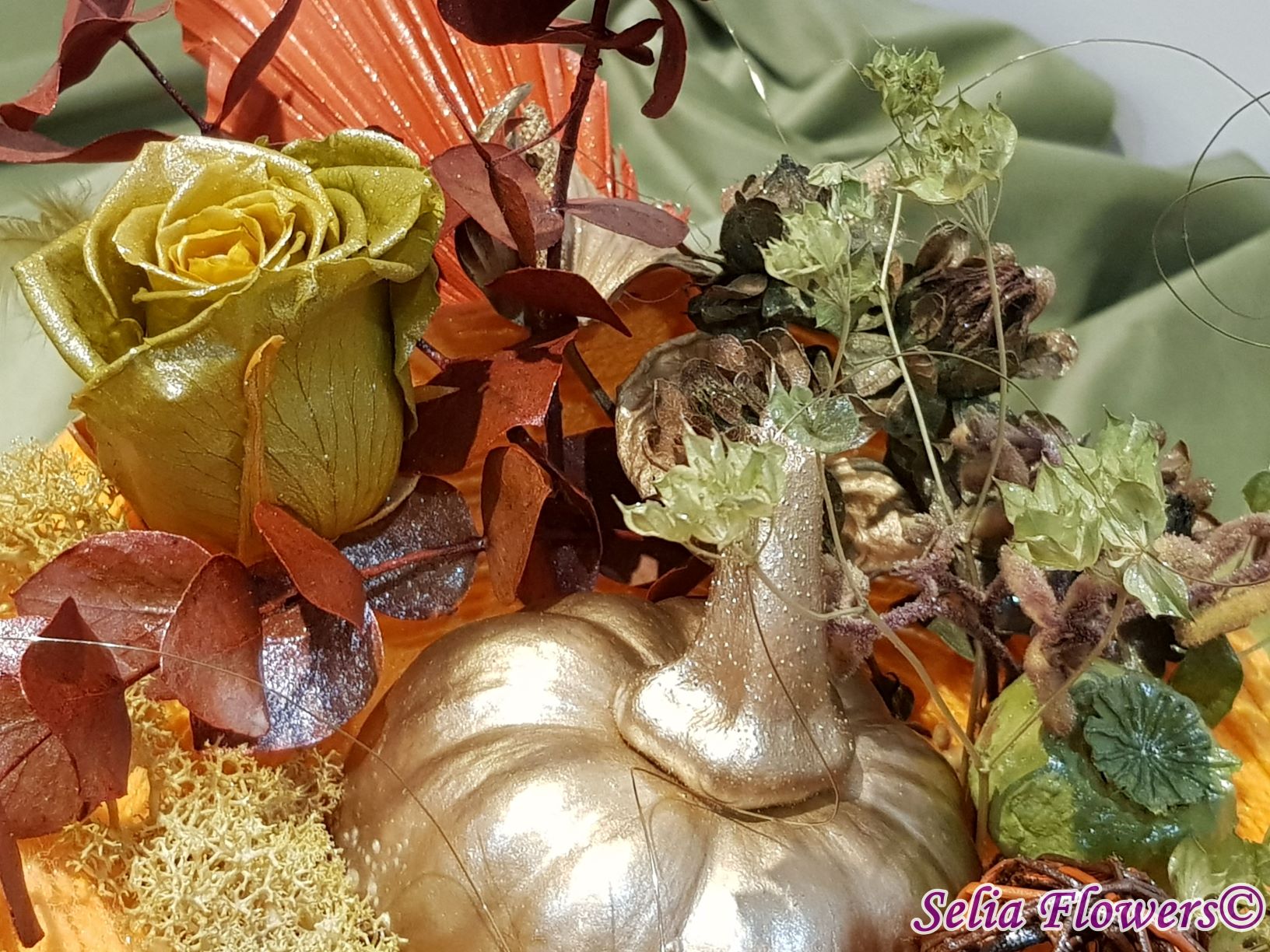Aranjamentul floral este realizat pe structura spider construita pe dovleac, cu trandafir criogenat si flori naturale uscate sau conservate. Dovleacul este vopsit in culoarea aurie.