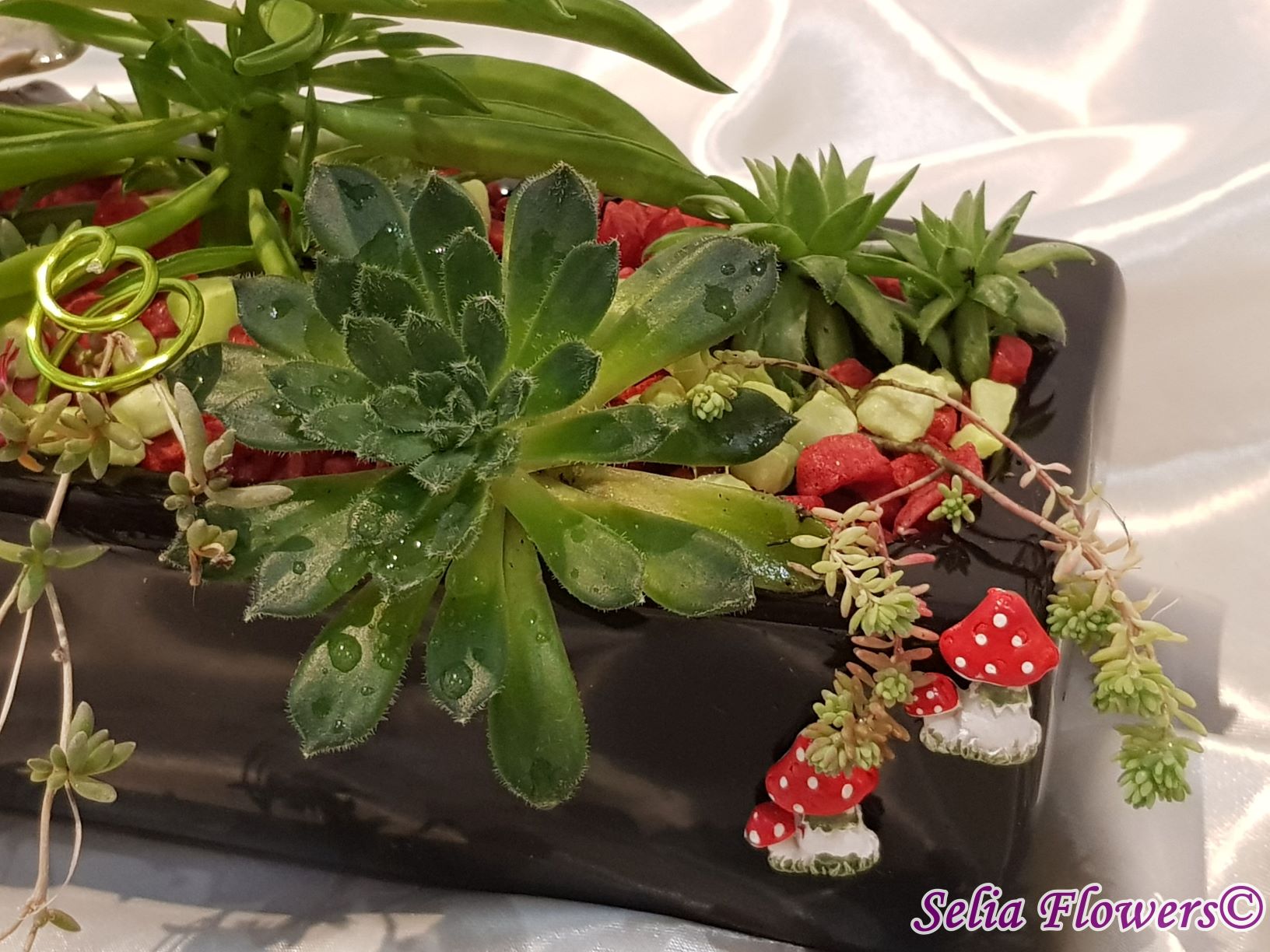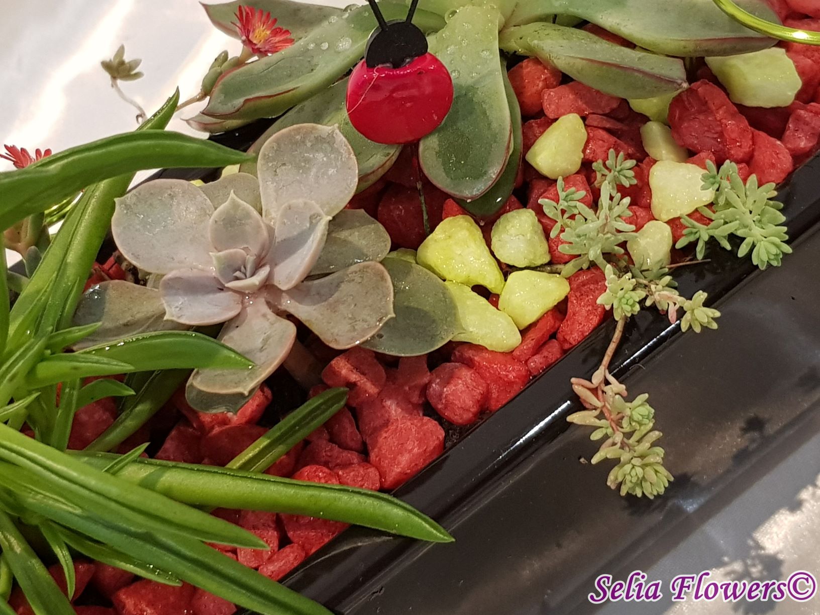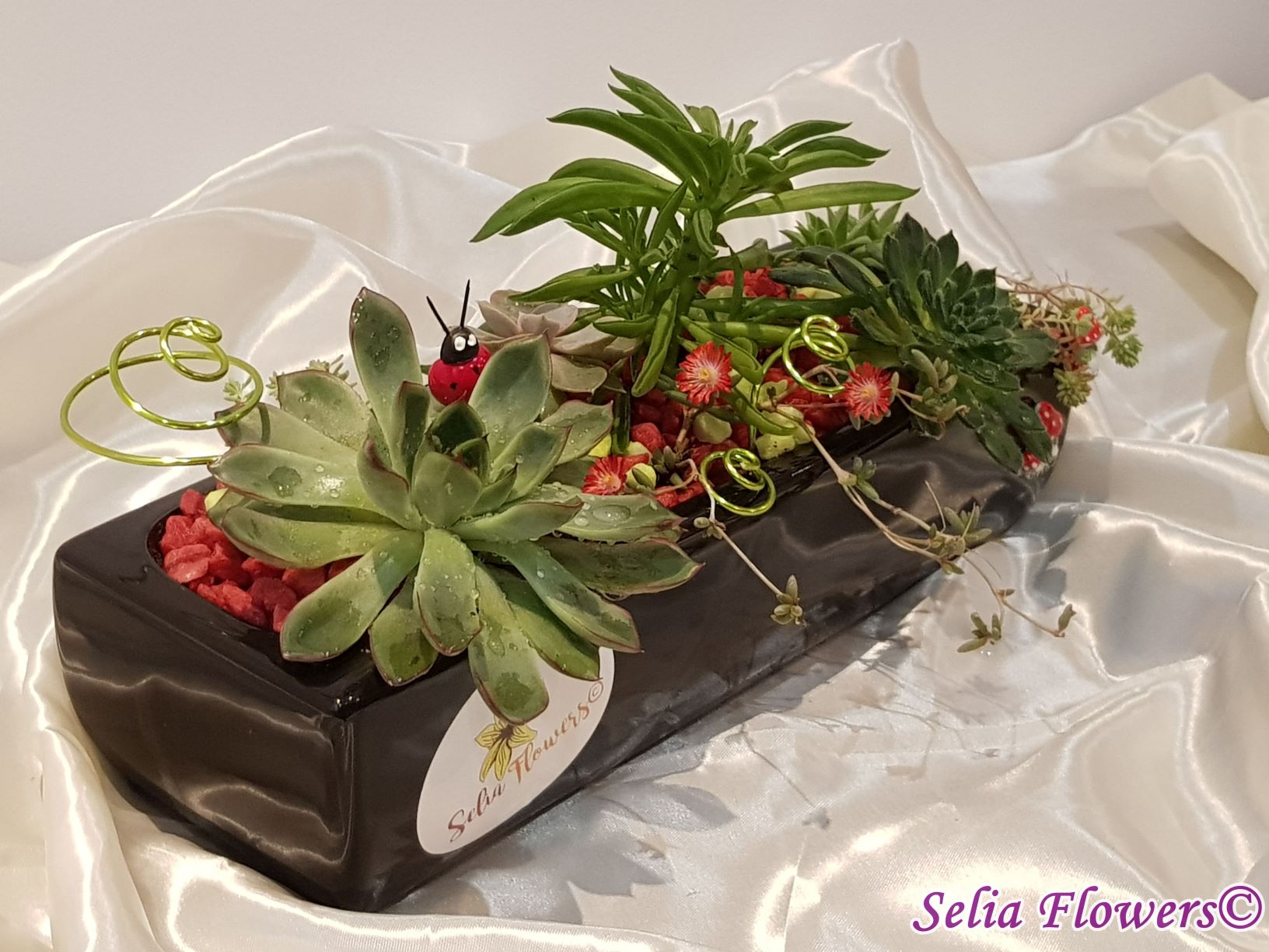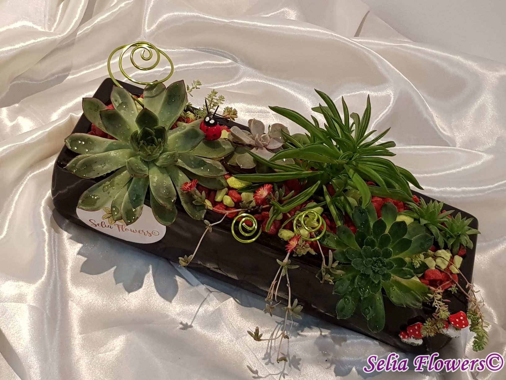 Un aranjament vesel, decorativ și elegant construit în vas ceramic dintr-un mix de plante suculente, accesorii decorative, pietre decorative in doua culori. Potrivit atât ca aranjament de business, dar și pentru a fi daruit unei persoane dragi care se poate bucura mult timp de el de acum inainte.