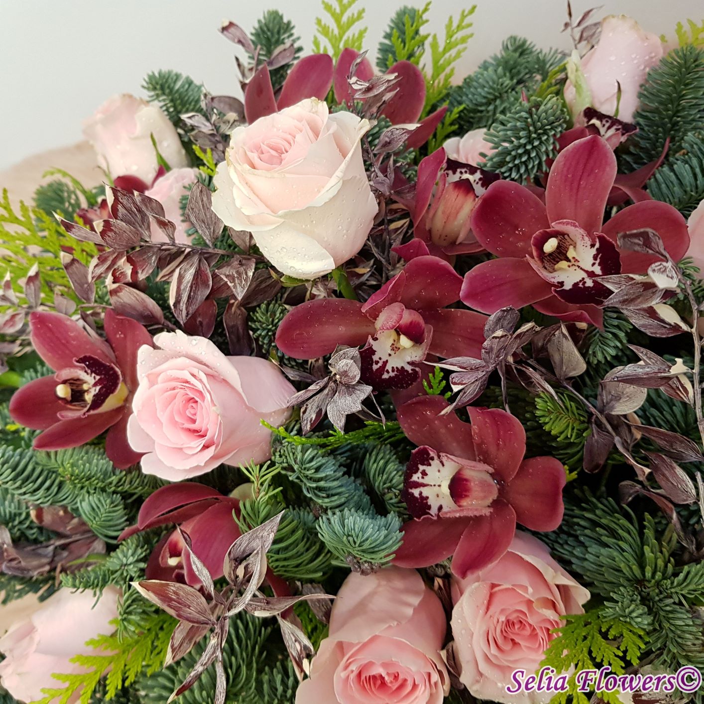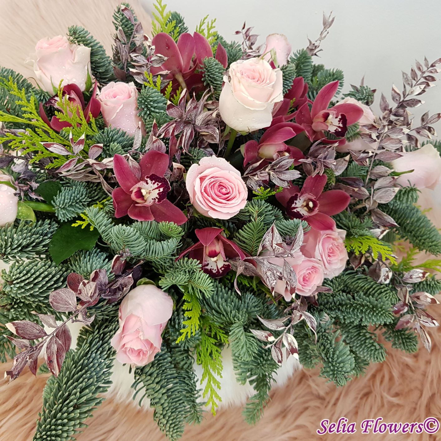 Compozitie: brad nobilis blue, tuia, 12 trandafiri, 10 cupe miniorhidee, ruscus natural stabilizat și vopsit.