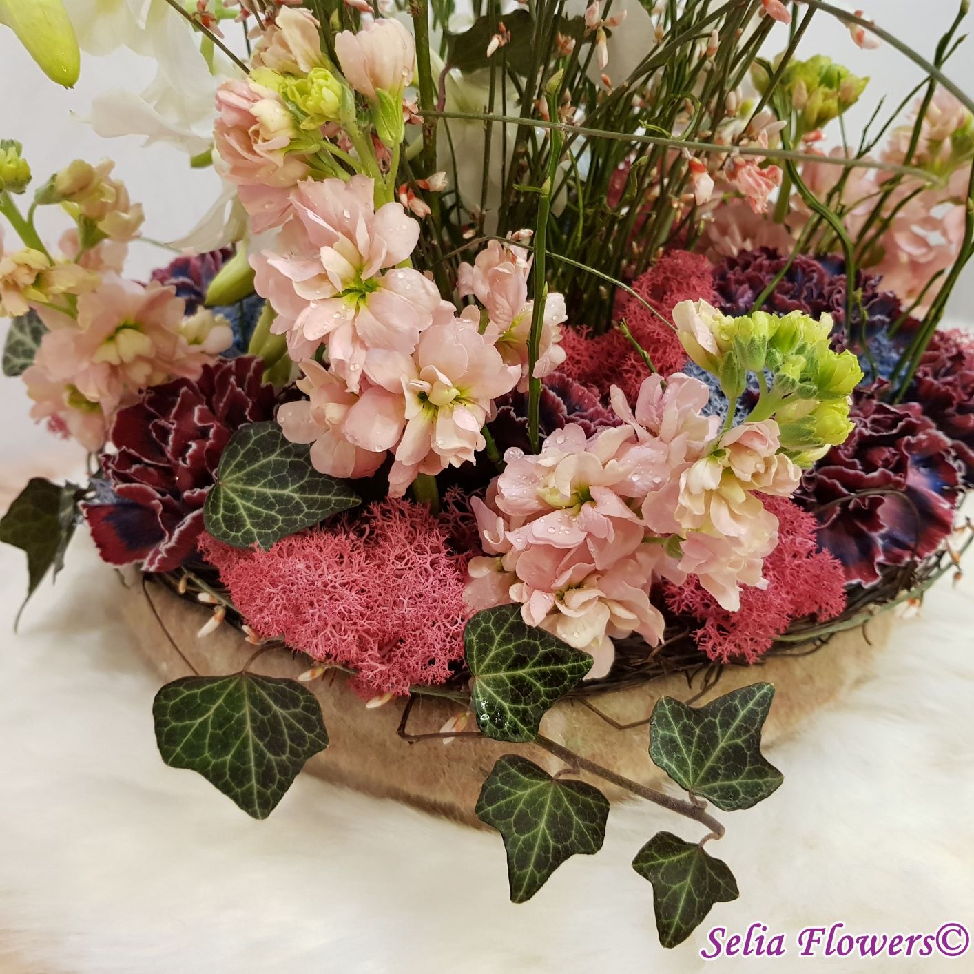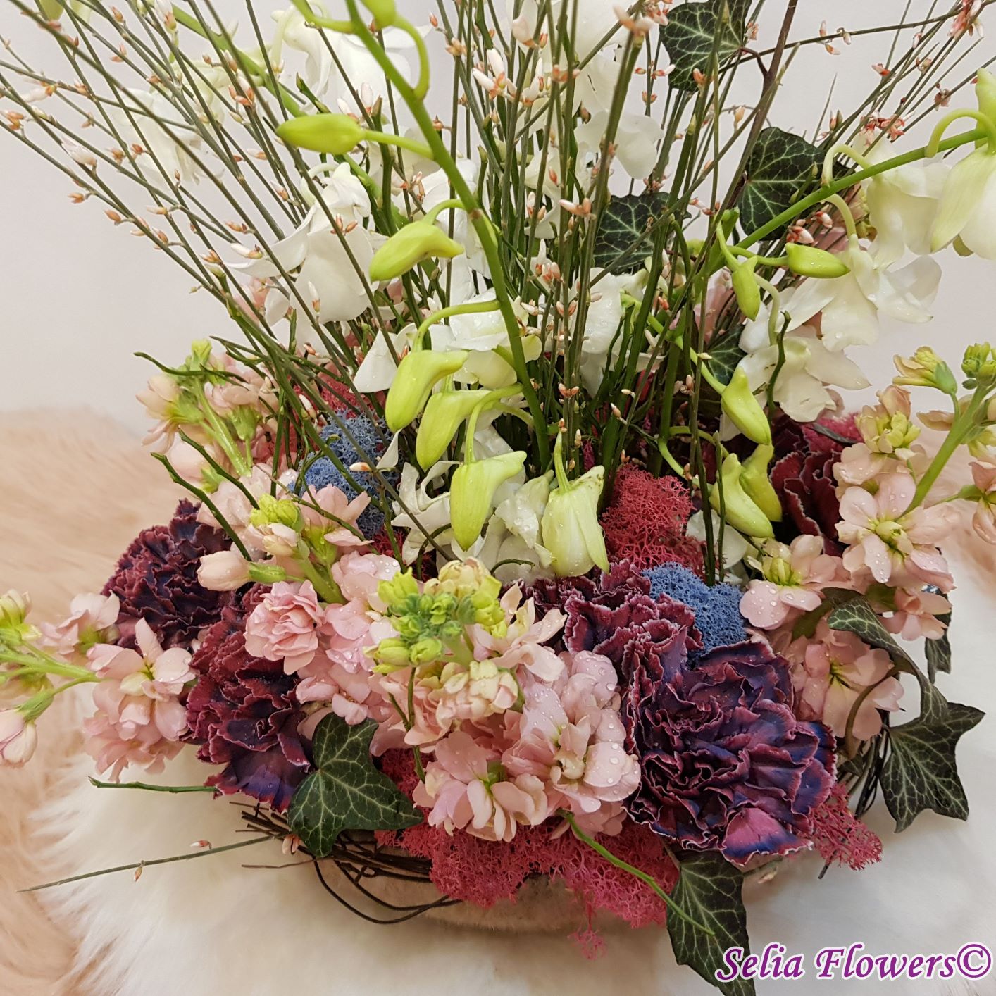 Un aranjament vesel, parfumat și plin de culoare, construit în vas rotund prevăzut cu burete umed care asigură hidratarea florilor și menținerea lor pe o perioadă mai îndelungată. Este realizat din: orhidee dendrobium, dianthus vip, mathiola, genista și iederă. Este accesorizat cu licheni naturali stabilizați, în două culori și panglică de lână care îmbracă circumferința vasului.