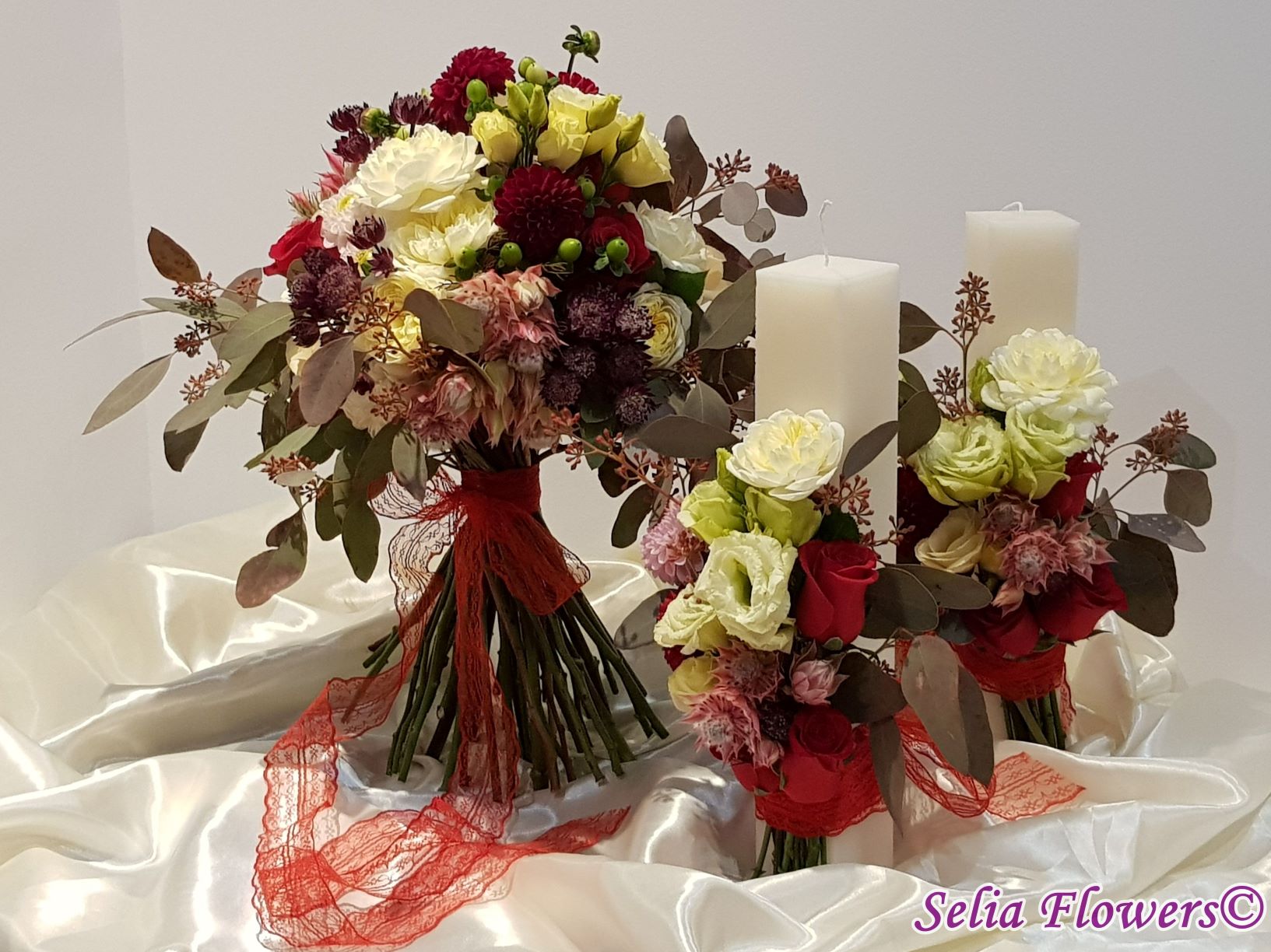 Compoziție florală: trandafiri parfumați de gradină, trandafiri red naomi, lisianthus, serruria, dalii, astrantia, eucalypt populus berry.