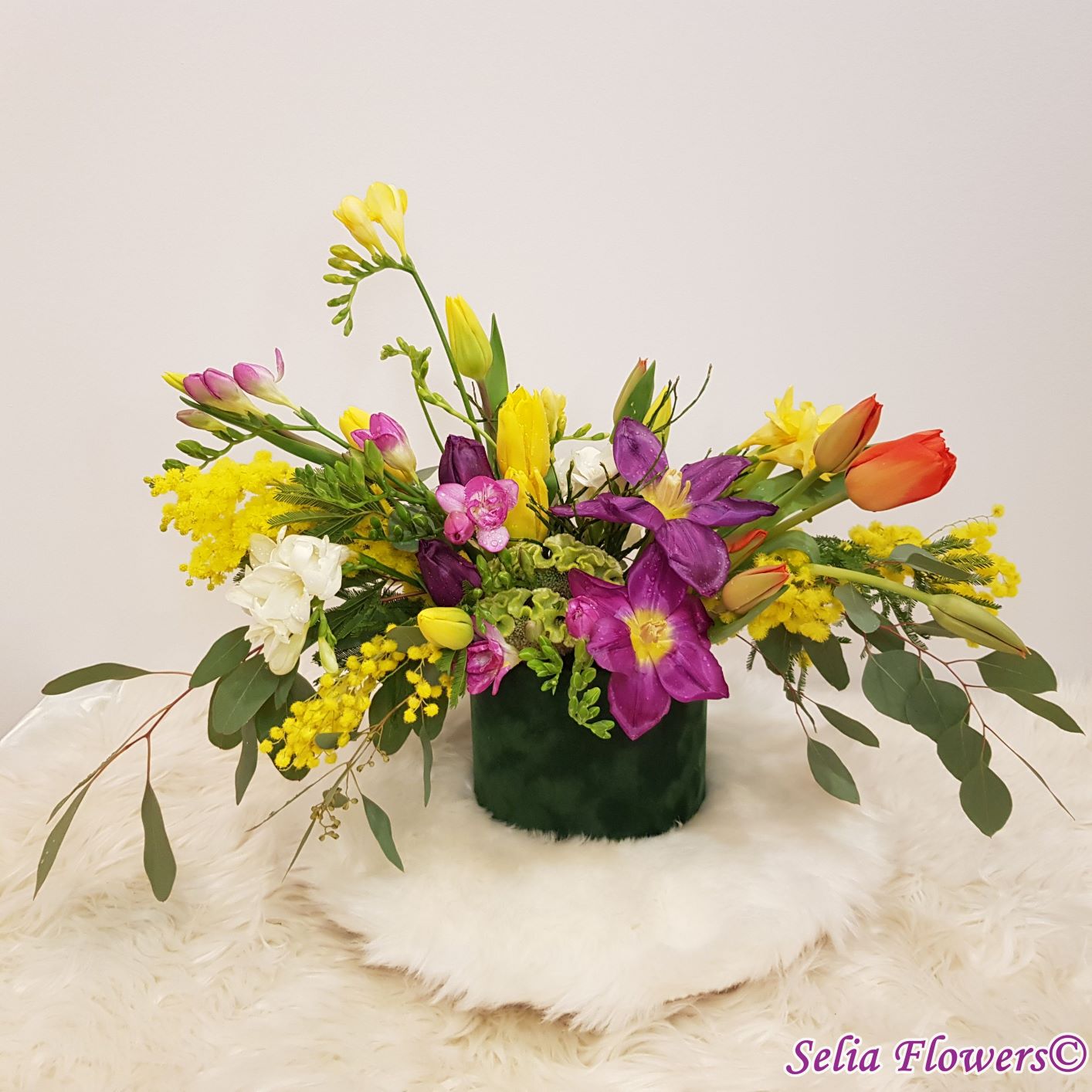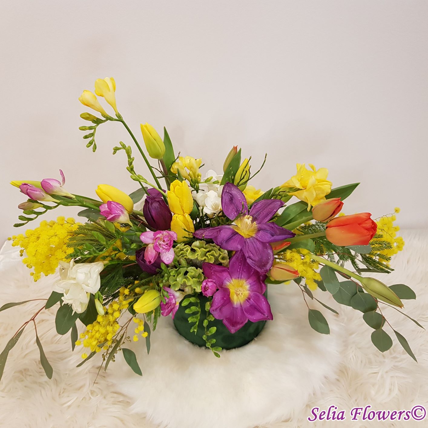 Un aranjament de primăvară, vesel și parfumat, construit în cutie de catifea cu flori de primăvară (lalele în trei culori, frezii, mimosa pudica, celosia, eucalipt).