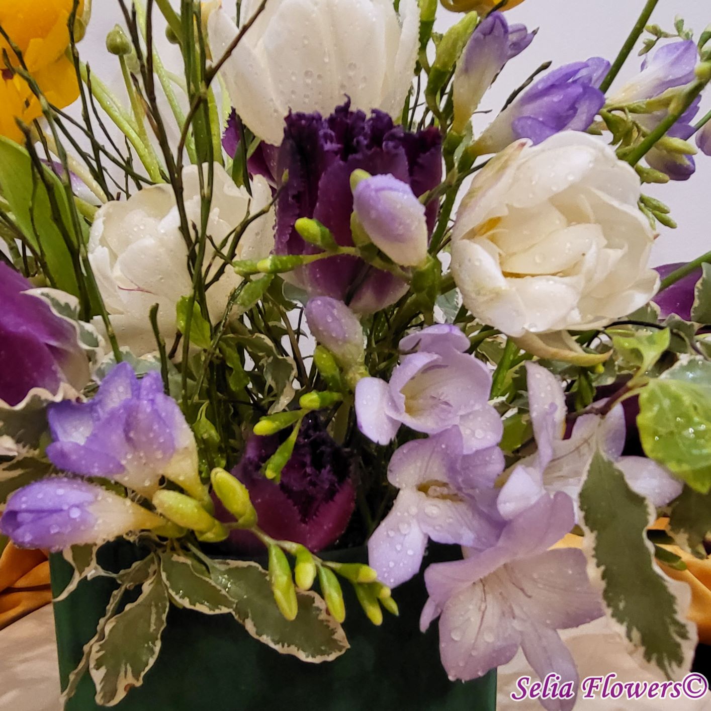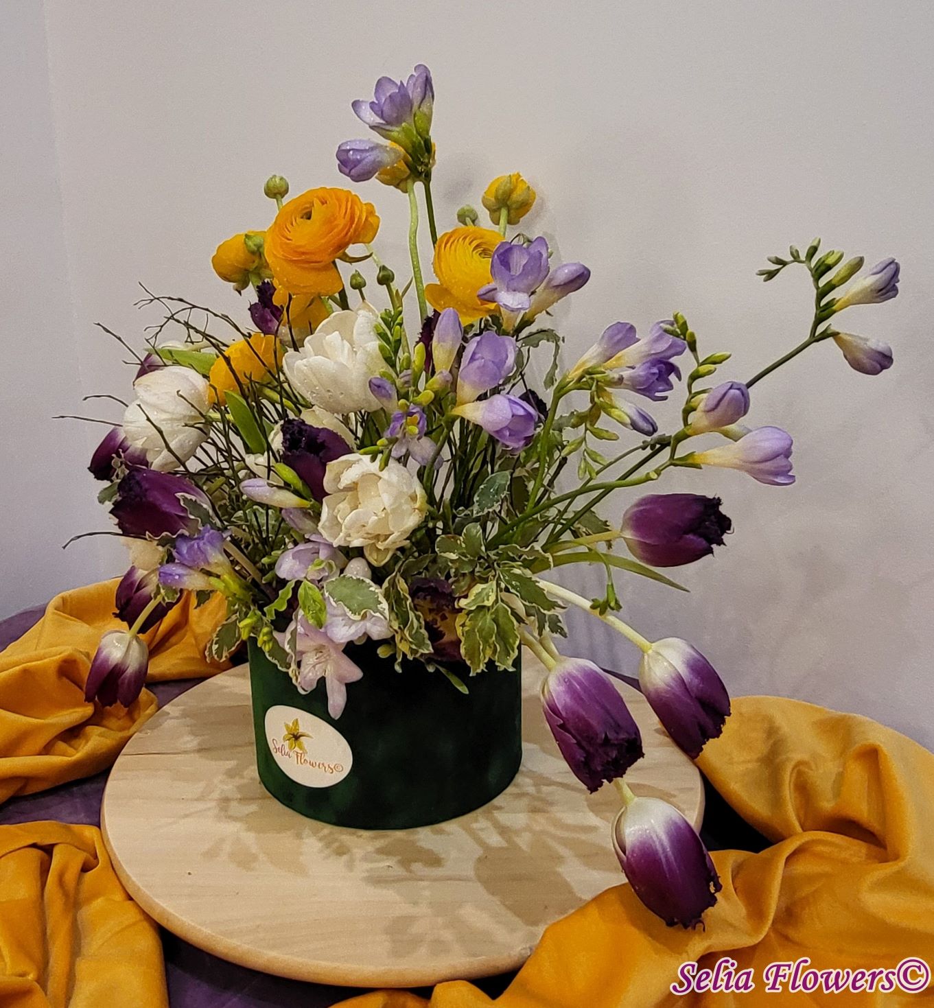 Un aranjament vesel, cu flori de primăvară (ranunculus, lalele, frezii, pittosporum), construit în cutie verde de catifea.