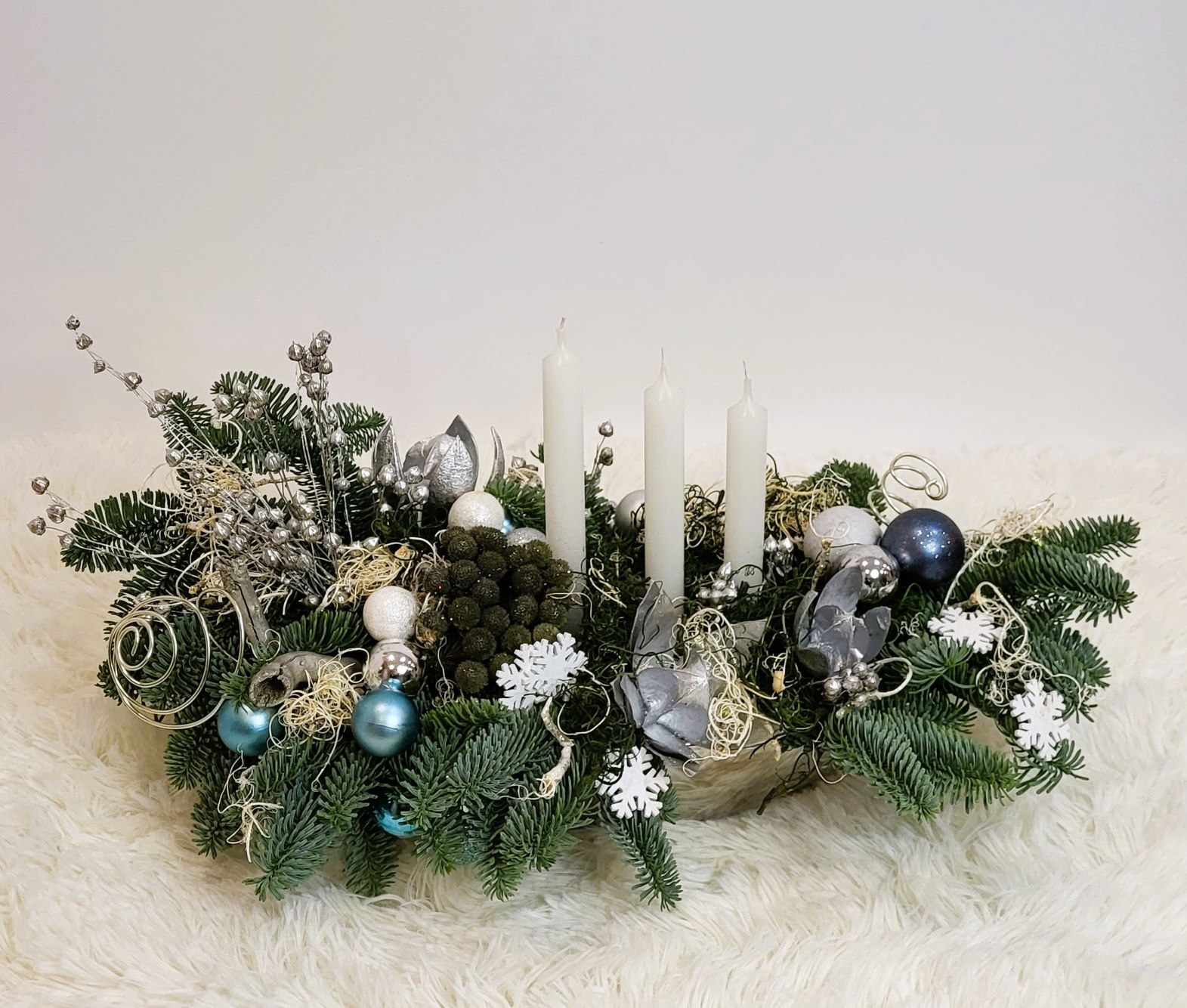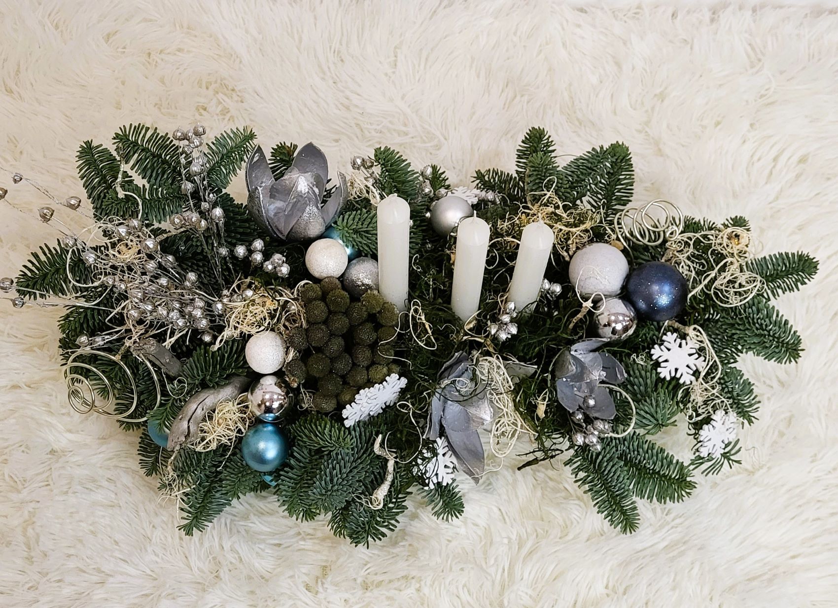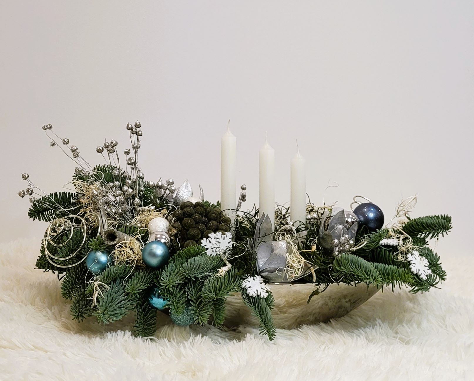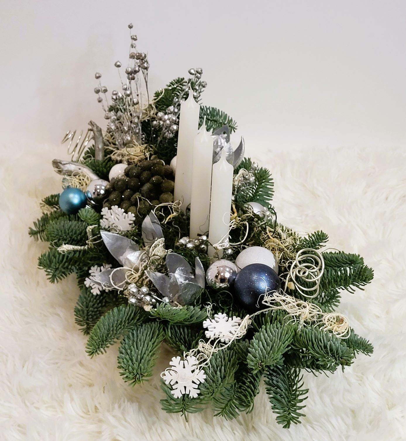 Este construit cu brad natural olandez, pe suport de burete umed, care îi asigură o hidratare de durată. Decorarea este făcută cu globuri în mai multe culori, plante conservate, mușchi conservat în două culori și alte elemente de decor specifice. Aranjamentul este prevăzut cu 3 lumânări albe.
