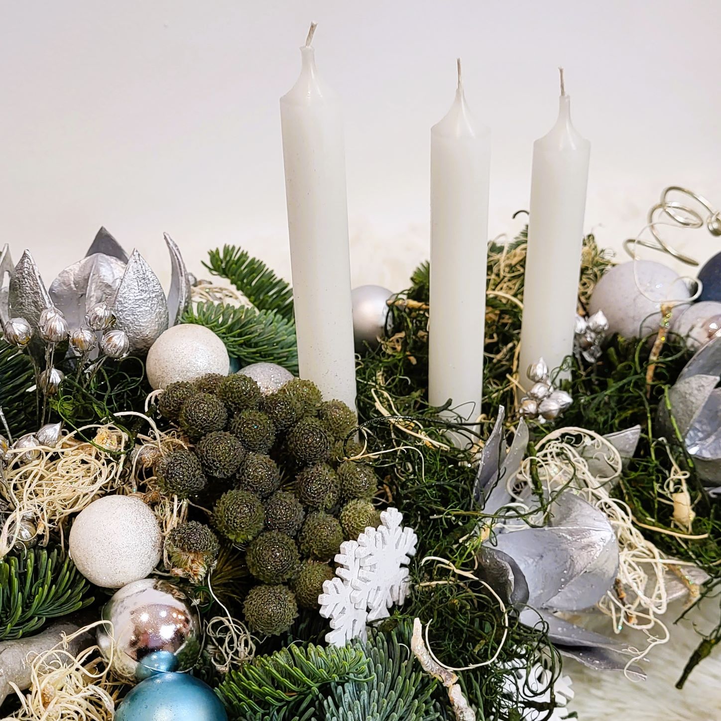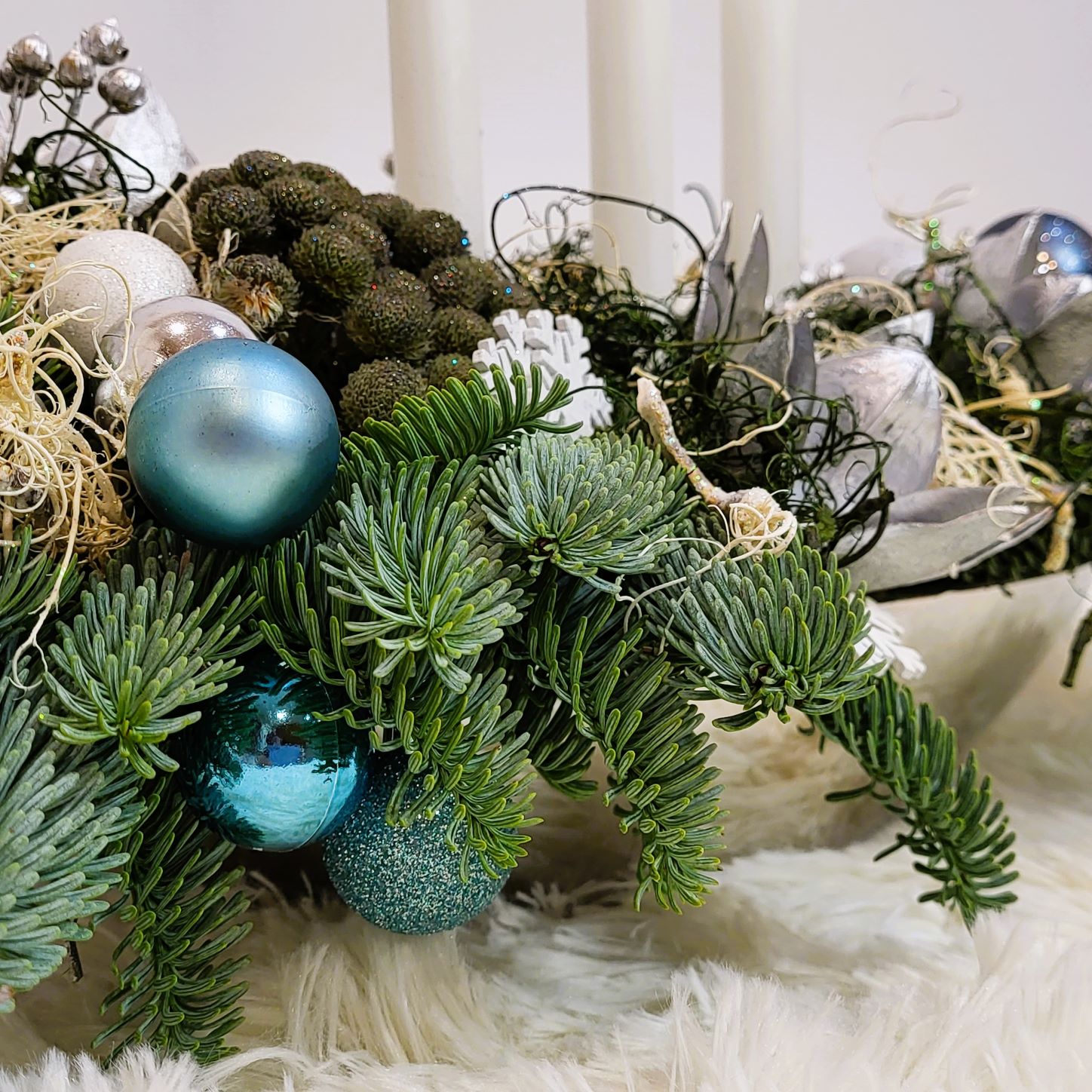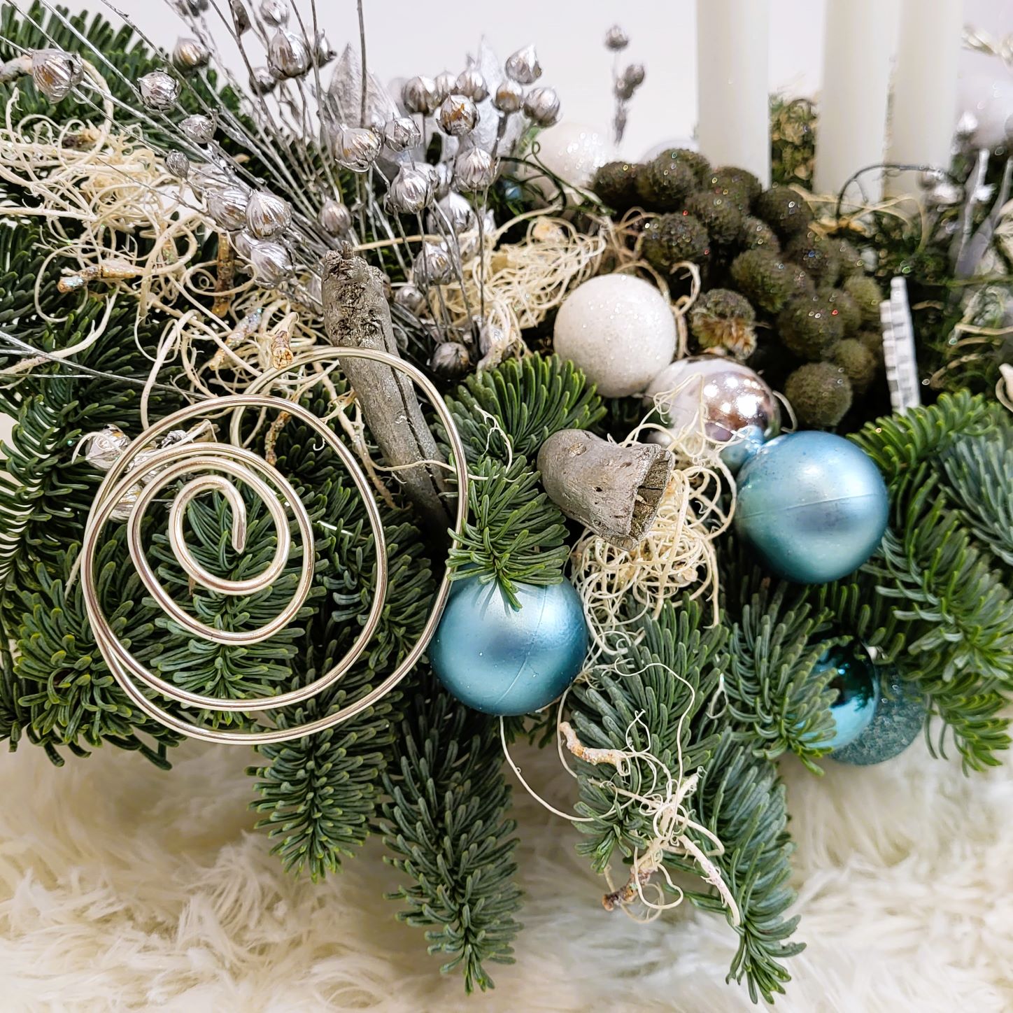 Este construit cu brad natural olandez, pe suport de burete umed, care îi asigură o hidratare de durată. Decorarea este făcută cu globuri în mai multe culori, plante conservate, mușchi conservat în două culori și alte elemente de decor specifice. Aranjamentul este prevăzut cu 3 lumânări albe.