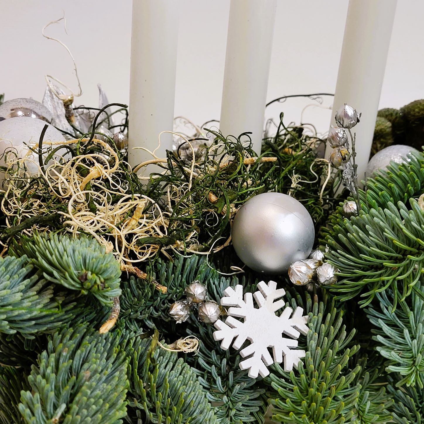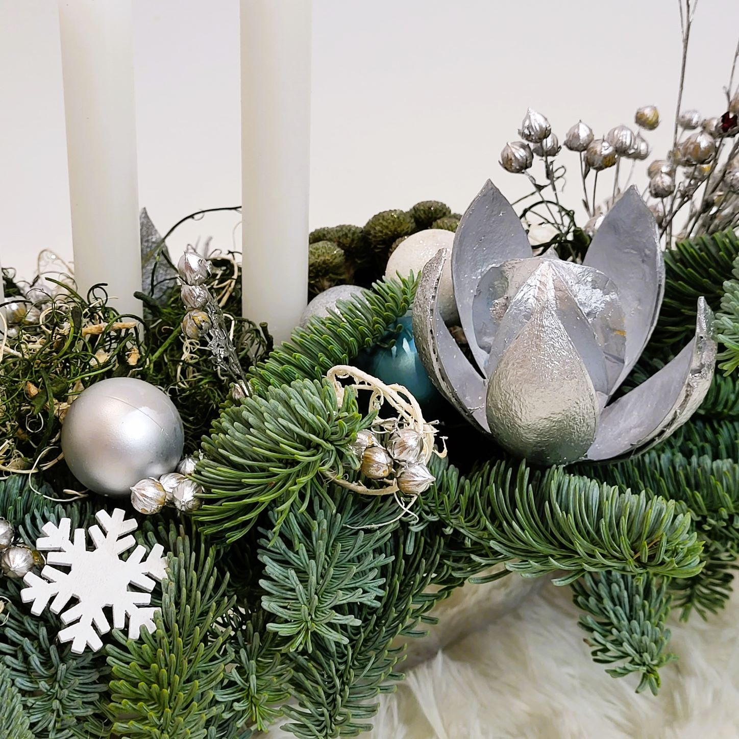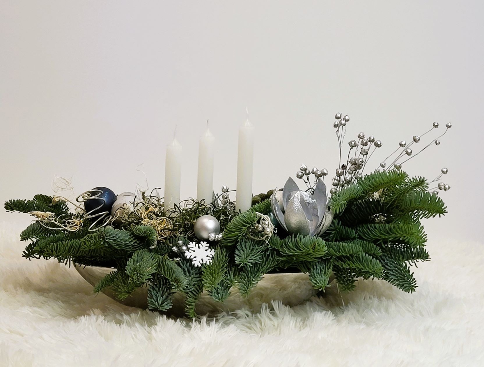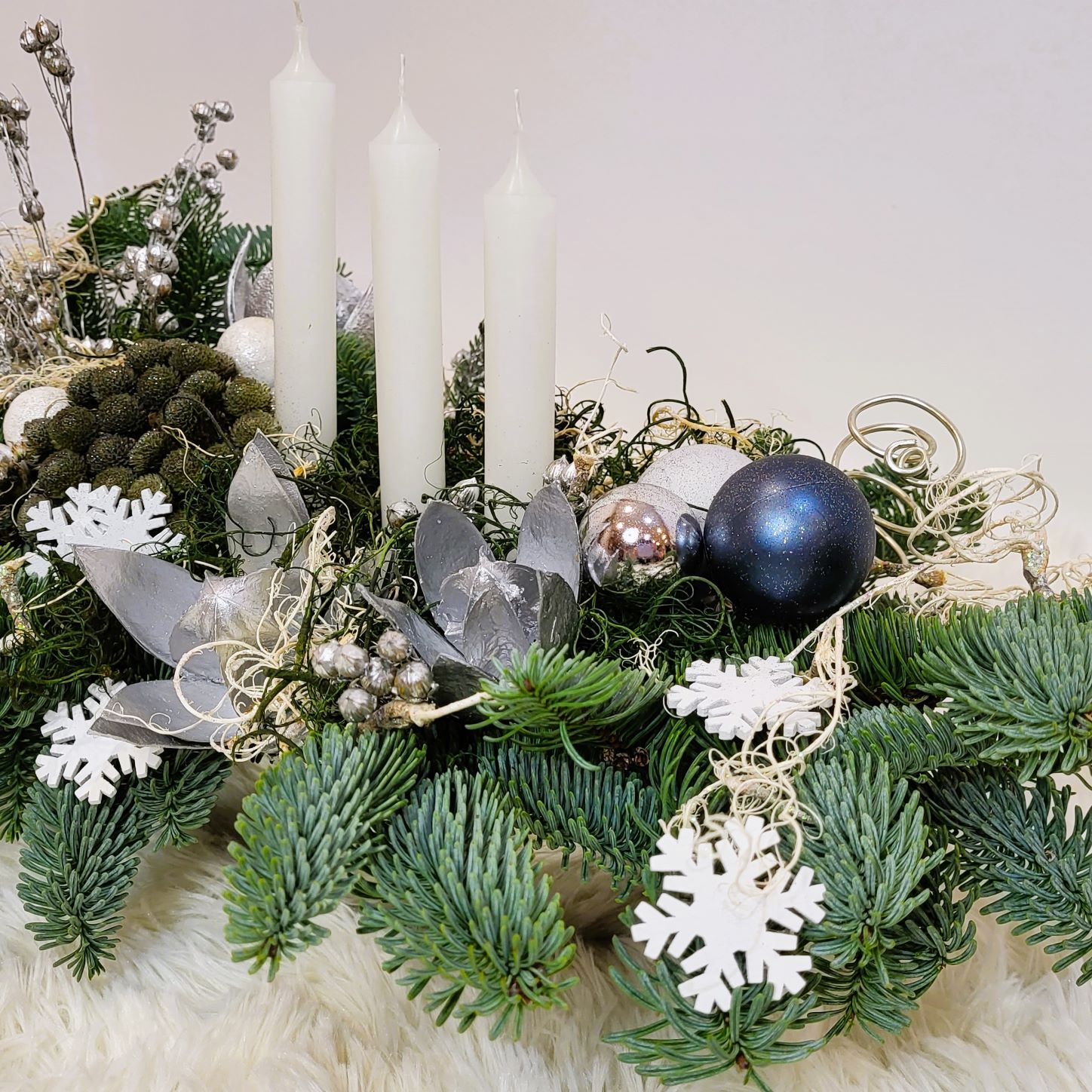 Este construit cu brad natural olandez, pe suport de burete umed, care îi asigură o hidratare de durată. Decorarea este făcută cu globuri în mai multe culori, plante conservate, mușchi conservat în două culori și alte elemente de decor specifice. Aranjamentul este prevăzut cu 3 lumânări albe.