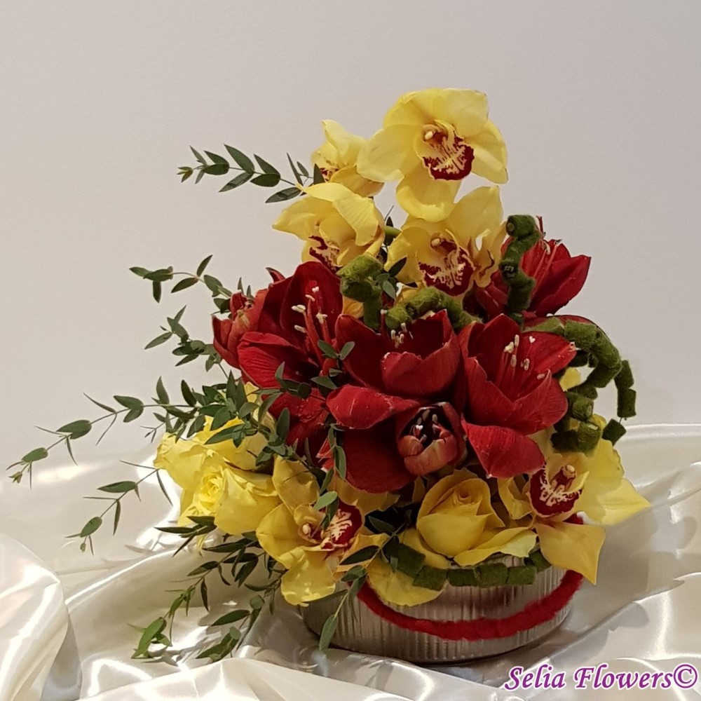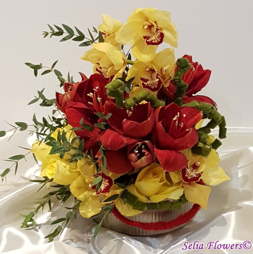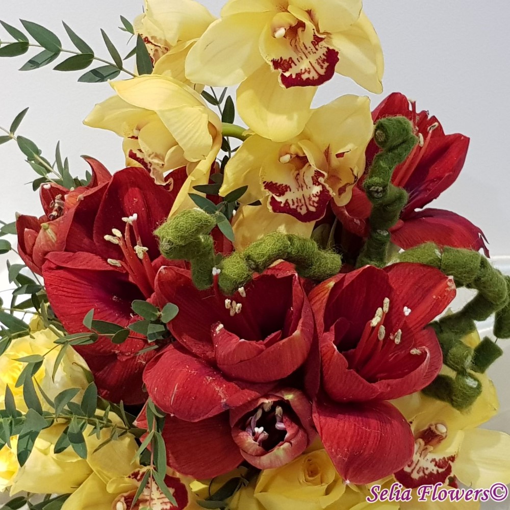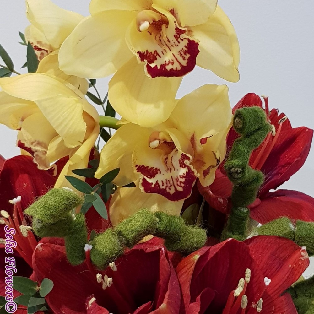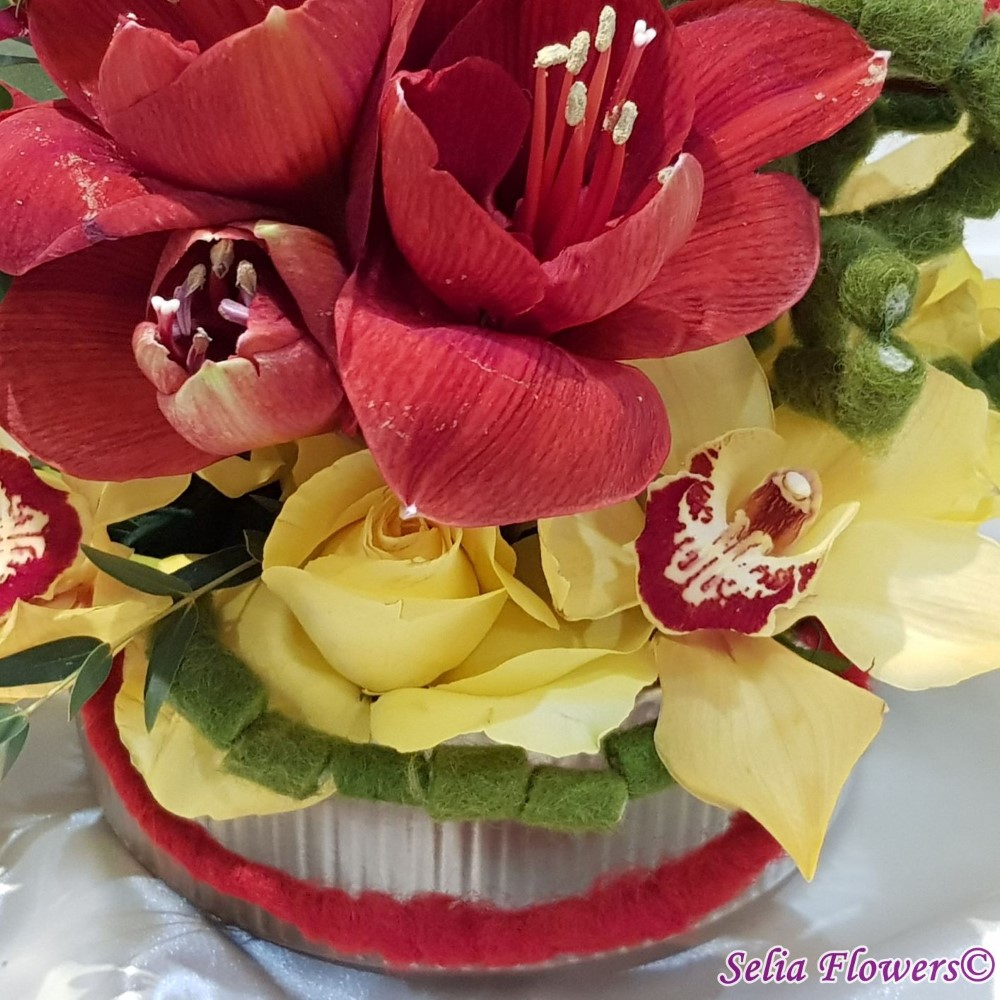 Aranjament in vas rotund, construit in suport de burete umed, cu amaryllis, trandafiri, orhidee cymbidium si accesorizat cu elemente din lana si verdeata.