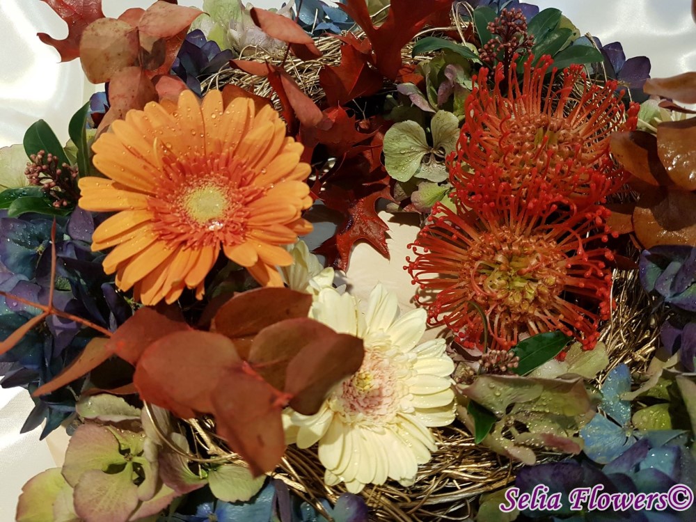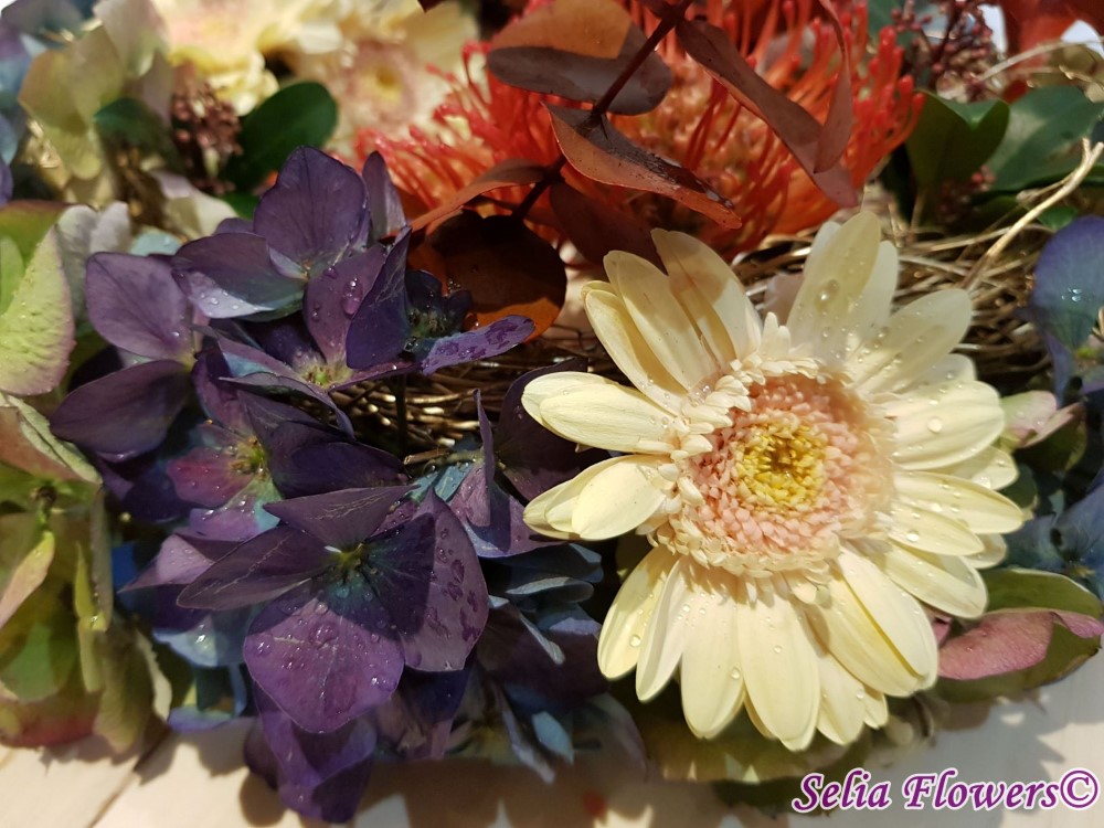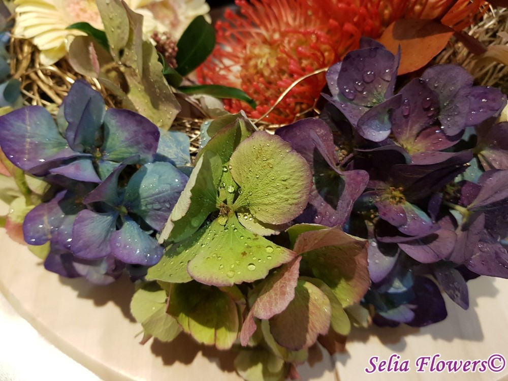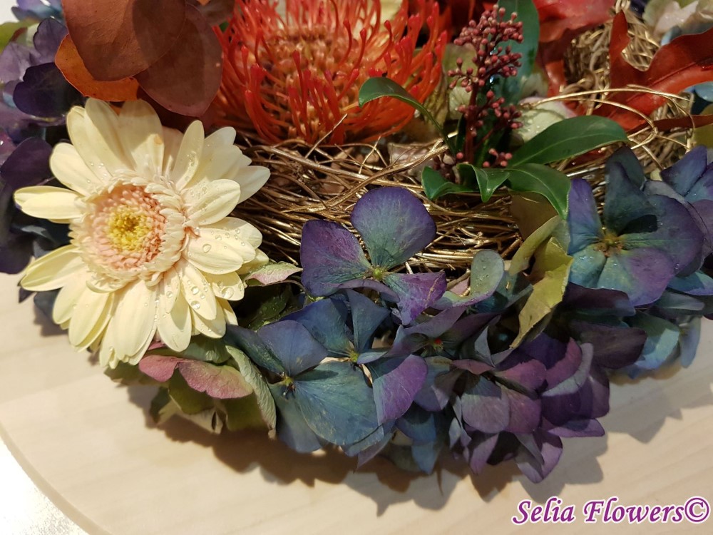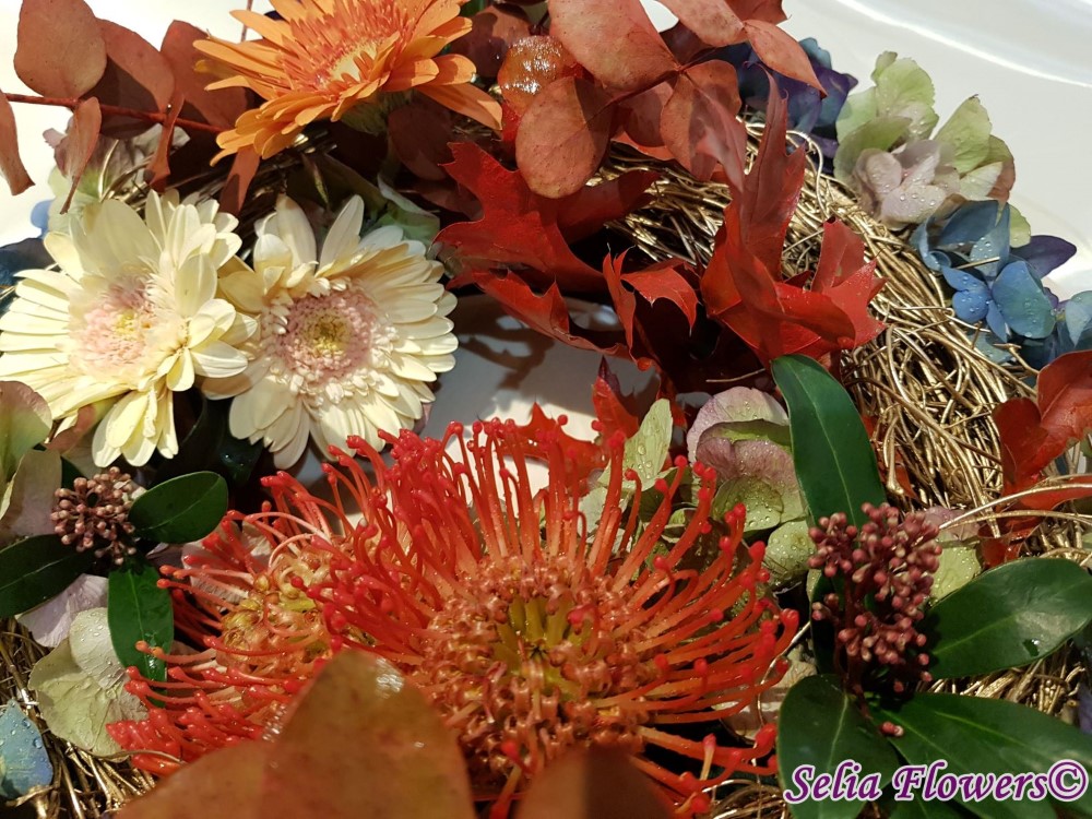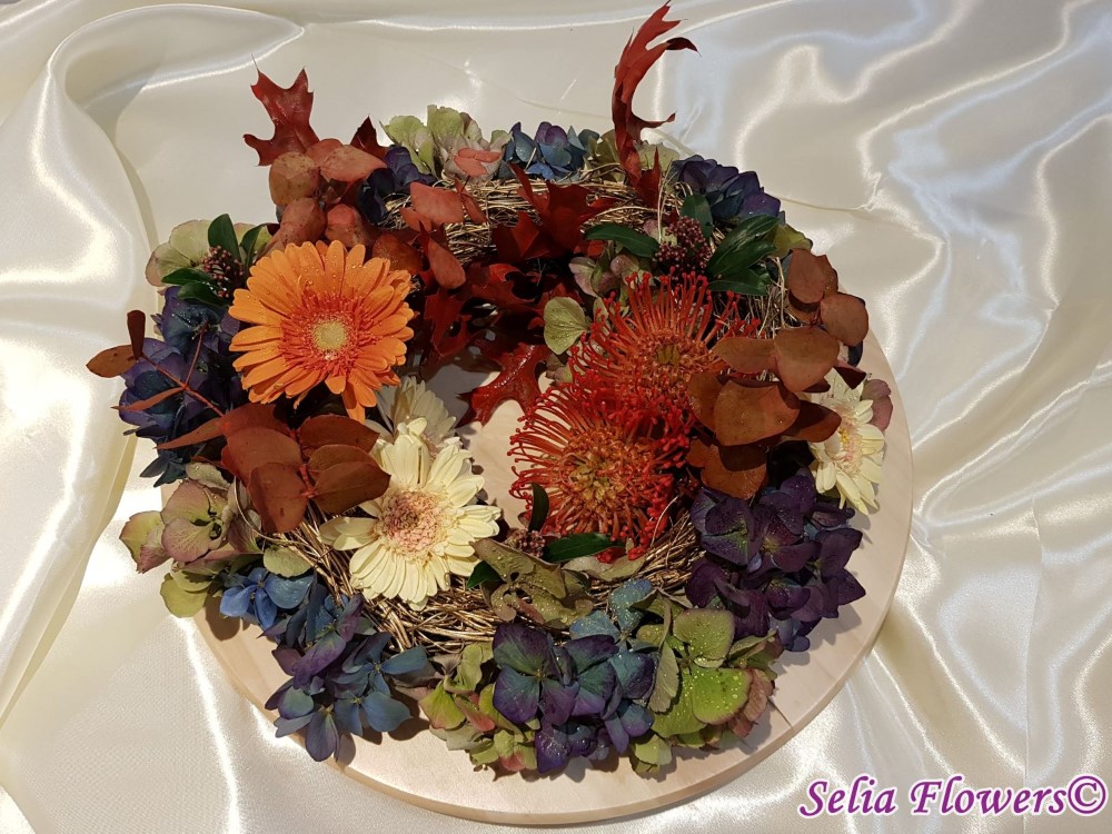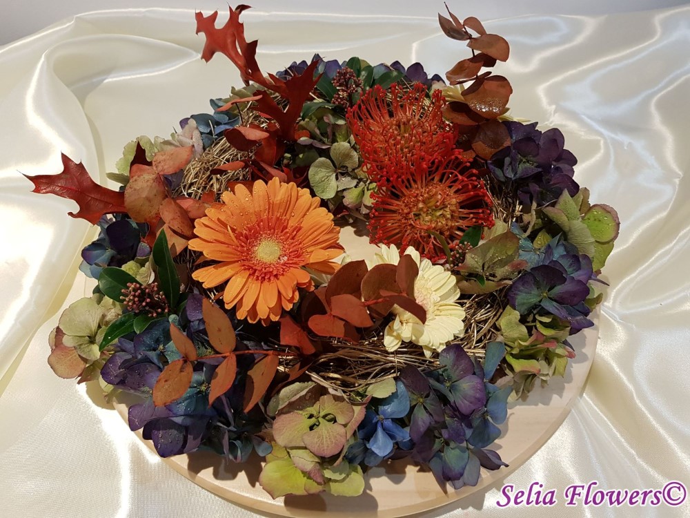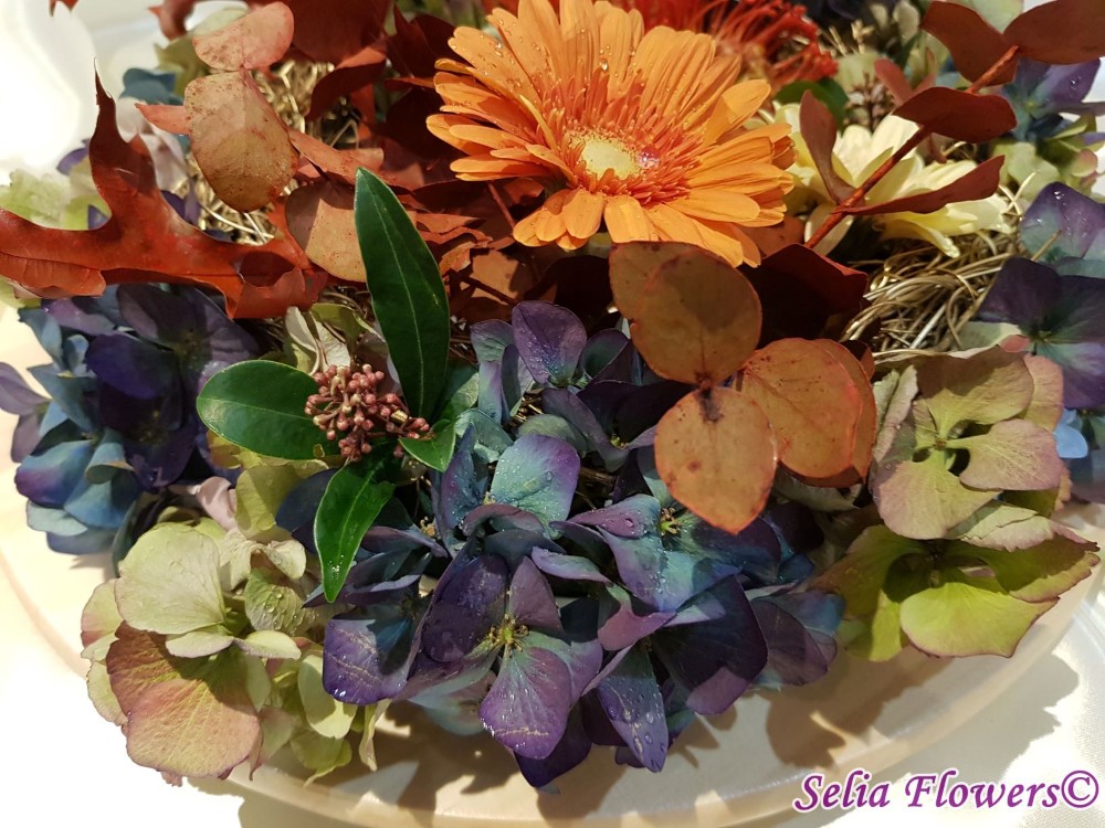 Coronita de toamna 2 in 1, decorata cu flori naturale: hydrangea in doua culori, leucospermum, germinis, skimmia, eucalypt berry vopsit, frunze vopsite de artar.