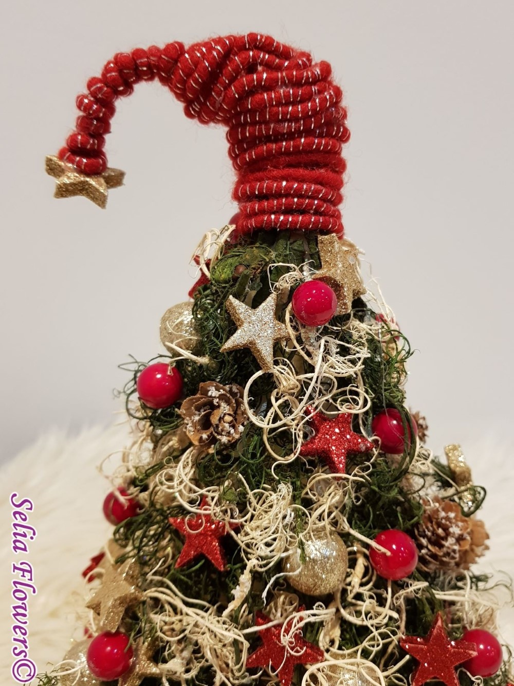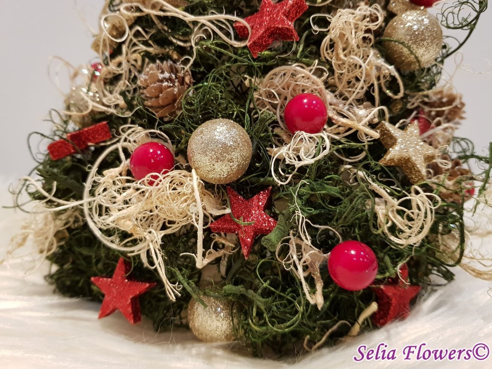 Bradut stilizat handmade, realizat din muschi cret uscat, conuri, lana si decoratiuni de sezon.