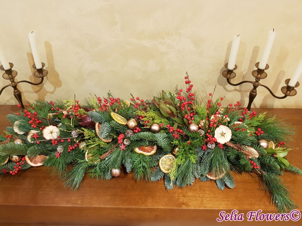 Este foarte potrivit ca decor pentru masa festiva de Craciun sau comoda din livingul tau. Lungimea aranjamentului este de aproximativ un metru .
