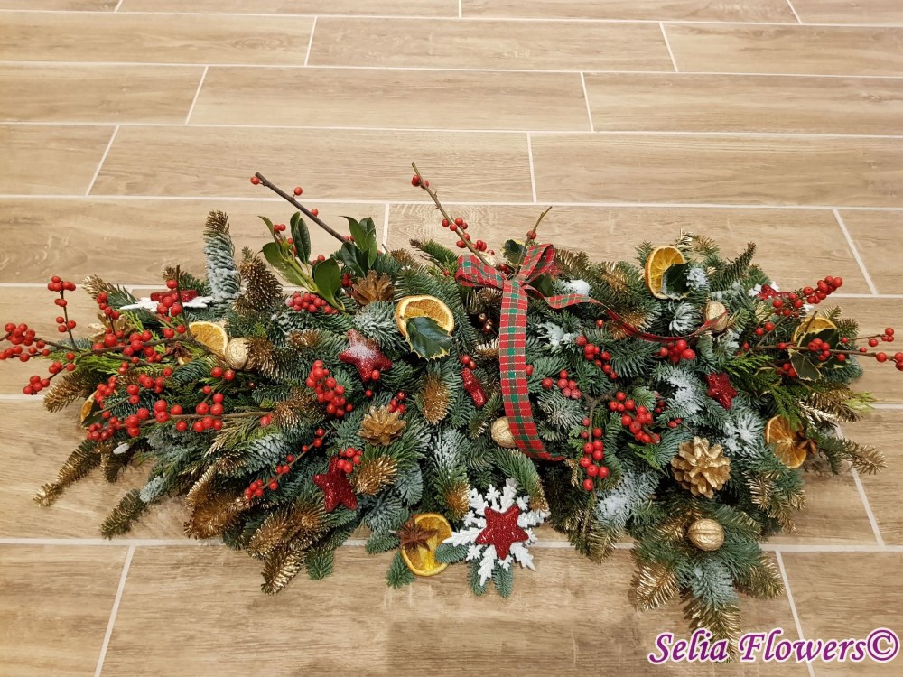 Aranjament construit sub forma unei ghirlande din brad argintiu natural, tuia, ilex, conuri de brad, nuci, portocale deshidratate si alte decoratiuni de sezon.