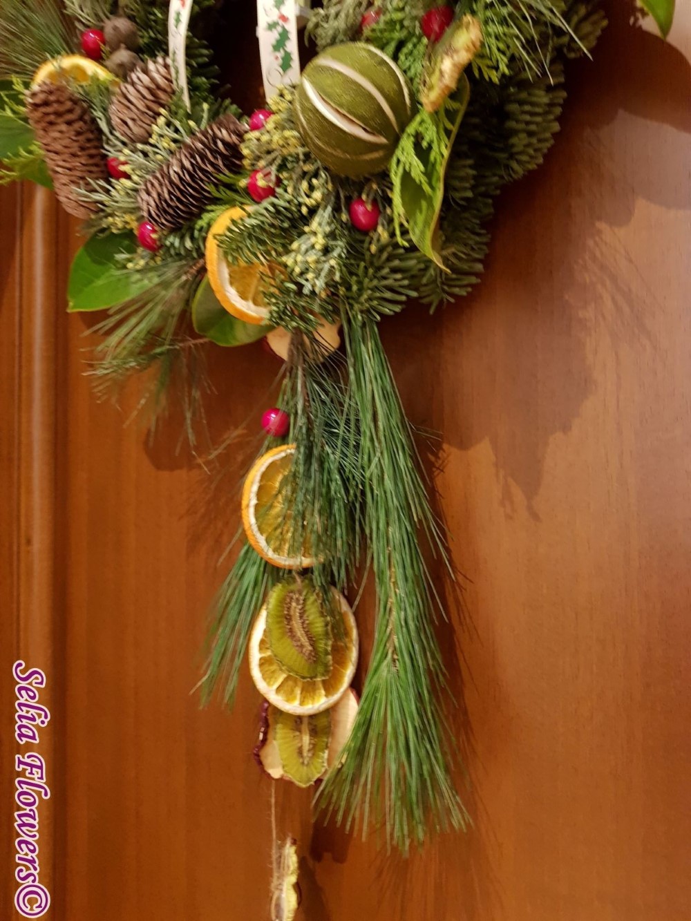 Coronita construita din mix de conifere, fructe deshidratate, conuri de brad, scortisoara, anason si alte elemente de decor. La baza este prevazuta cu doua ghirlande din fructe deshidratate.