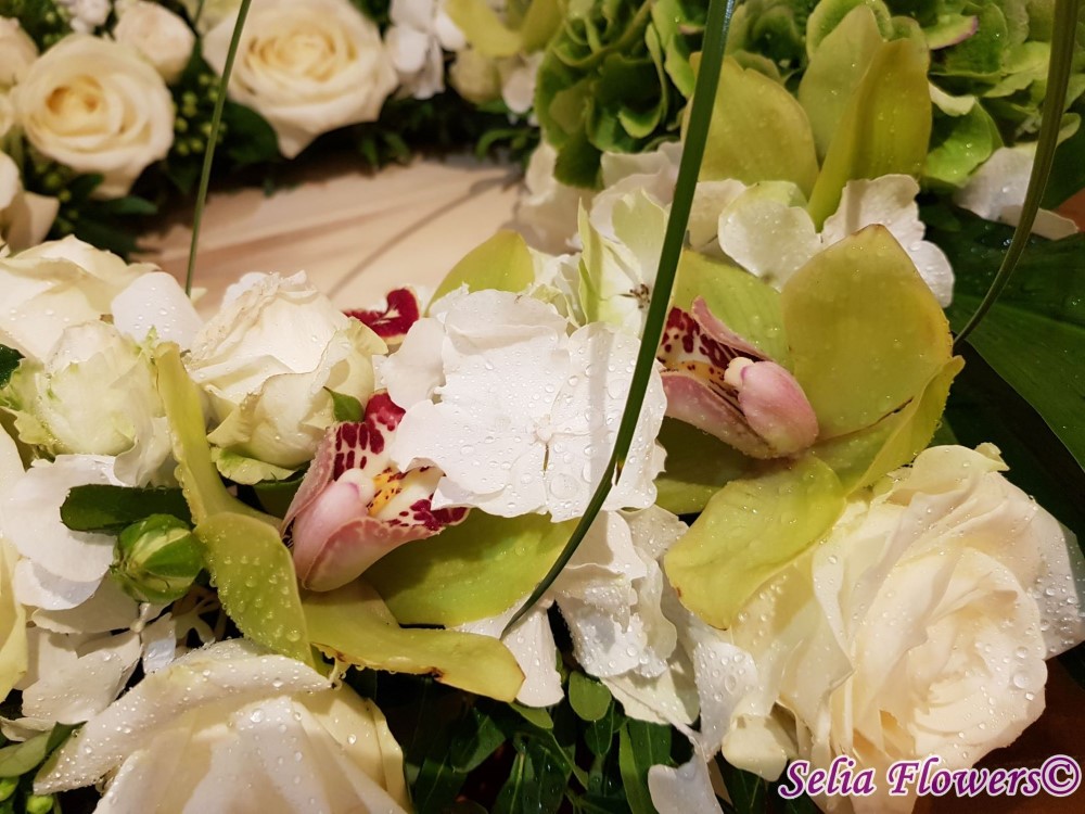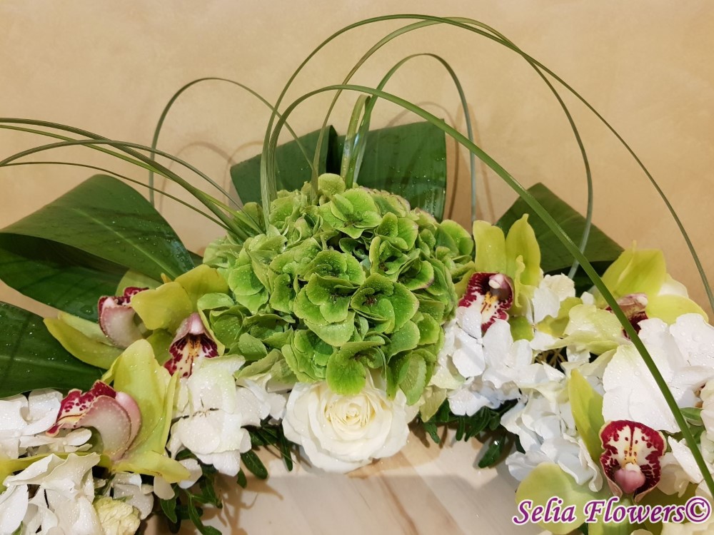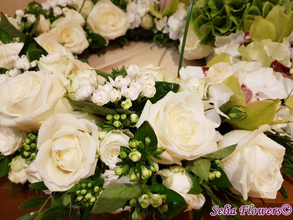 Coroana funerara moderna, cu design elegant, realizata cu trandafiri si minirose albe, hydrangea in doua culori, orhidee cymbidium in doua culori, bouvardia, aspidistra, beargrass, pistache.