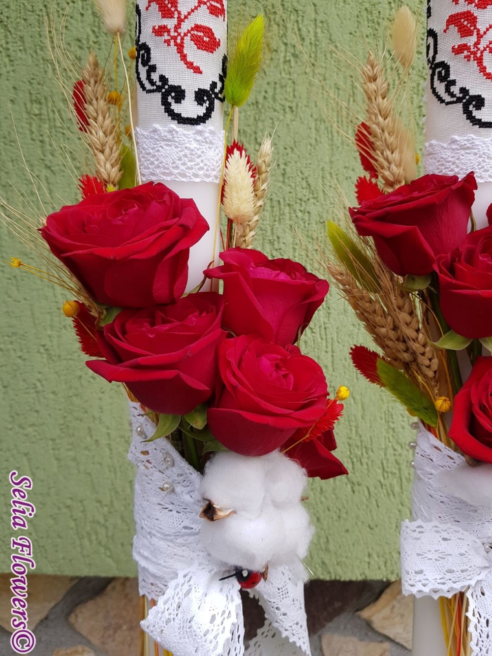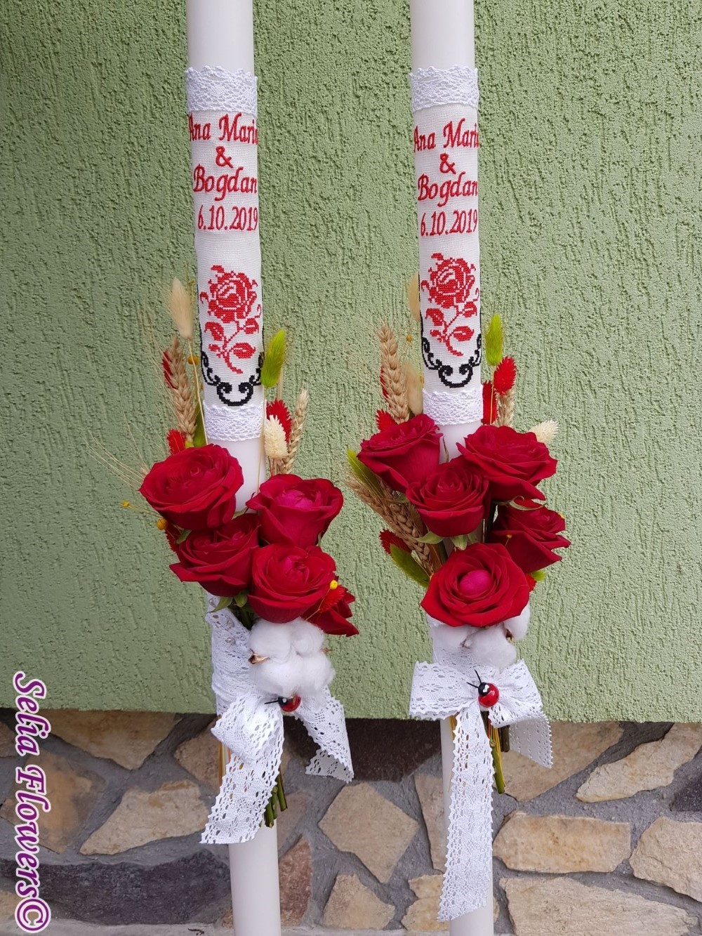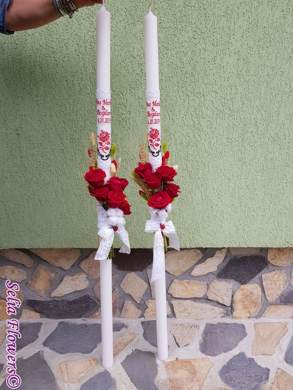 Lumânări de cununie, personalizate cu broderie cu motiv popular românesc, numele mirilor si data evenimentului. Au 120 cm inaltime si sunt decorate in stil traditional, cu: bumbac, grâu, lagurus și tallaris in mai multe culori si trandafiri Red Naomi. Sunt finisate cu dantelă albă din bumbac.