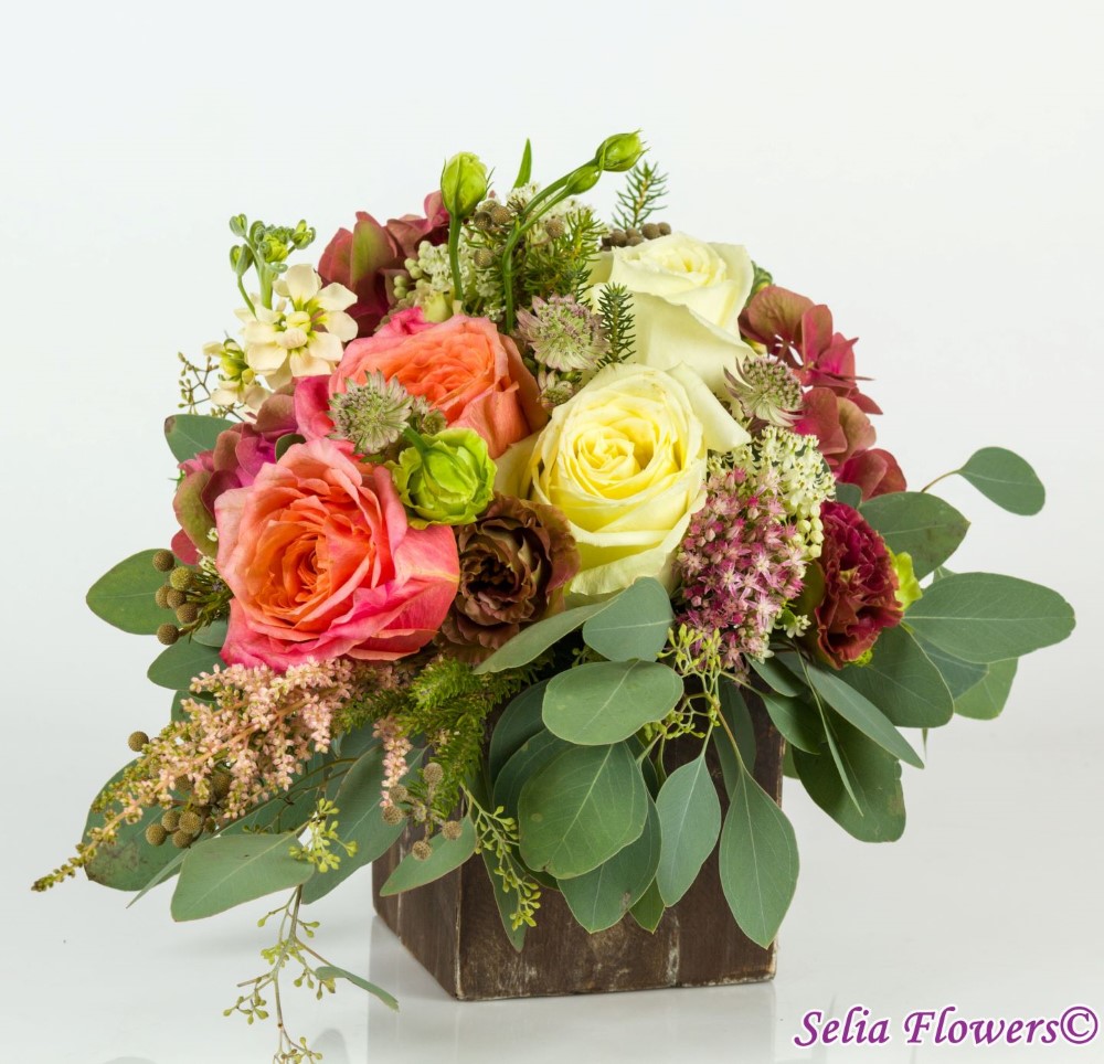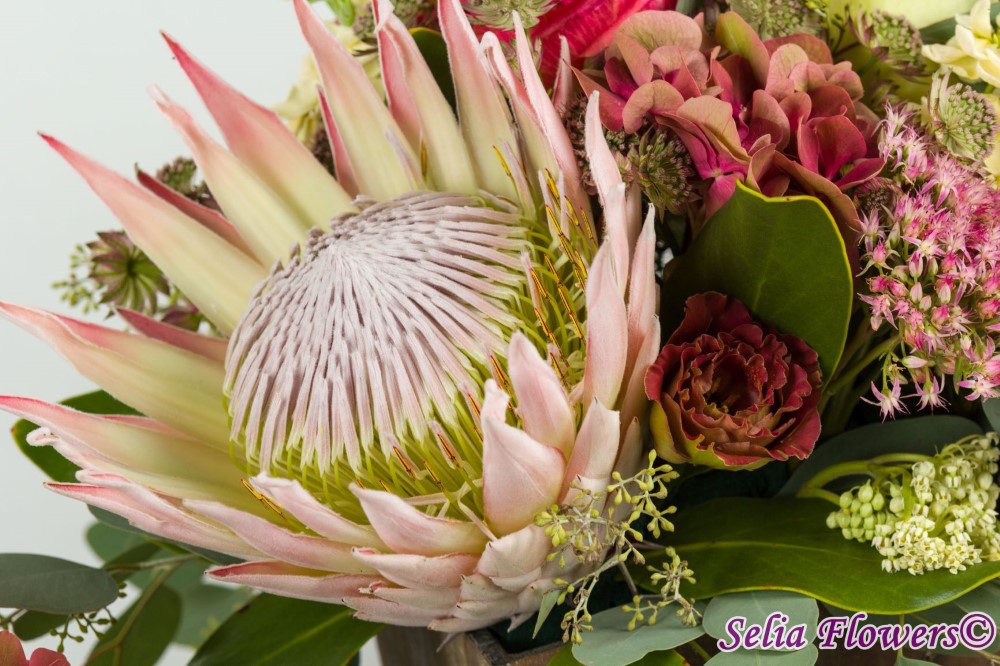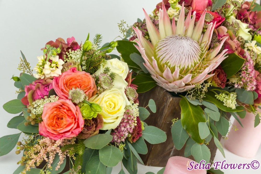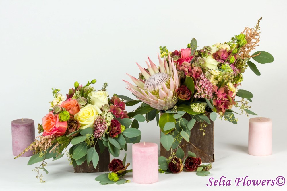 Compozitie: protea, hydrangea, trandafiri, astrantia, lisianthus, sedum, mathiola, astilbe, eucalypt berry. Aranjamentele sunt realizate in cutii suport din lemn . Lumanarile si cutiile nu sunt incluse in pret. Cutiile se ofera in regim de inchiriere.