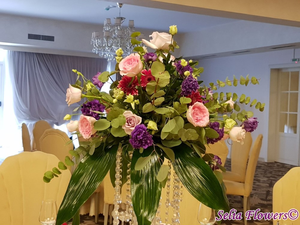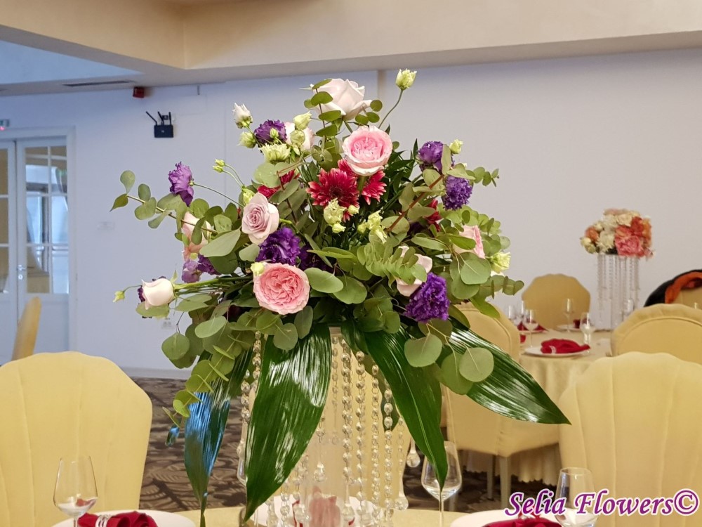 Aranjament centerpiece cu trandafiri, lisianthus, germini, eucalipt, aspidistra