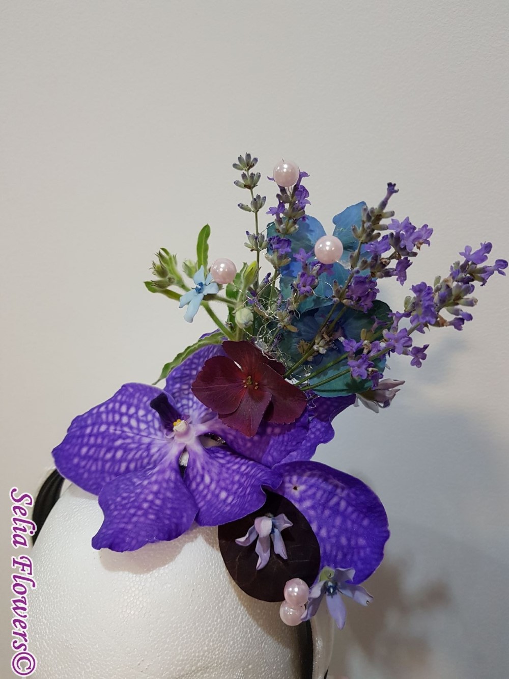 Compozitie: orhidee vanda, hydrangea in doua culori, astrantia, oxypetalum, lavanda si flori de clematis