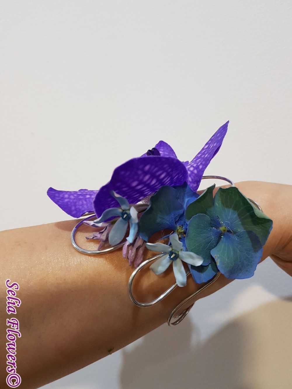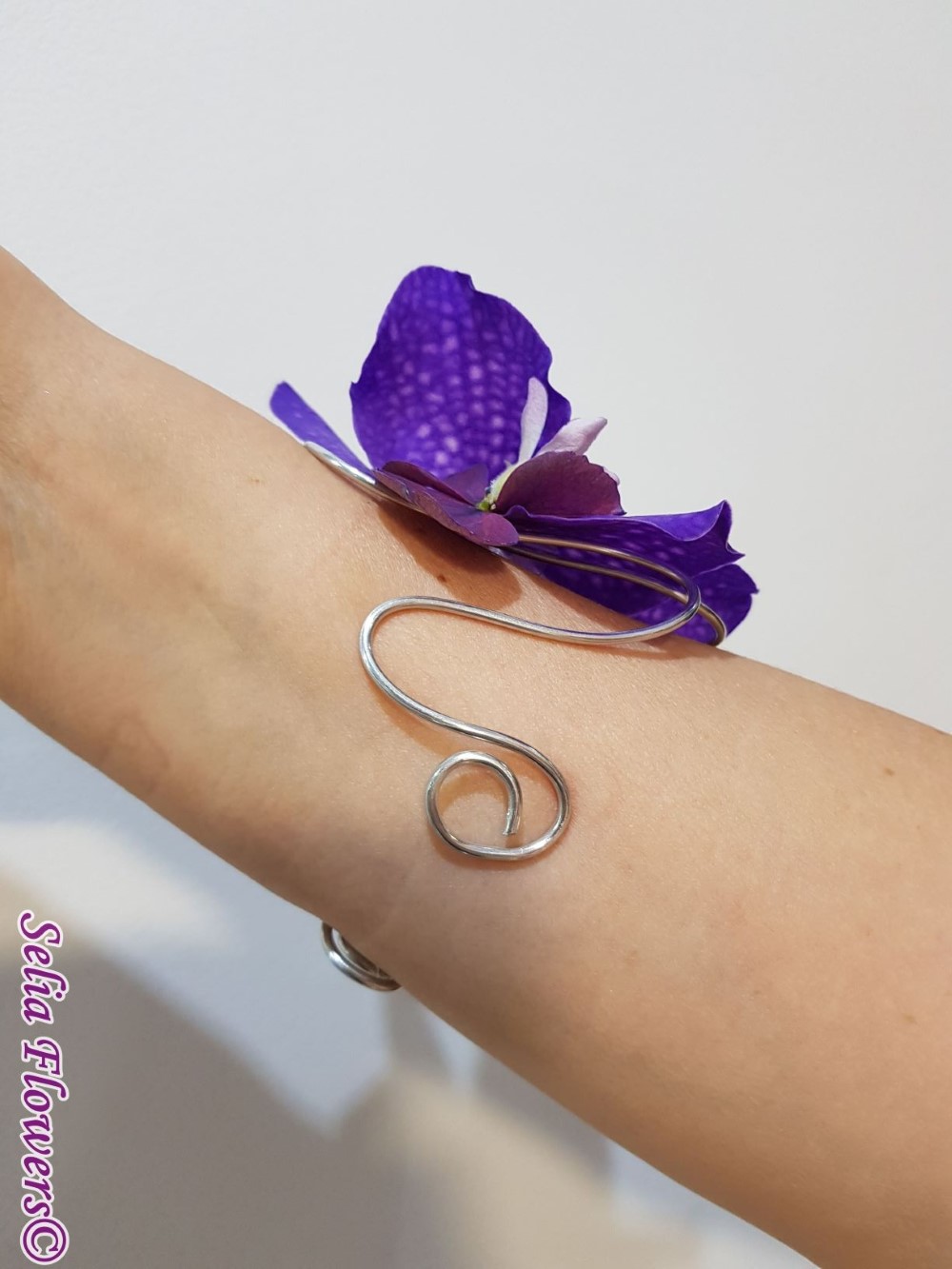 Bratara este construita cu orhidee vanda, hydrangea si oxypetalum, pe o baza din sarma decorativa din aluminiu.