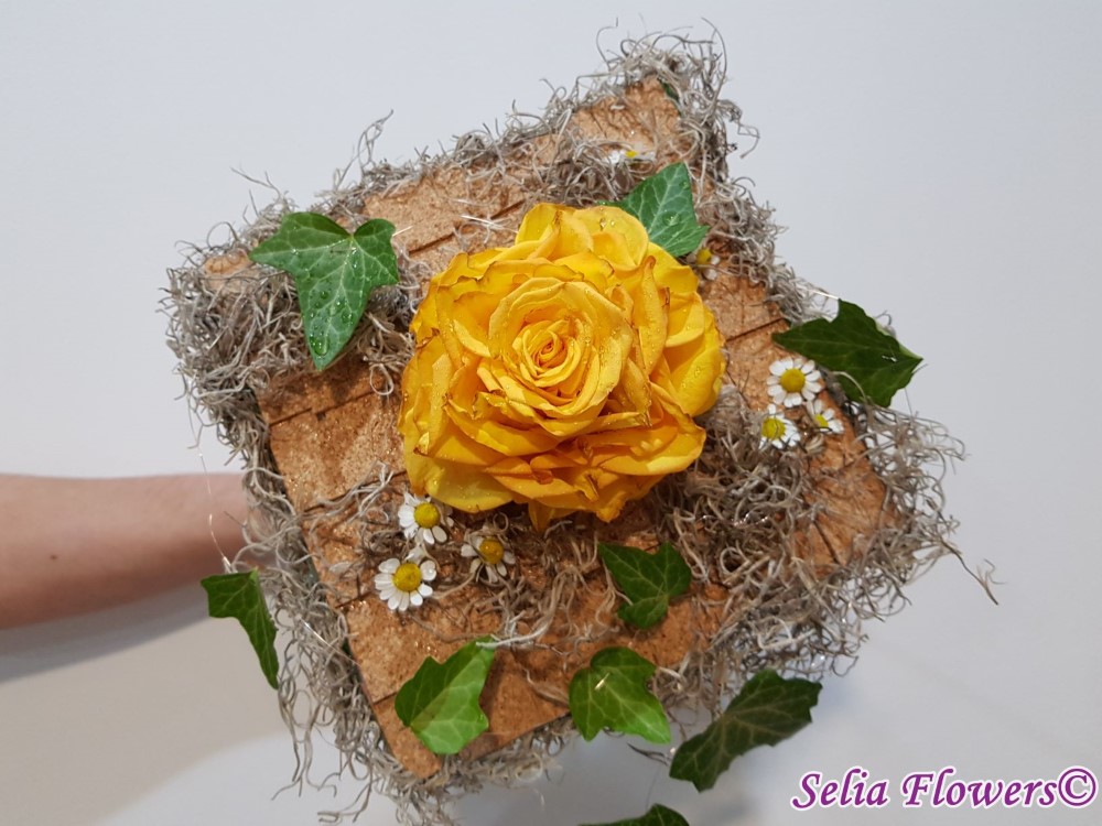 Un buchet construit pe inaltime, baza fiind o structura lucrata cu bronzenet, fire de sarma decorativa, fetru, tillandsia si pluta. Este accesorizat cu o ghirlanda din frunze de iedera si flori de matricaria. Inaltimea trandafirului rezultat, 12 cm. Latura structurii, 25-27 cm.
