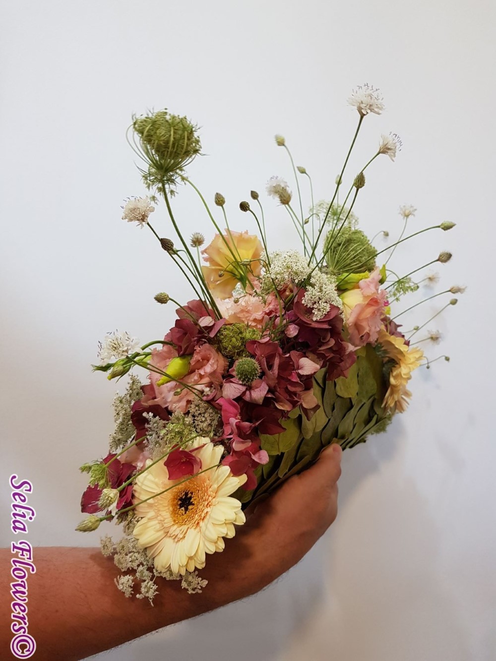 Compozitie: : hydrangea, eustoma, lisianthus, plante din flora spontana.