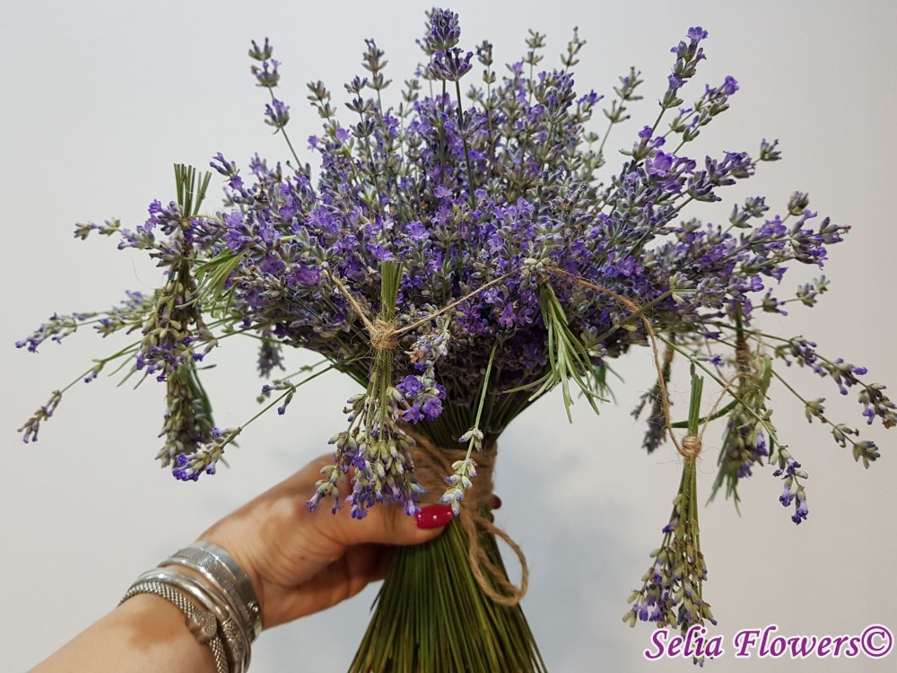 Simplu, dar elegant, un buchet construit pe structura, din flori de lavanda, floarea ideala pentru nunti rustice, organizate in aer liber. Are un parfum natural de neegalat si este accesorizat cu ghirlanda din buchetele de lavanda.