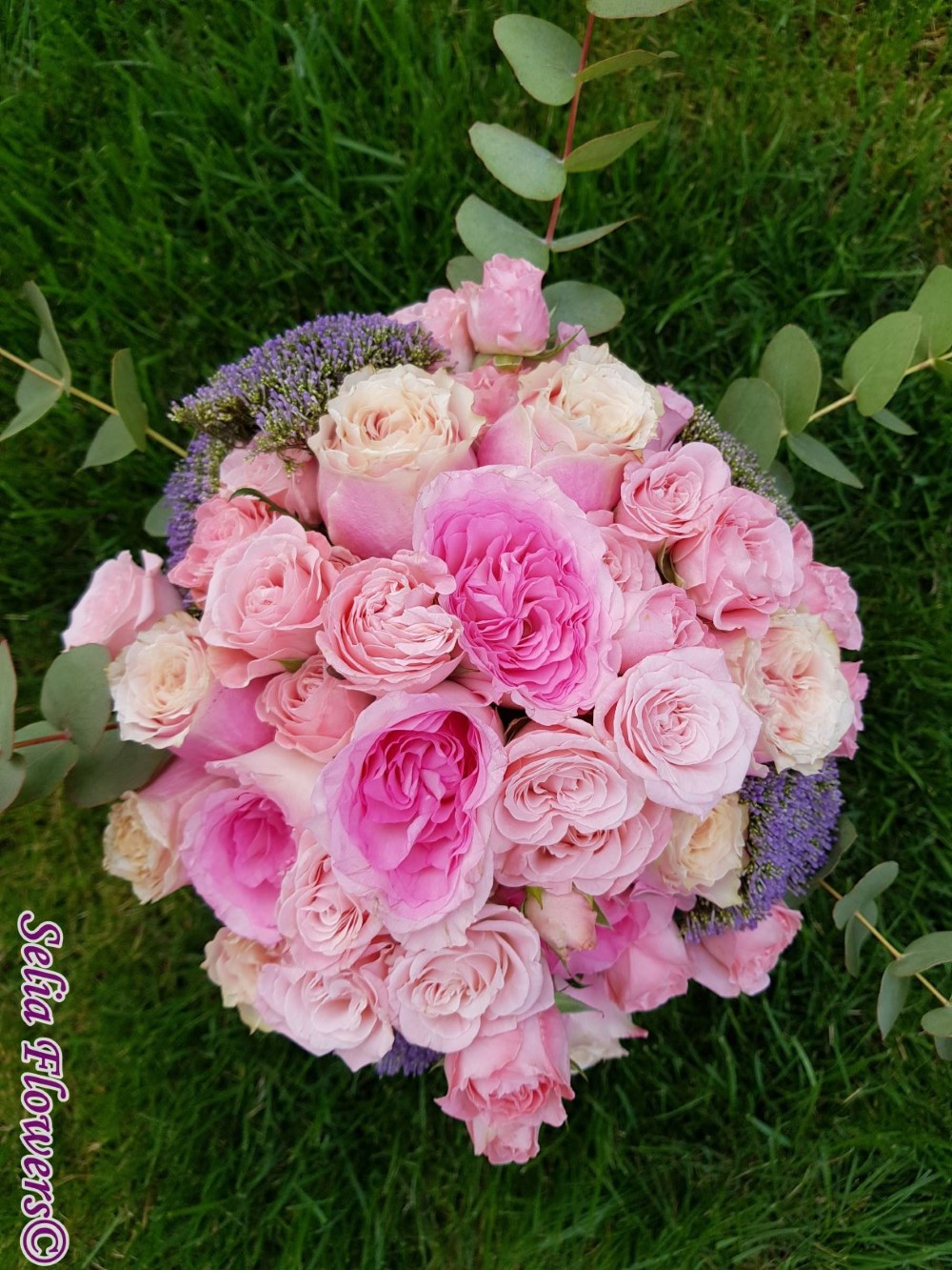 Compozitie: trandafiri Madame Bombastic spray, trandafiri Helen of Troy si spray Yustine (tros), trachelium, eucalypt