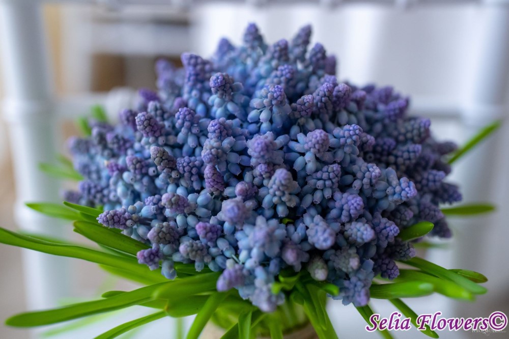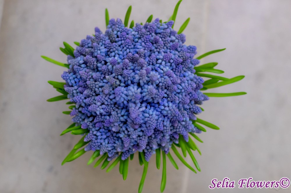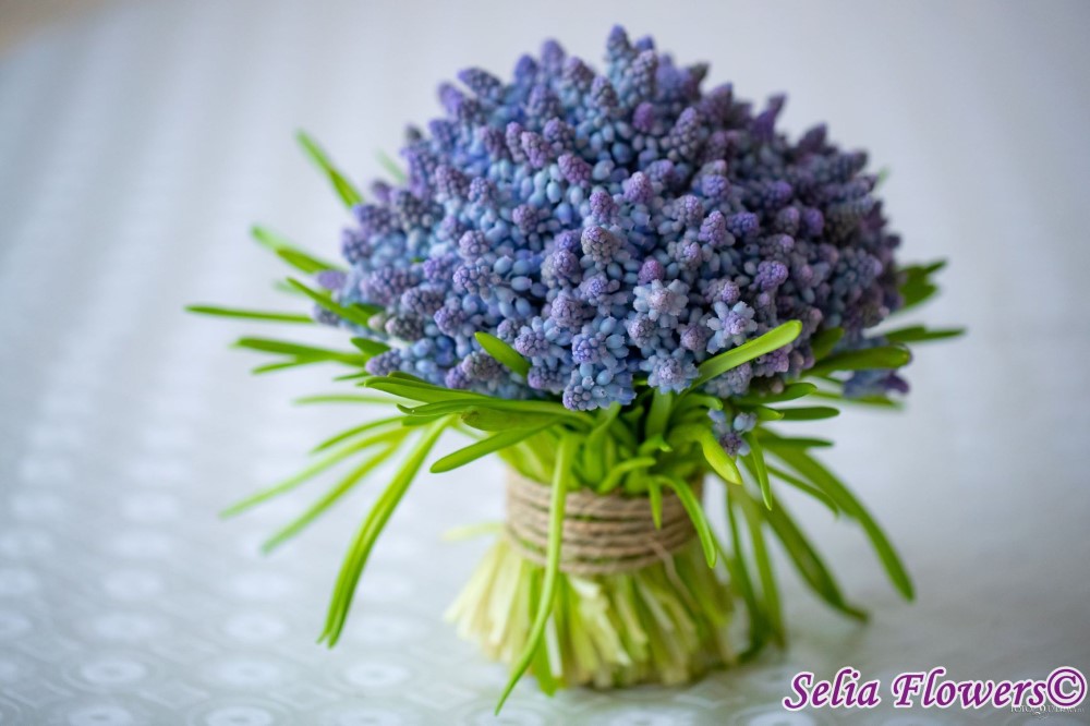 Un buchet delicat, intr-o nuanta splendida de albastru indigo, realizat din aproximativ 150 de fire de muscari sau “zambila struguras” cum i se mai spune. Inflorescenta lor seamana atat cu o zambila, cat si cu un struguras, daca firul este intors invers.