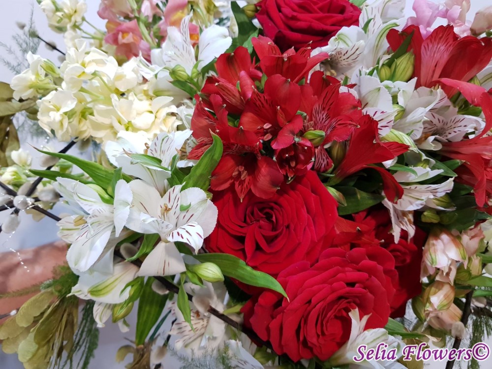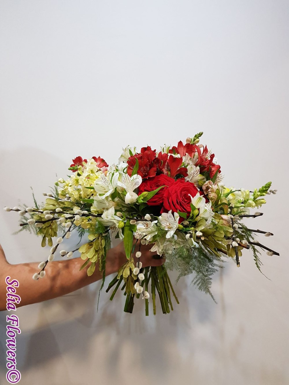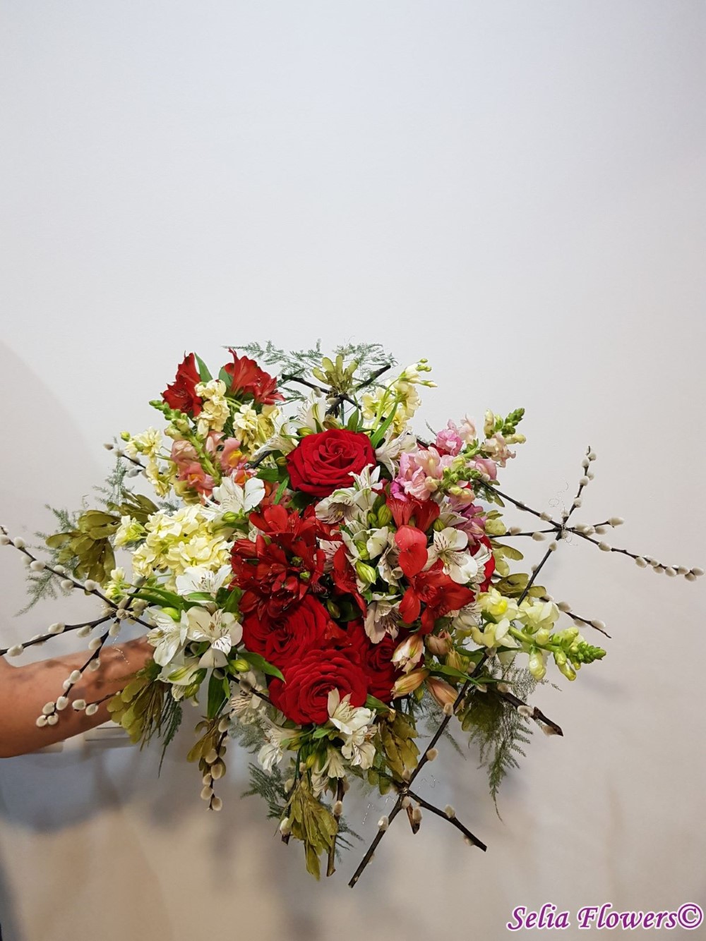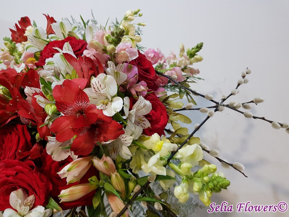 Culoare si parfum intr-un buchet expresiv, construit pe structura de sarma si salix, cu trandafiri, mathiola, alstroemeria, crengute de asparagus.