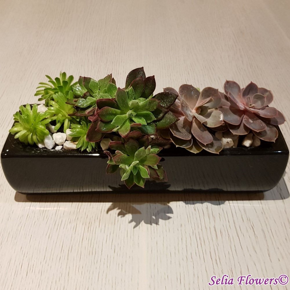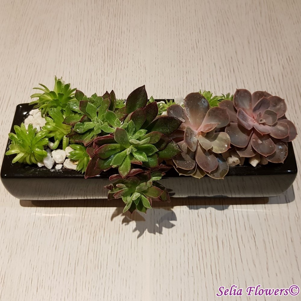 O gradina vesela in miniatura construita intr-un vas elegant din ceramica dintr-un mix de plante suculente. Aranjamentul este decorat cu pietricele de marmura decorativa. Este un aranjament vesel, decorativ si deloc pretentios. Daca adori calatoriile sau esti plecat mai mult timp de acasa, reprezinta florile ideale, deoarece rezista destul de mult timp fara sa fie udate.